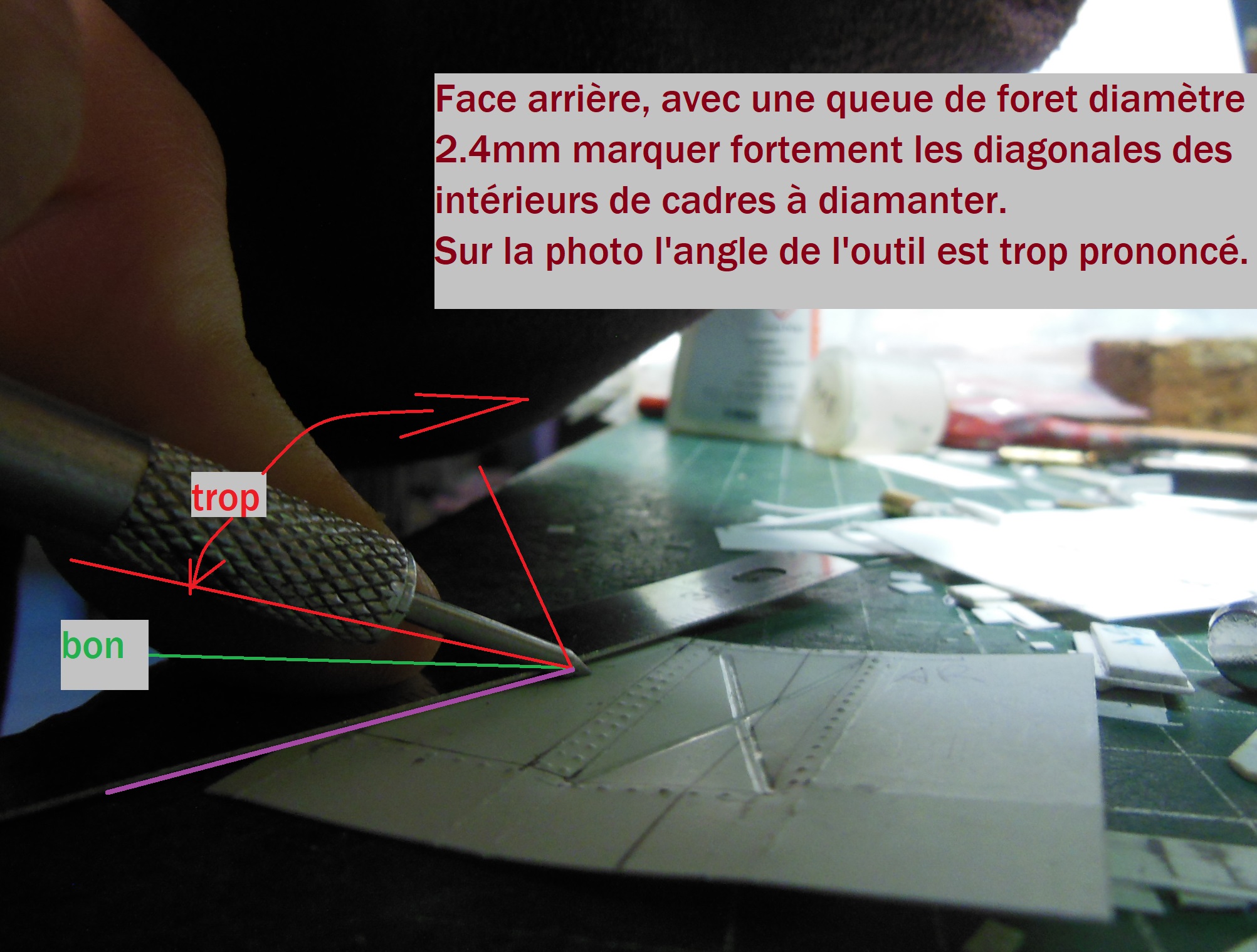 et sur la face arrière, avec une ex queue de foret de 0.5mm je marque par l'arrondi de l'âme les "X" de l'intérieur du diamant à réaliser. J'ai fait deux photos, car pas facile de tenir d'une main l'APN et des deux autres le matériel