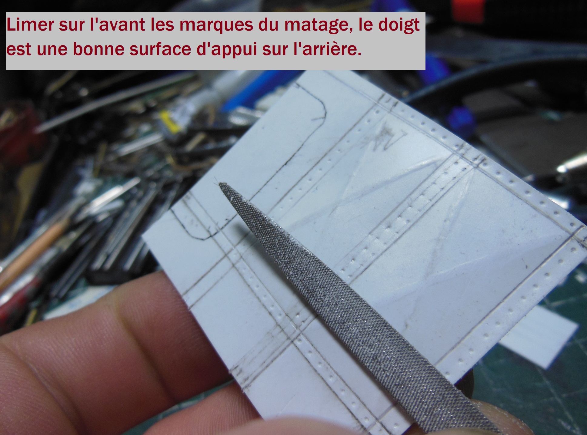 Sur la face avant, j'élimine les traces de la martyrisation du plastique à la lime. il est possible après cette opération de redonner un peu de volume au diamant en glissant l'ongle dans les nervures du X , ne serait ce que pour égaliser les deux portes.