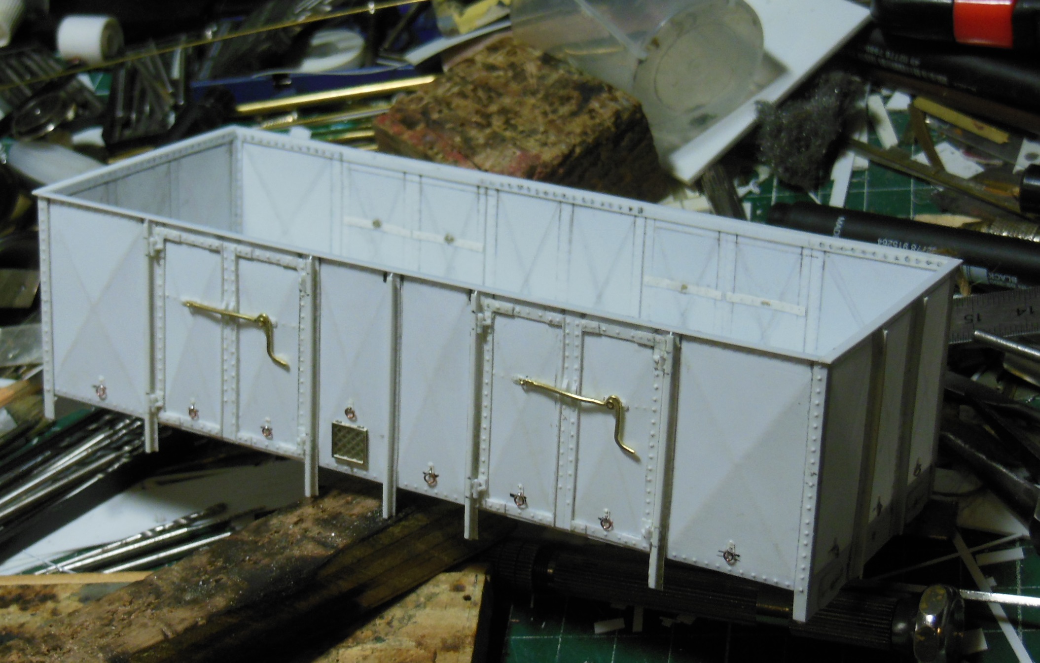 puis pose des renforts médians en intérieur de caisse (positionnés par transparence), un peu de laiton pour les barres de fermetures, utilisation de grilles à étiquettes DJFR issues du rab de photogravure sur la planche d'un plat PLM, et les anneaux sont fixes en cuivre.