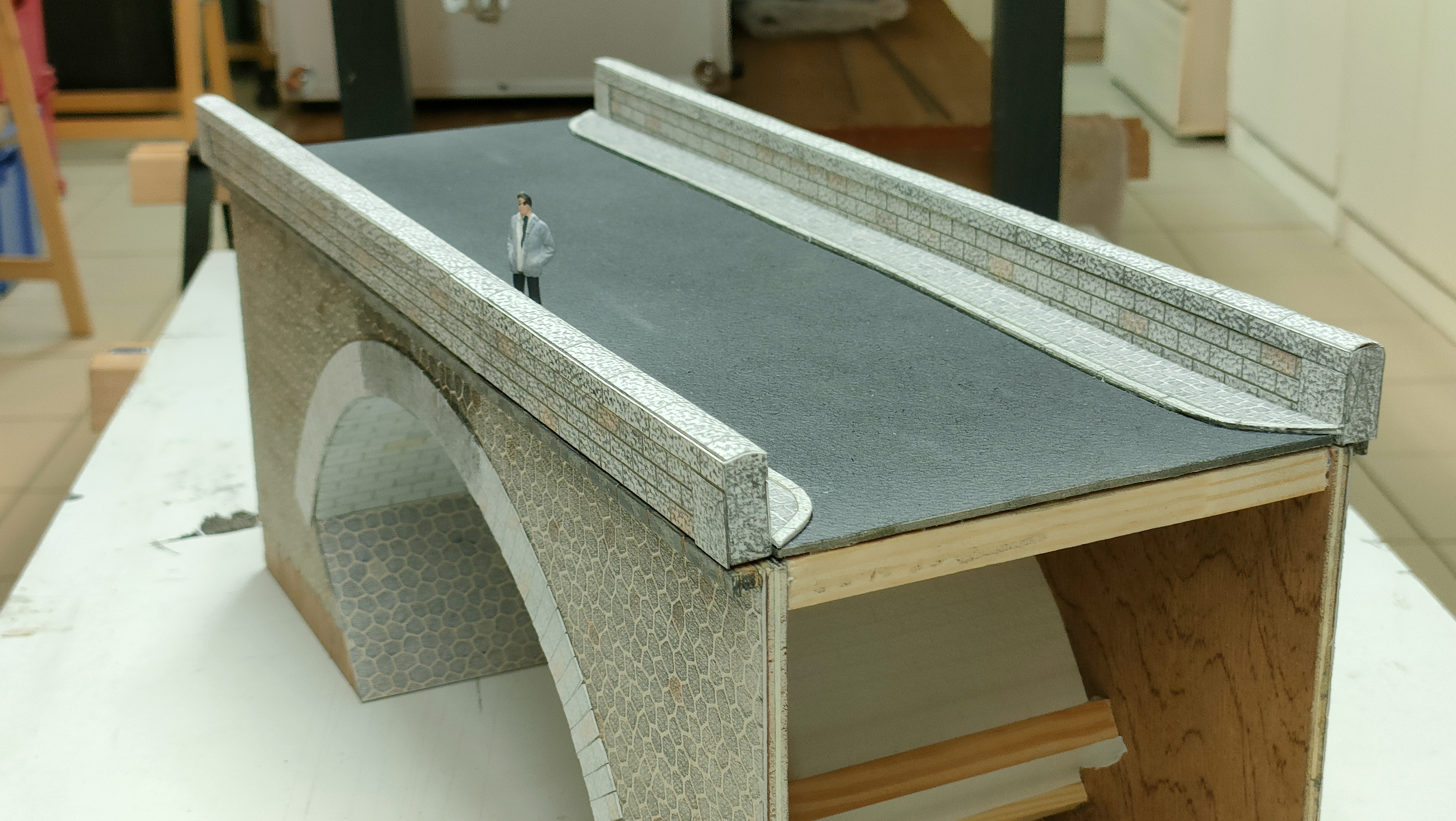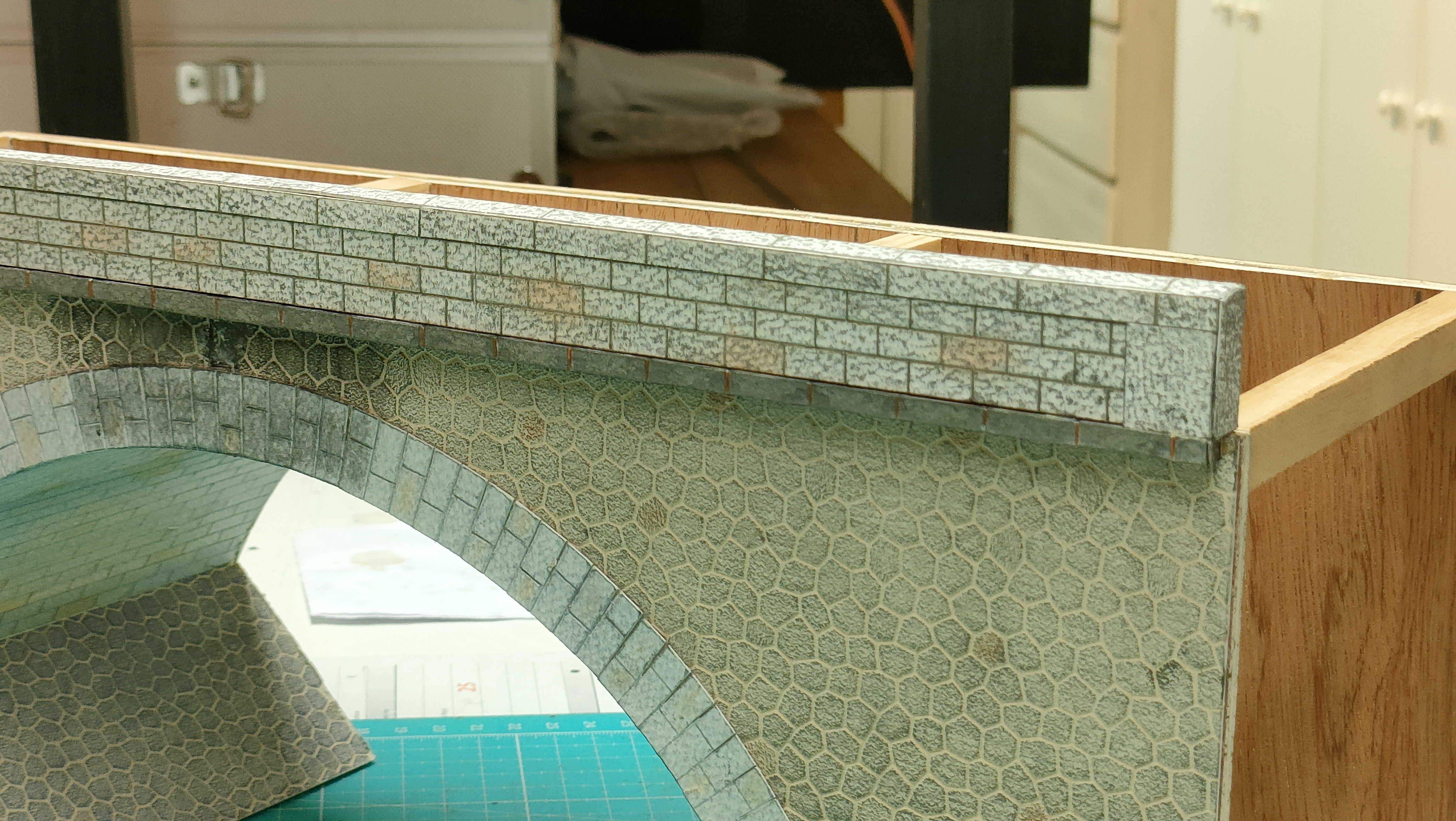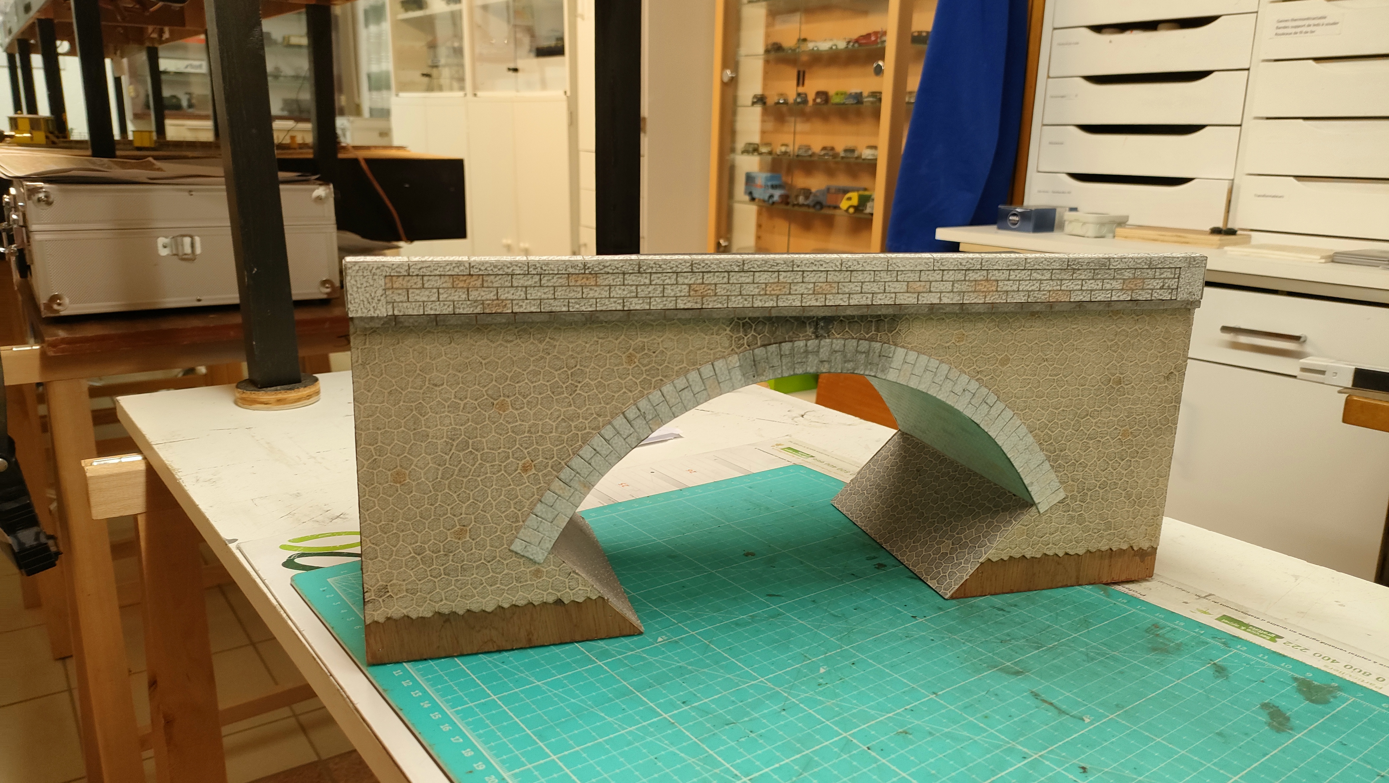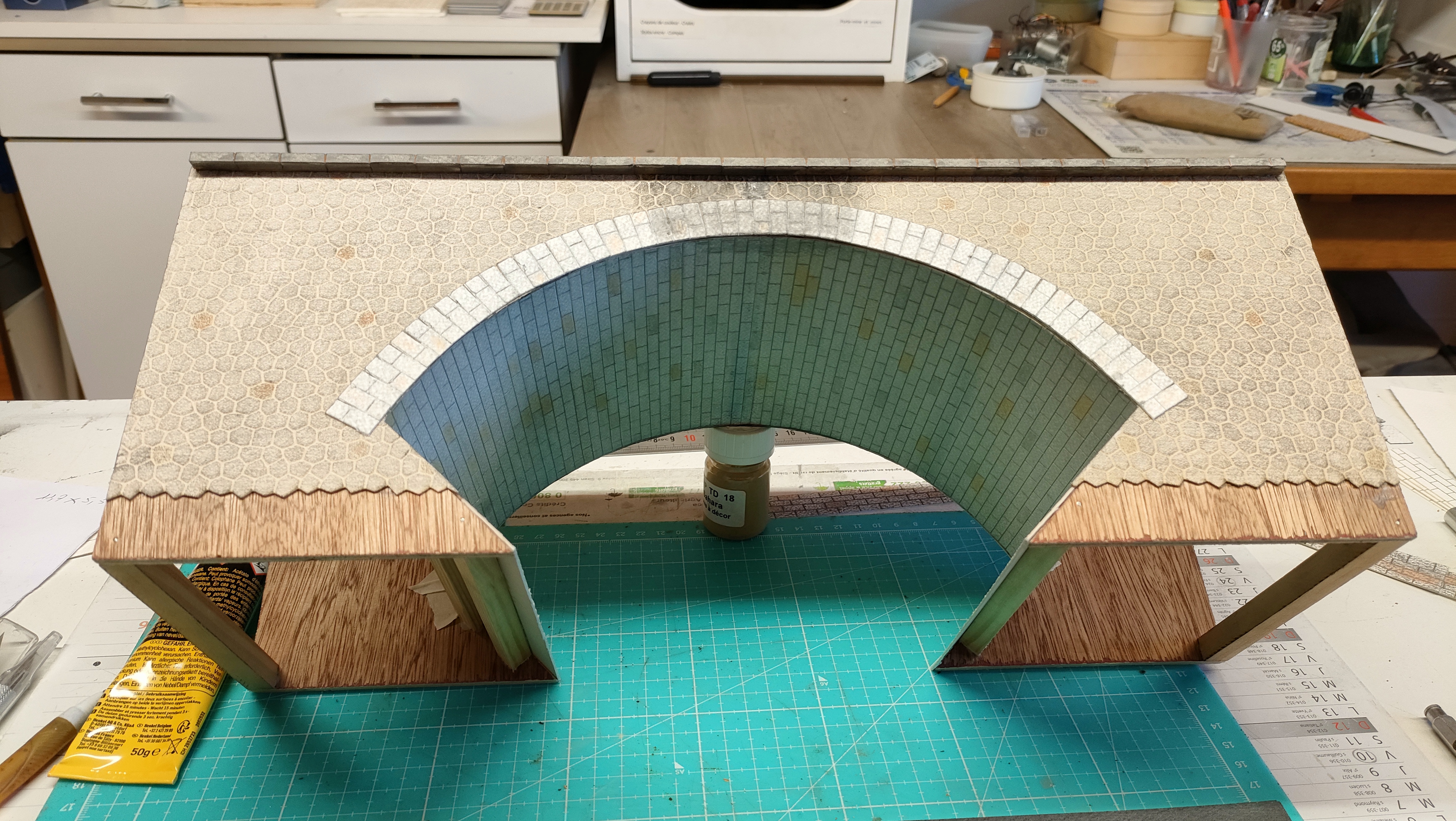 Donc pour revenir sur mon chantier, je réalise ce pont en contreplaqué de 5 mm, les pierres hexagonales sont de chez Décapod, les pierres de taille sous la voute ont été réalisées sur Excel, les joints gravés à la pointe à tracer. Les pierres des arcades sont elles aussi issues d’Excel.