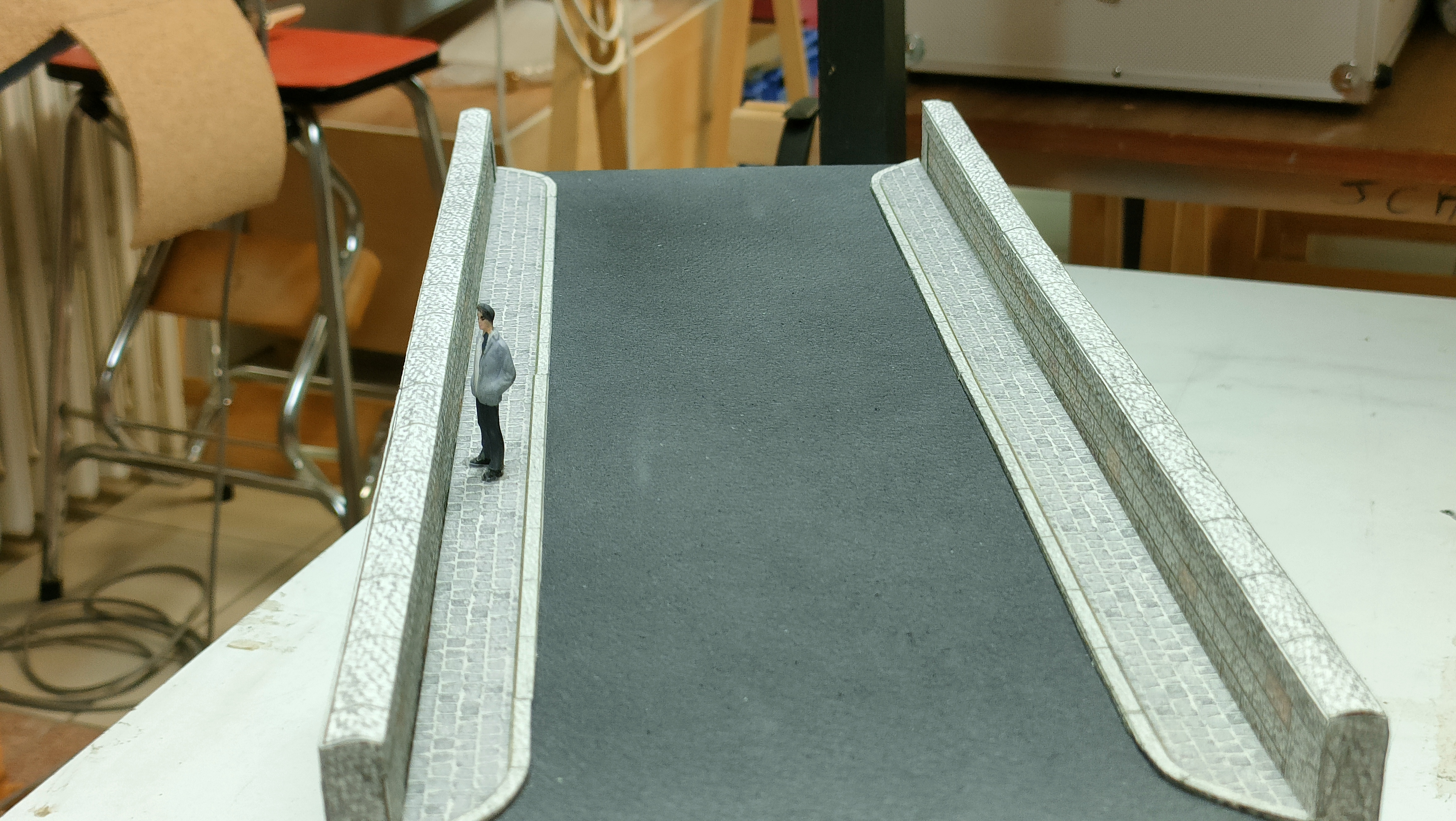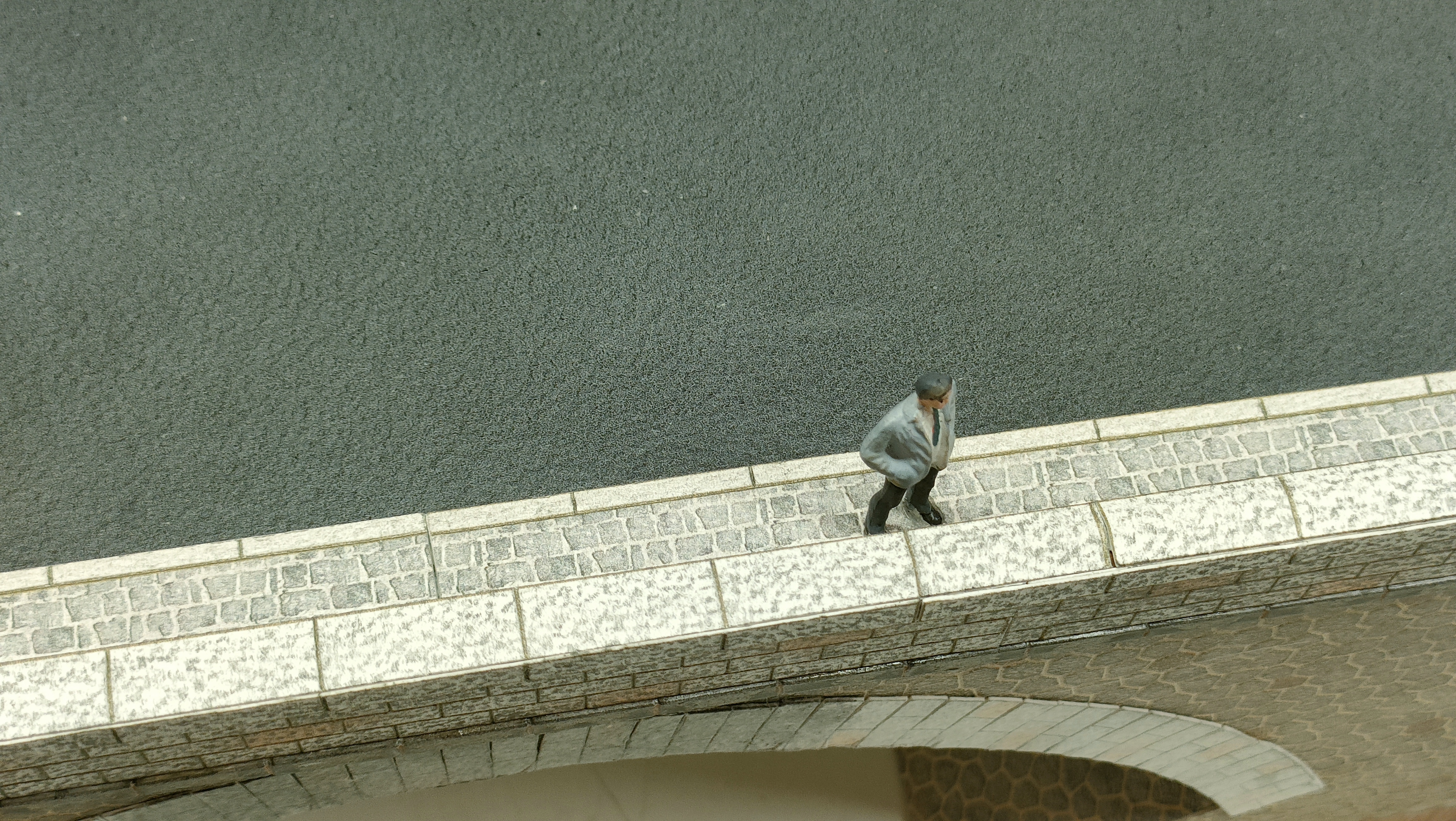 Les parapets sont réalisés en liège, l’épaisseur du parapet est de 8 mm J’ai habillé le liège avec du canson gros grains 300 gr sur lequel j’ai imprimé mes pierres, issues comme à mon habitude d’Excel. Les blocs en place sur le dessus du parapet sont légèrement bombés. Cette difficulté m’a fait réfléchir sur la façon de réaliser cet arrondi. Comme impossible n’est pas Français, j’ai augmenté légèrement la hauteur du liège et j’ai râpé les angles. J’ai habillé ensuite le dessus avec une bande imprimée de 300 gr que j’ai cintrée de façon à bien épouser la forme. Vous pouvez remarquer que certaines pierres sont rosées, cela provient que le granit a des variantes de couleur, j’ai imité cette teinte avec de la craie, j’ai ensuite balayé la surface avec un pinceau à poils fins.