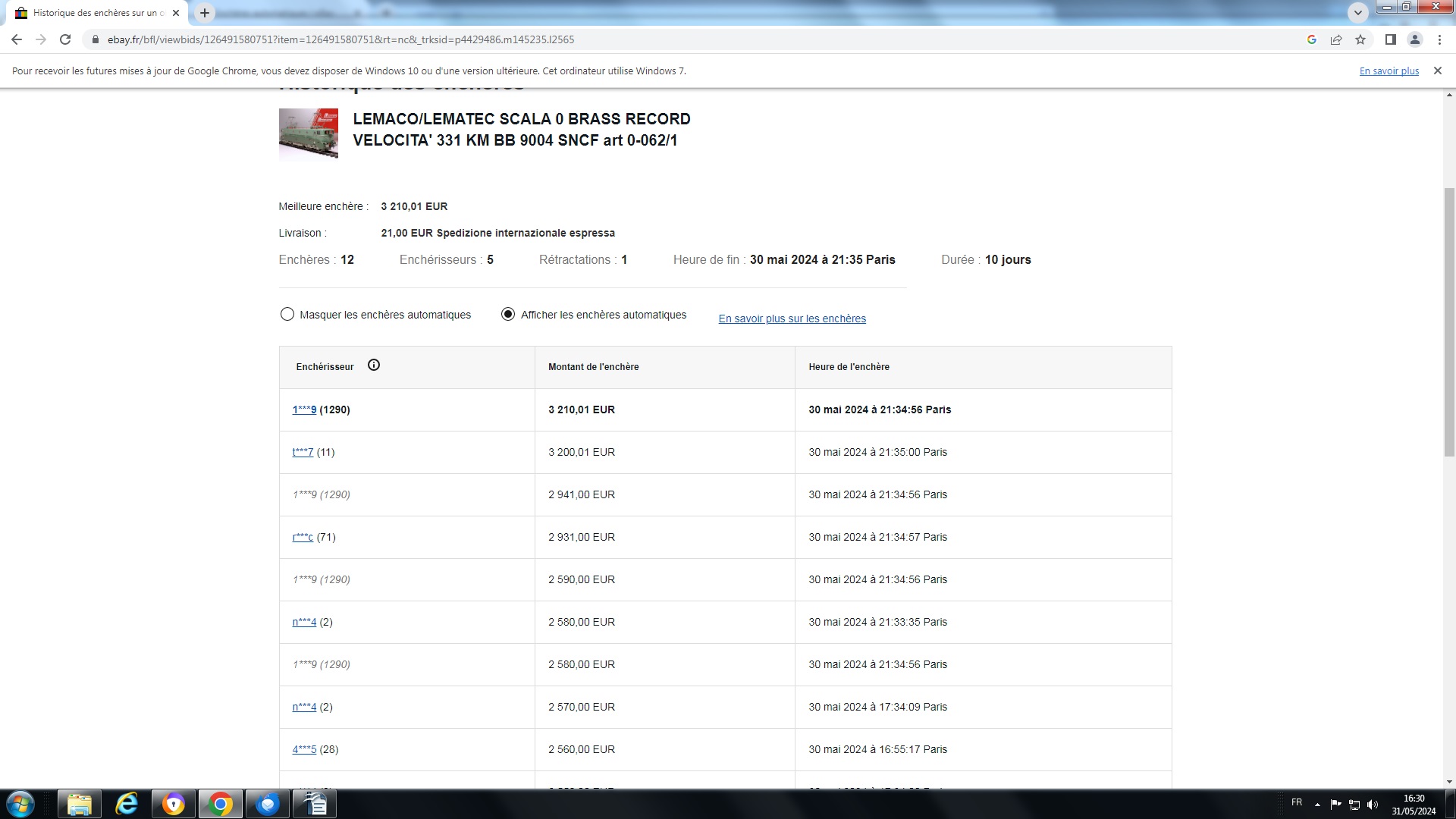 2- En photo jointe, on voit que le sniper identifié 1***9 (1290) est bien en mode d'enchères automatique (les enchères automatiques sont les lignes en italique), et qu'après 21h34 il a surenchérit (automatiquement) de 10 € à 4 reprises, 2570 ->2580, puis 2580 -> 2590, puis