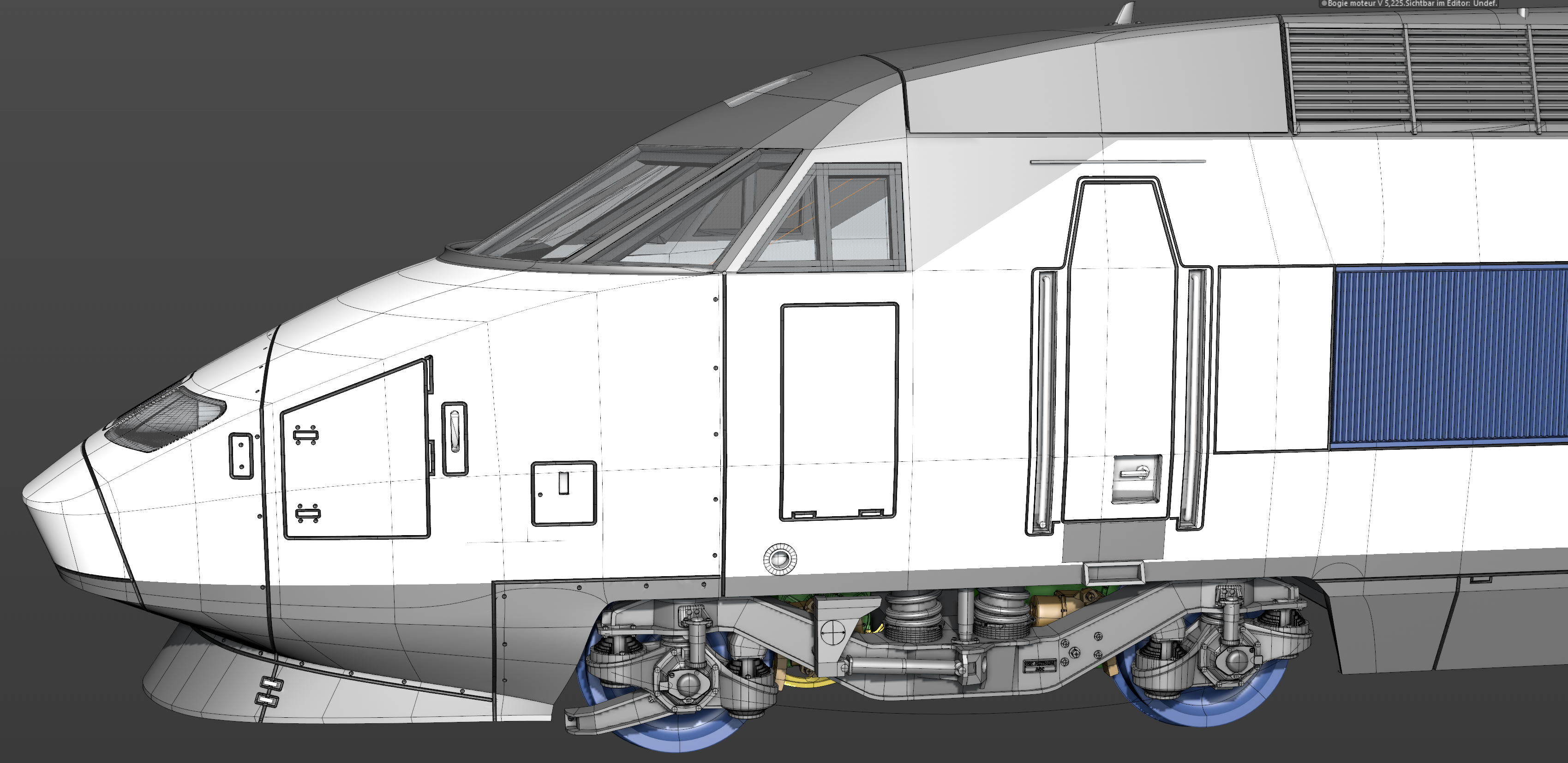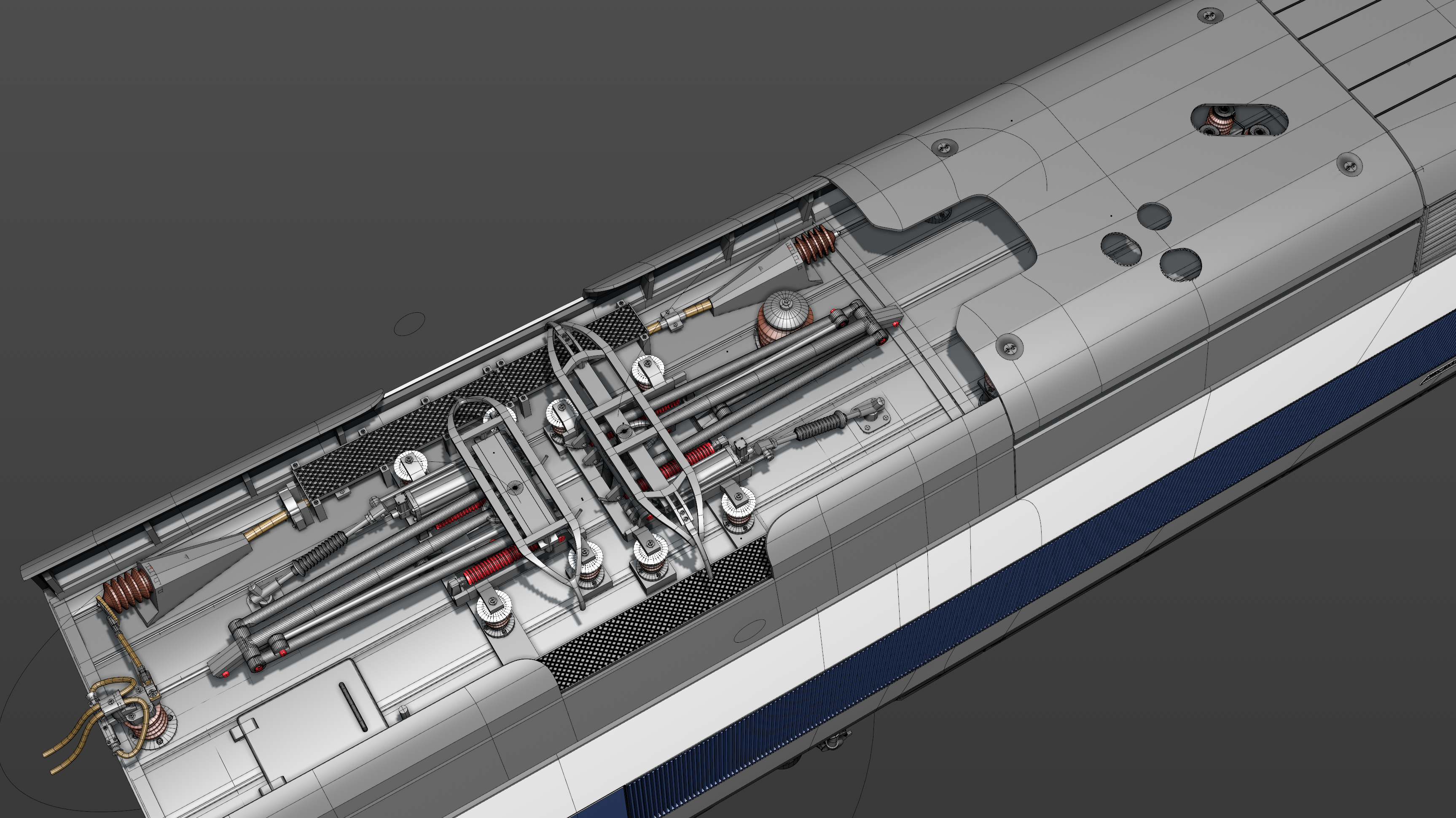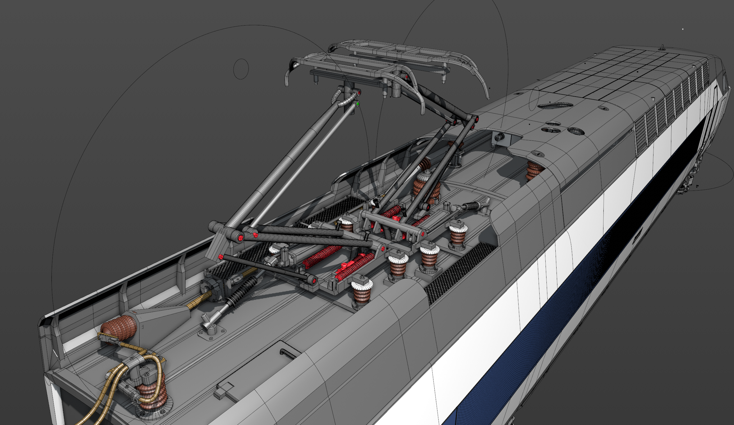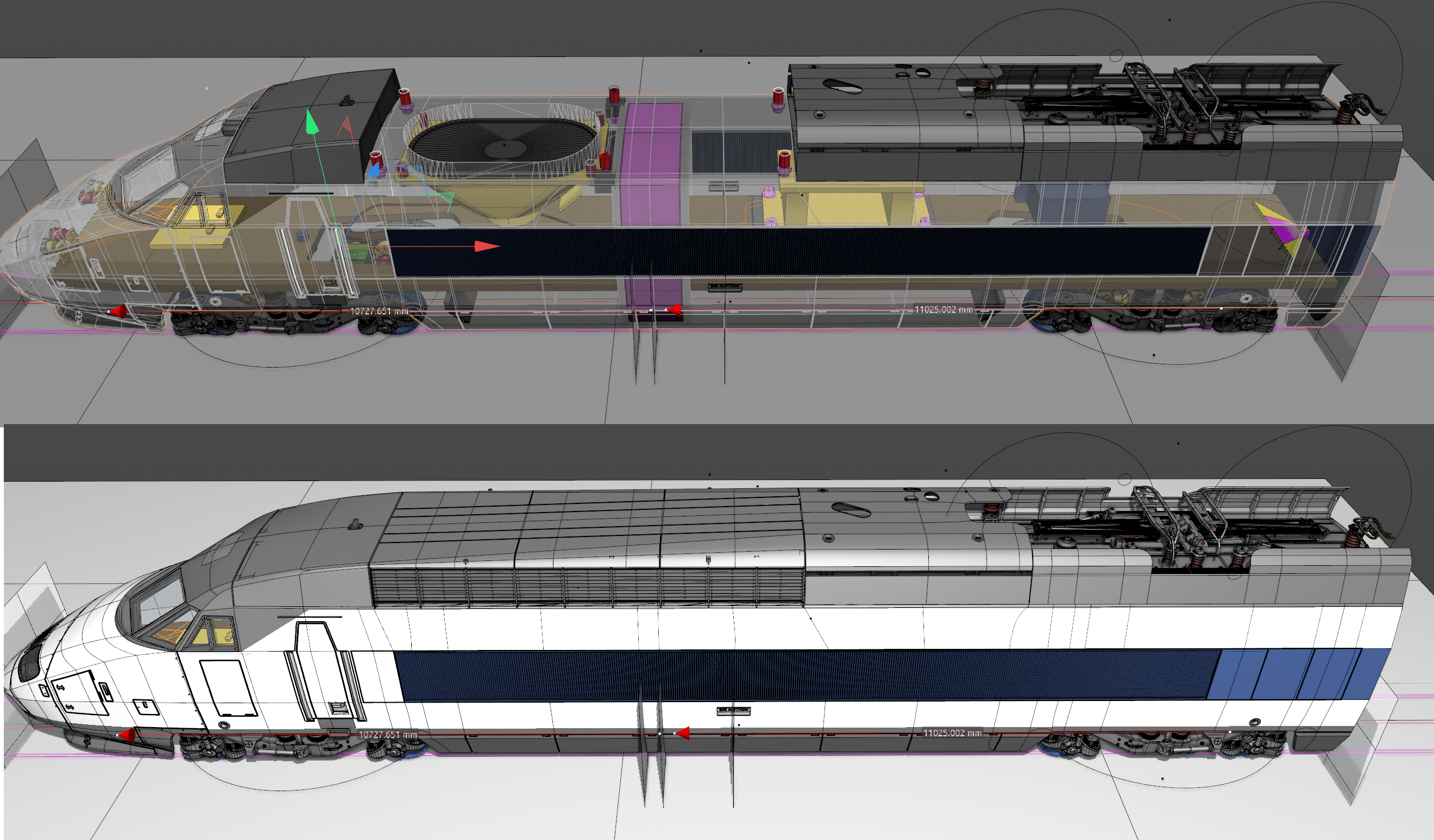 Ça va me permettre d'ajouter un tas de détails et surtout de corriger et approfondir ce que j'avais déja dessiné. Rapproché les pantos, commencé à différencier le 1,5 et le 25 kV, petite corréction du cadre porteur et des sous-structures, integration rainures du toit, trappe d'accès, corréction des carénages latéraux et des trous du capot. En même temps il a fallu ajouter des joint autours des portes et une marche pour le conducteur...bref gros chantier partout :lol: