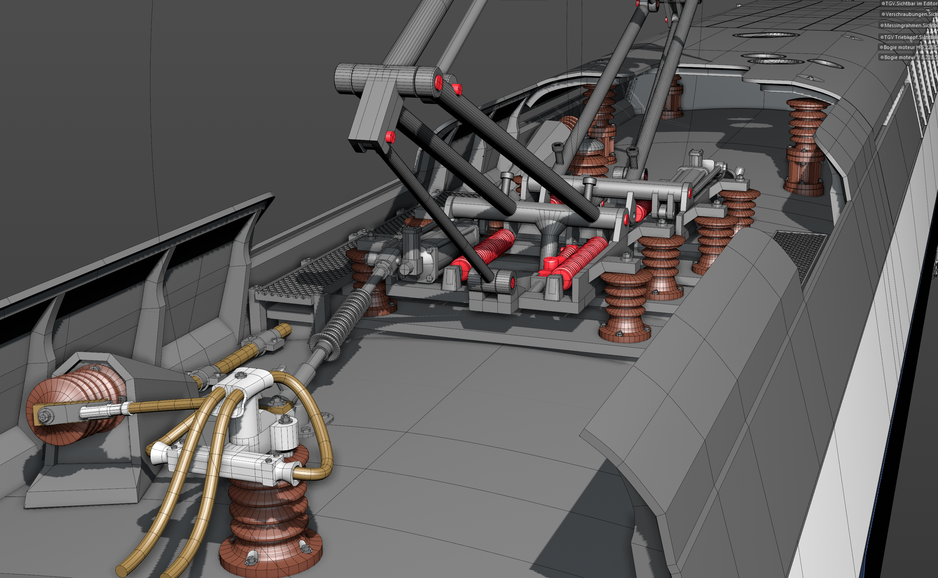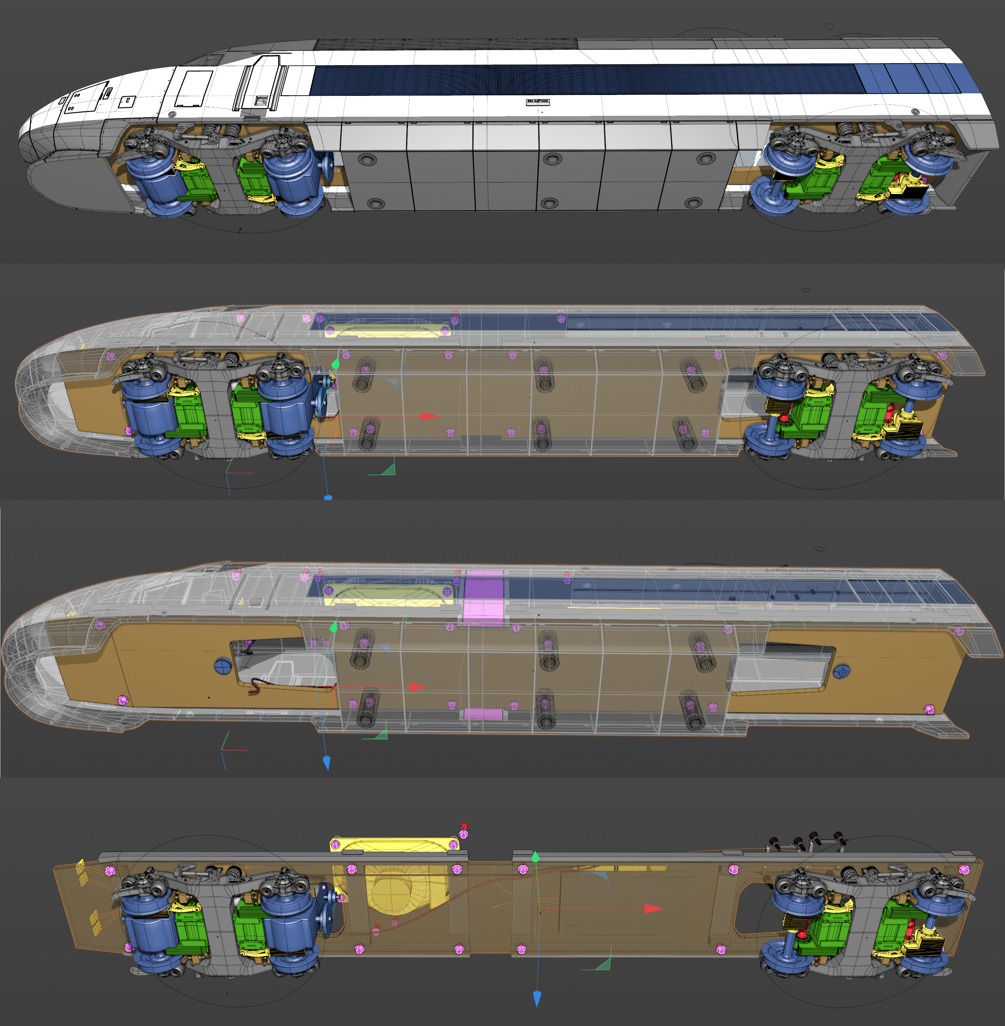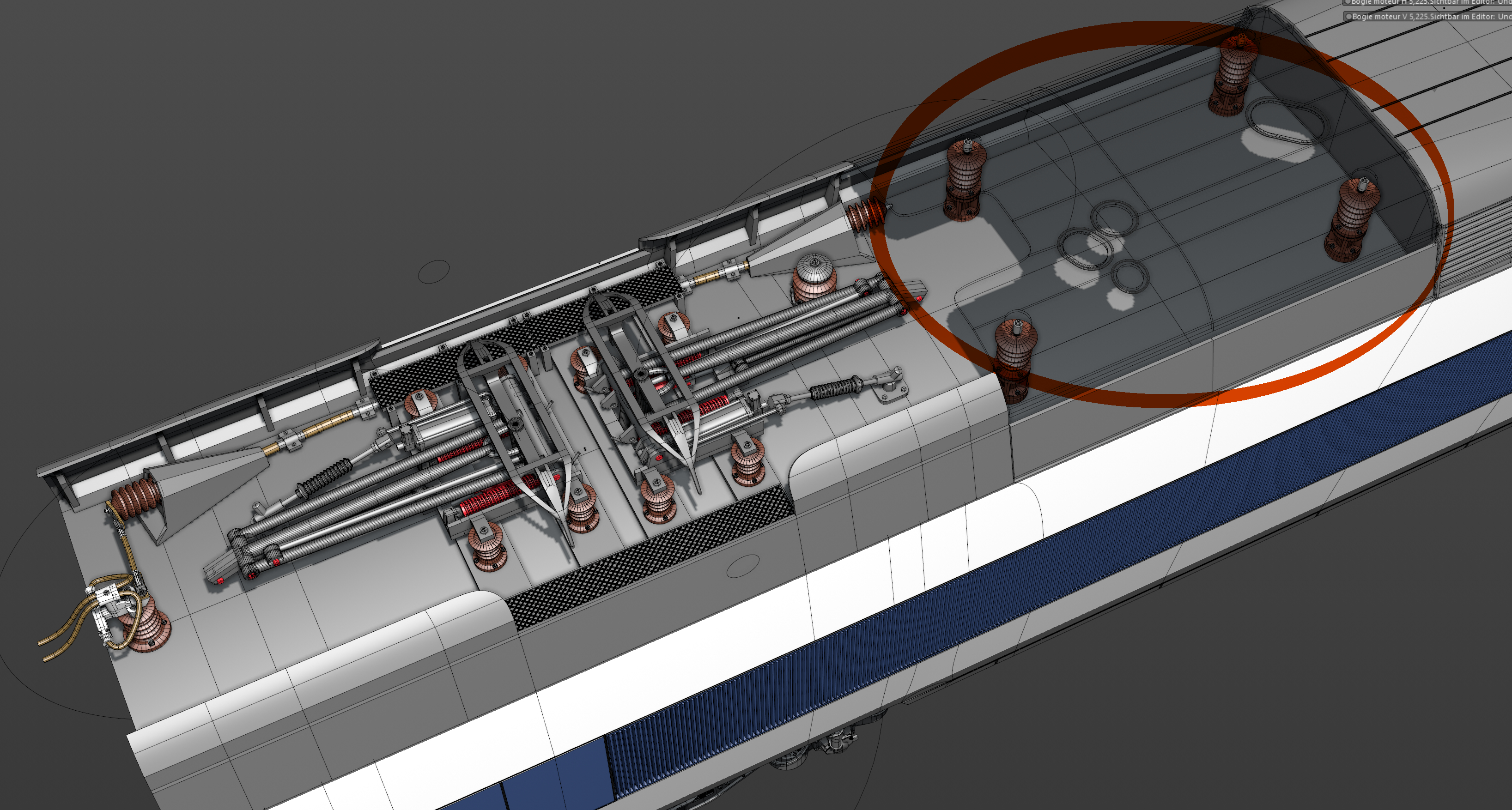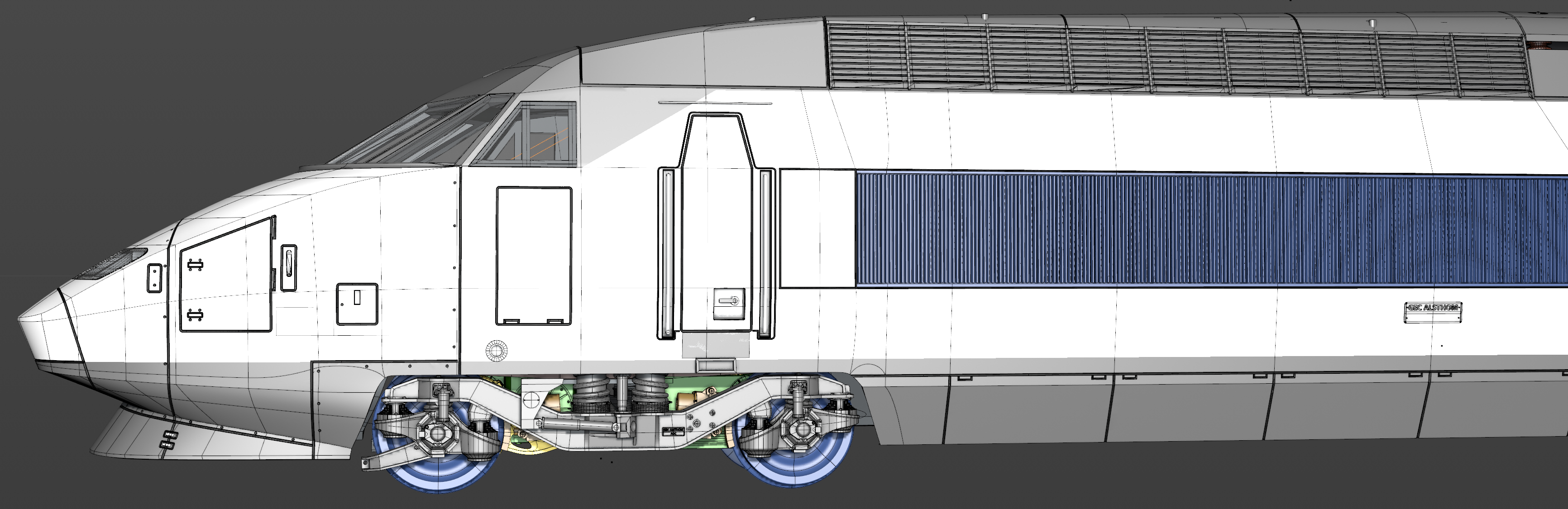 Ça va me permettre d'ajouter un tas de détails et surtout de corriger et approfondir ce que j'avais déja dessiné. Rapproché les pantos, commencé à différencier le 1,5 et le 25 kV, petite corréction du cadre porteur et des sous-structures, integration rainures du toit, trappe d'accès, corréction des carénages latéraux et des trous du capot. En même temps il a fallu ajouter des joint autours des portes et une marche pour le conducteur...bref gros chantier partout :lol: