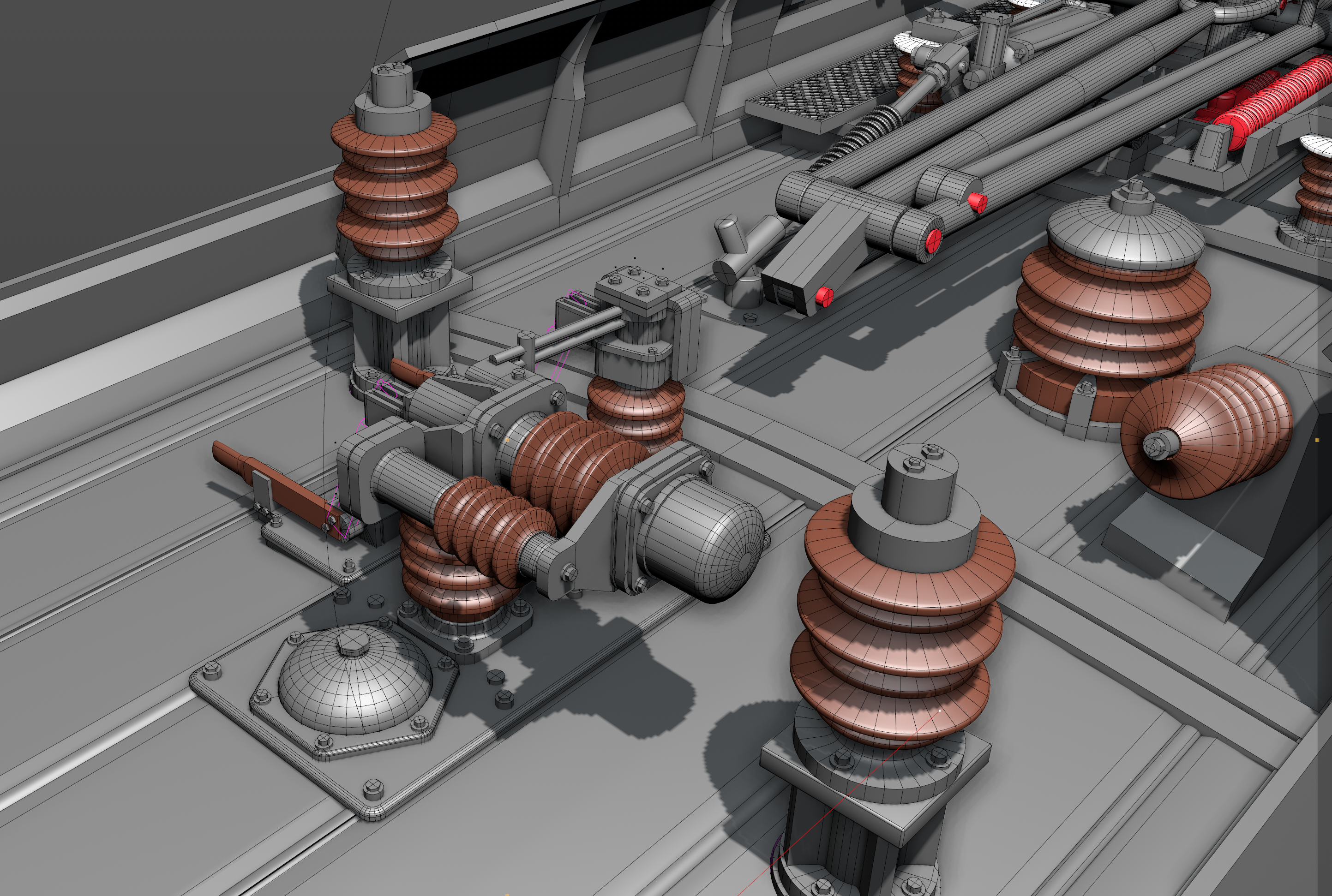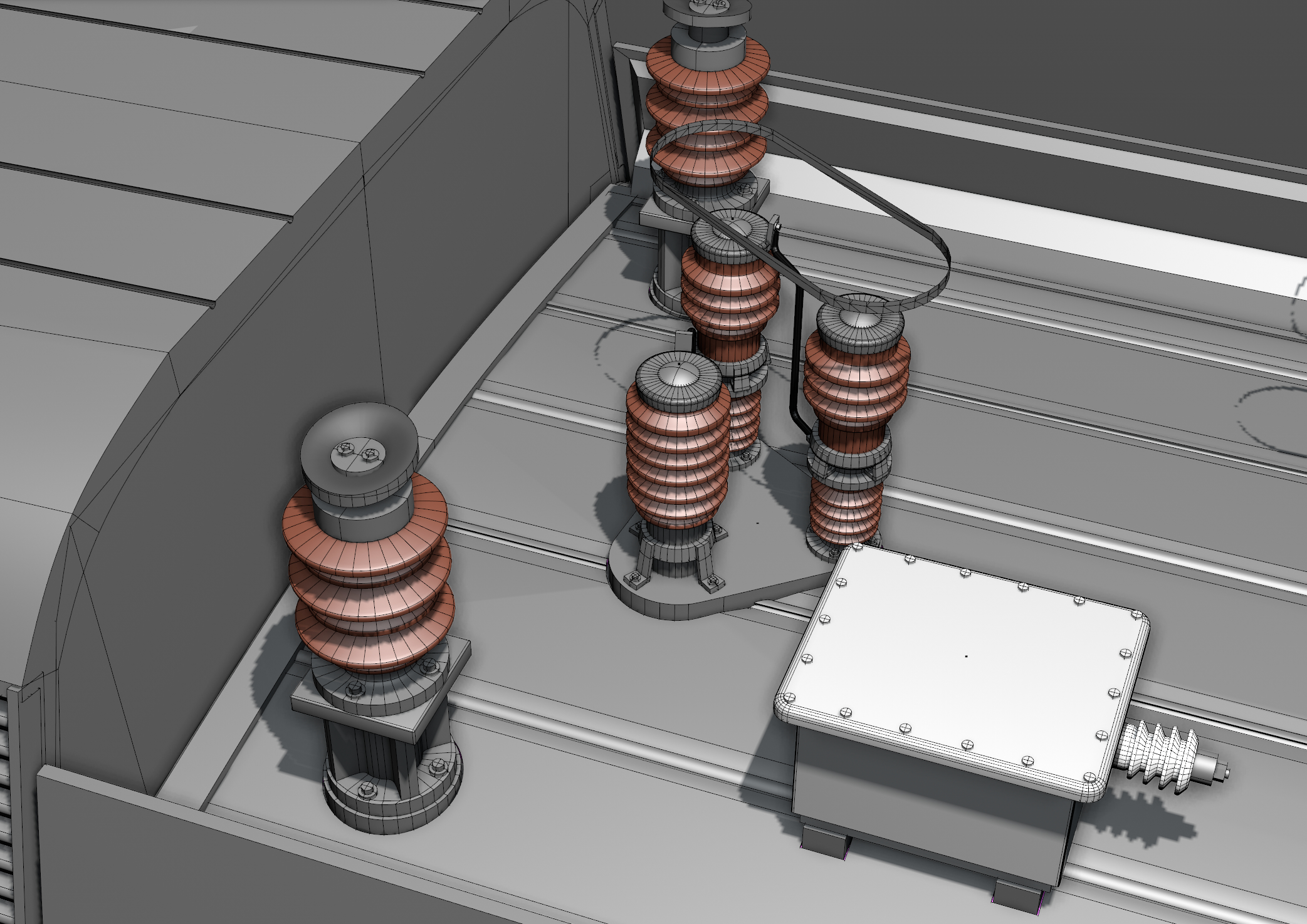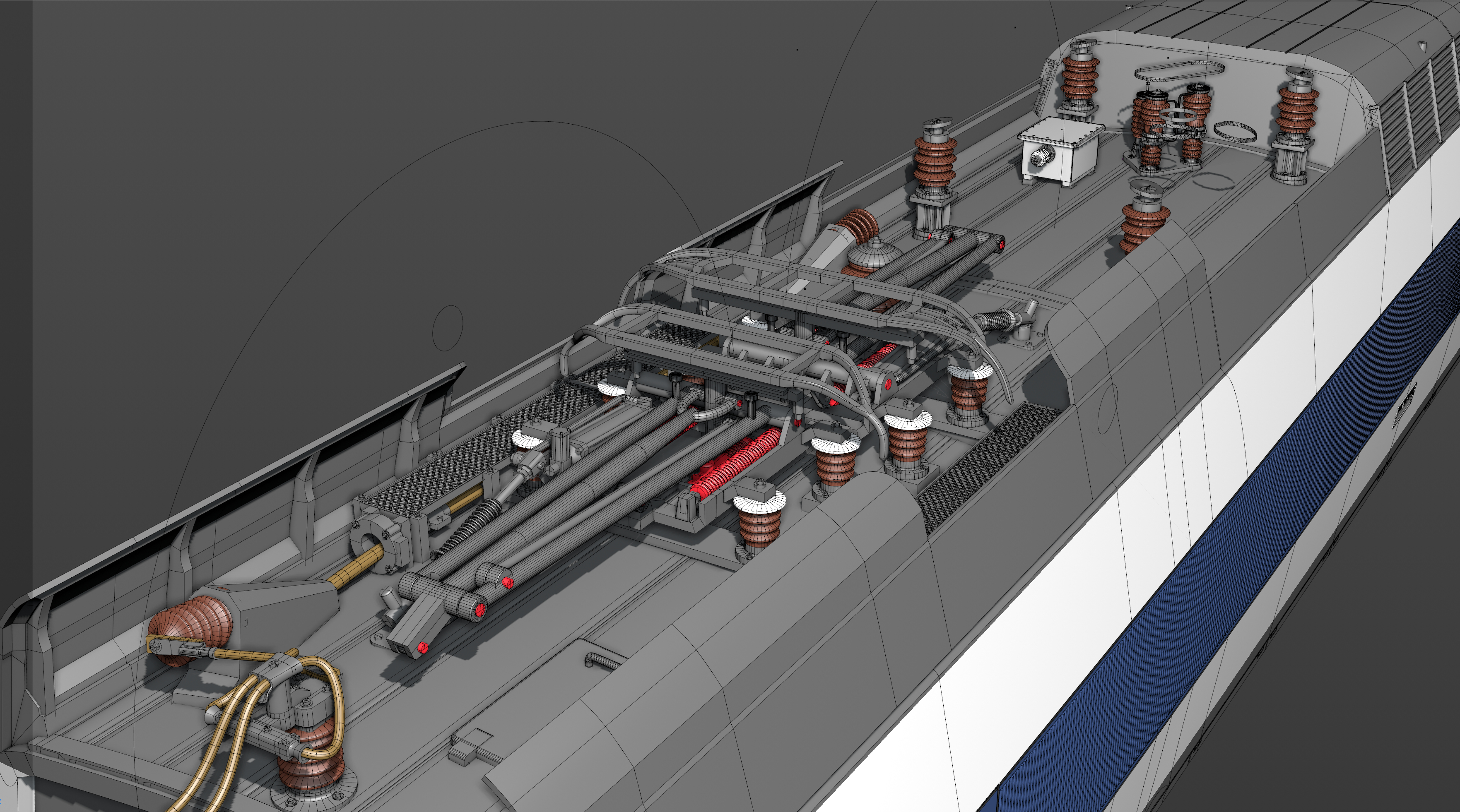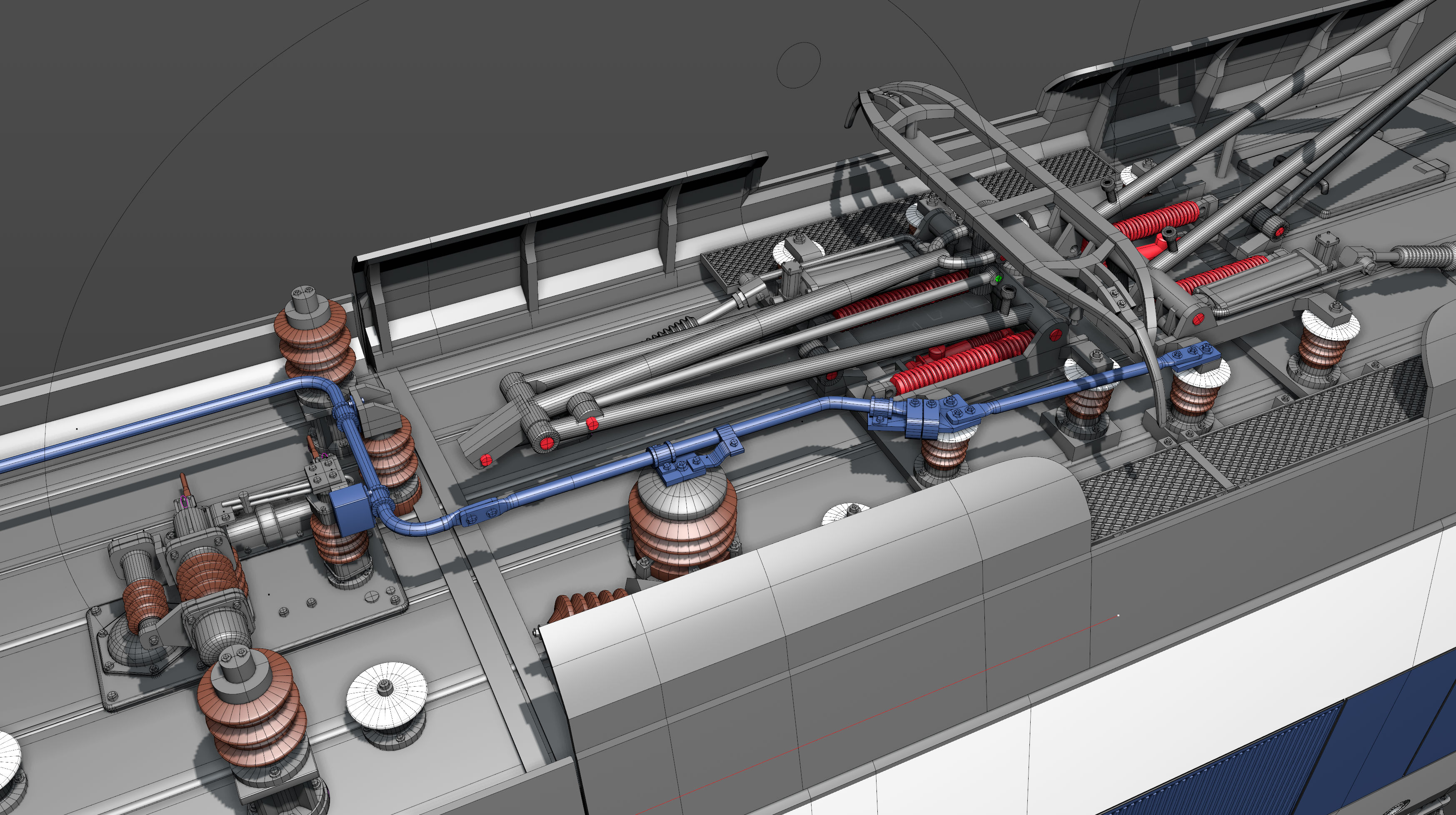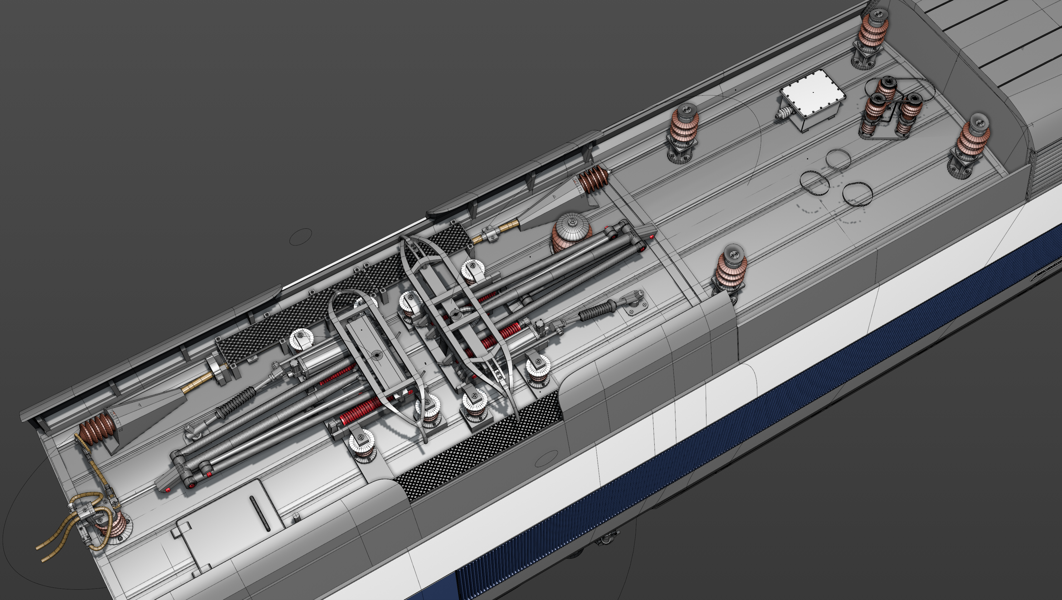 Les pantographes et les détail de l'équipement alimentation sur le toit continuent de prendre forme. ...Raccordement à air comprimé pour dispositif d'actionnement, isolateurs, cablage, sous-structures, petite correction et ajout de détails des panneaux de revêtement. Il faudra bientôt des tests d'impression pour valider les épaisseurs 😄