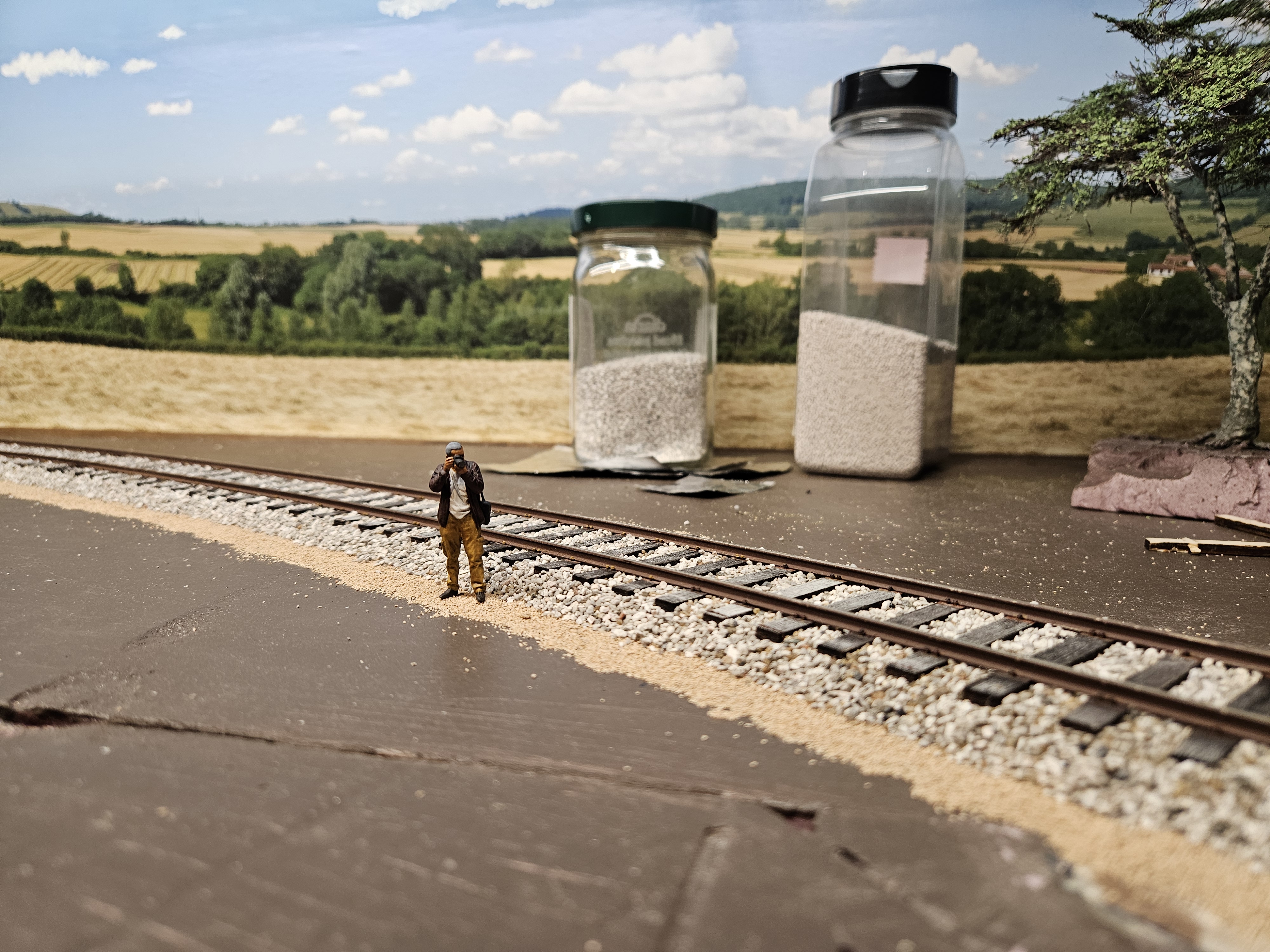 L'électronique fonctionne très bien et ça fait plaisir de voir rouler et d'entendre le Picasso. J'ai installé les frettes sur les traverses et la voie est posée au complet. J'ai engagé un photographe pour la suite des choses :