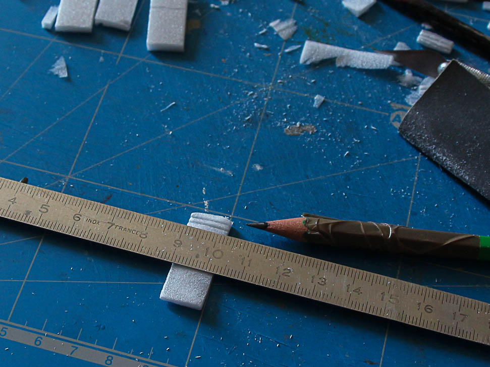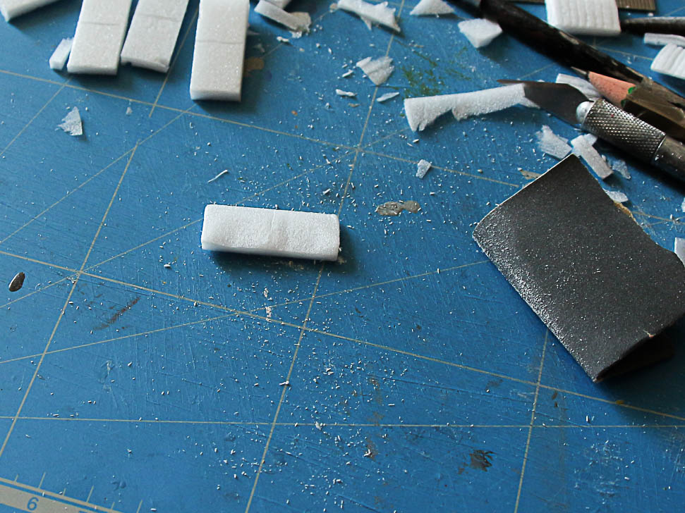 Je vais utiliser le même matériau, toujours du depron. J'ai essayé avec du tissu, notamment du velour côtelé (mille plis), mais n'arrivais pas à jouer sur l'épaisseur, le carton => non, la patte à modeler => non plus donc => depron de 3mm d'épaisseur.