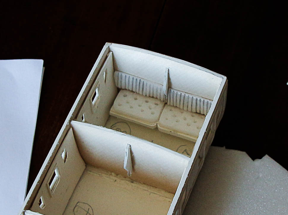 Me revoilà avec mes sièges et dossiers en depron, j'ai quand même un peu avancé ces derniers jours. Tout est peint avec un mélange de gris, blanc et un petit peu de jaune pour faire un gris "mastic" (enfin j'espère :gne: ), j'ai fait les ornements à l'aide d'un marker or et tout mis en place.