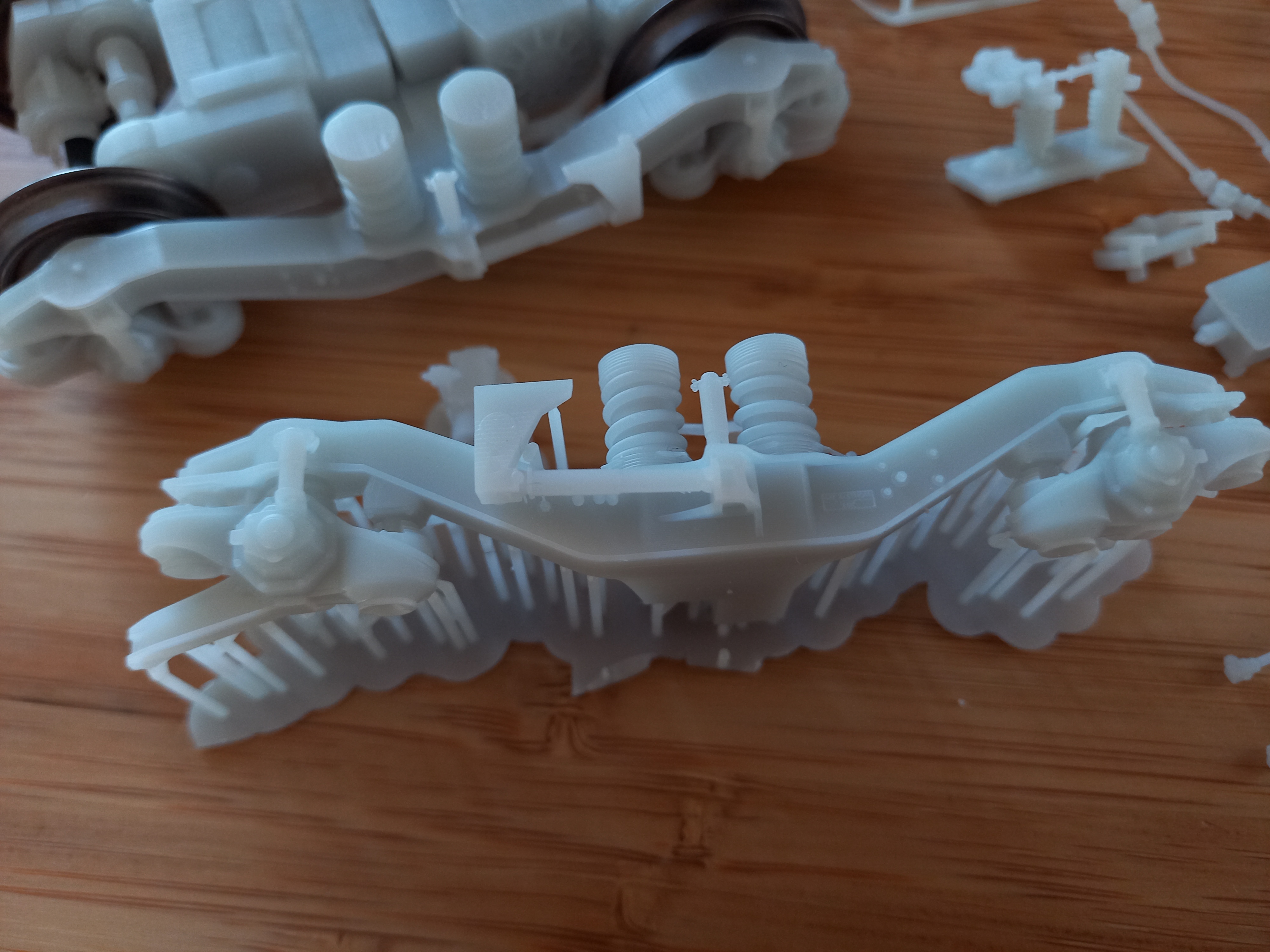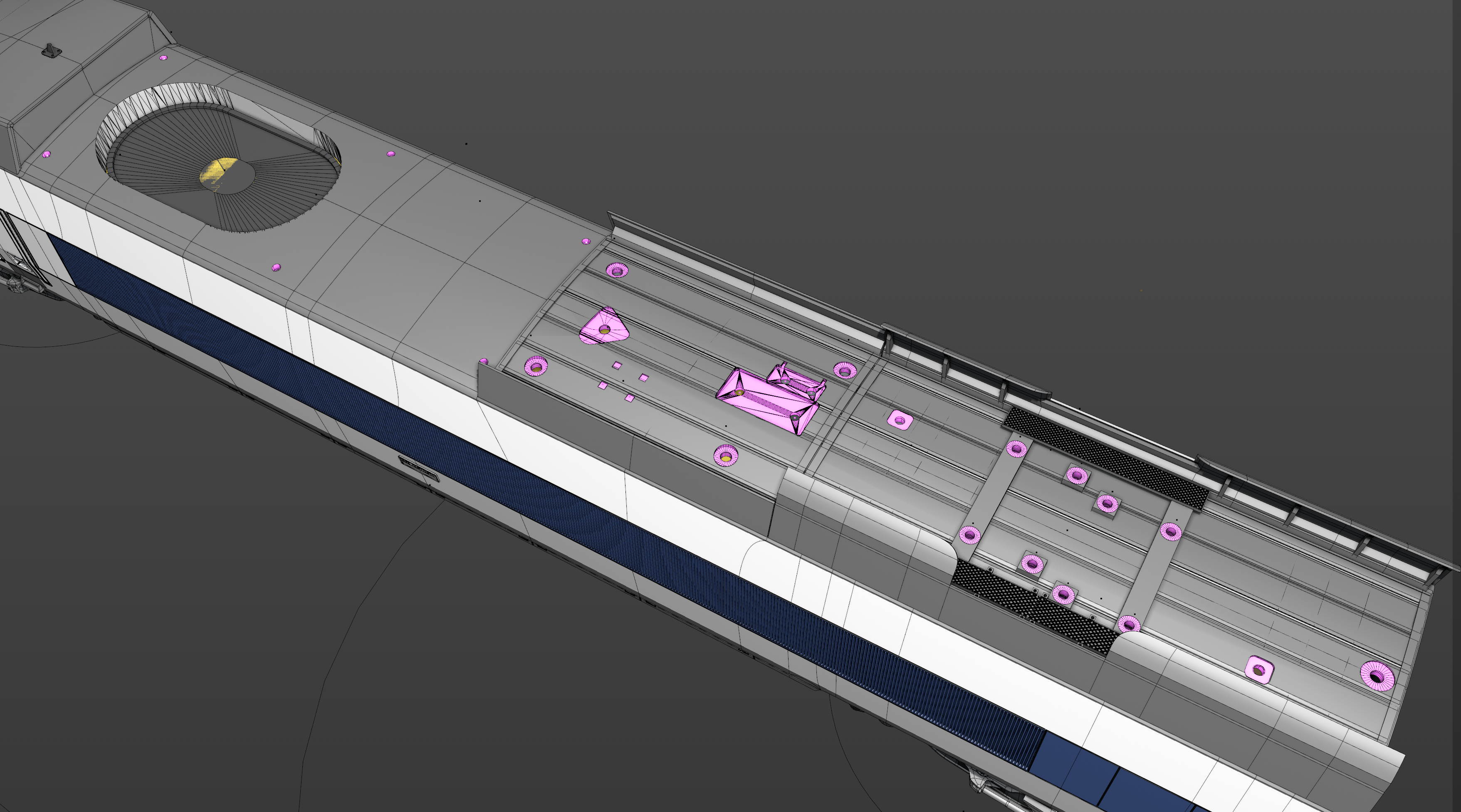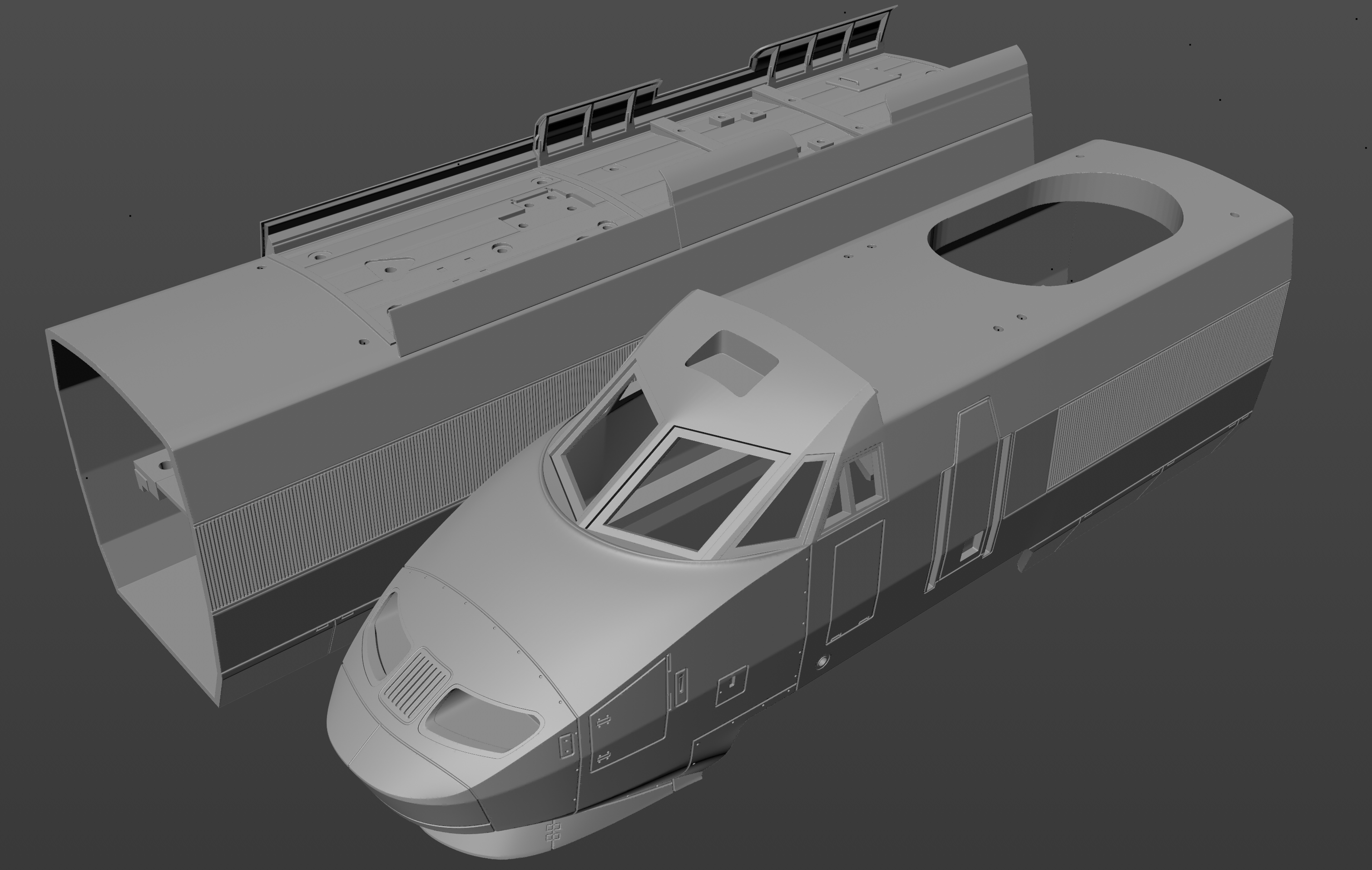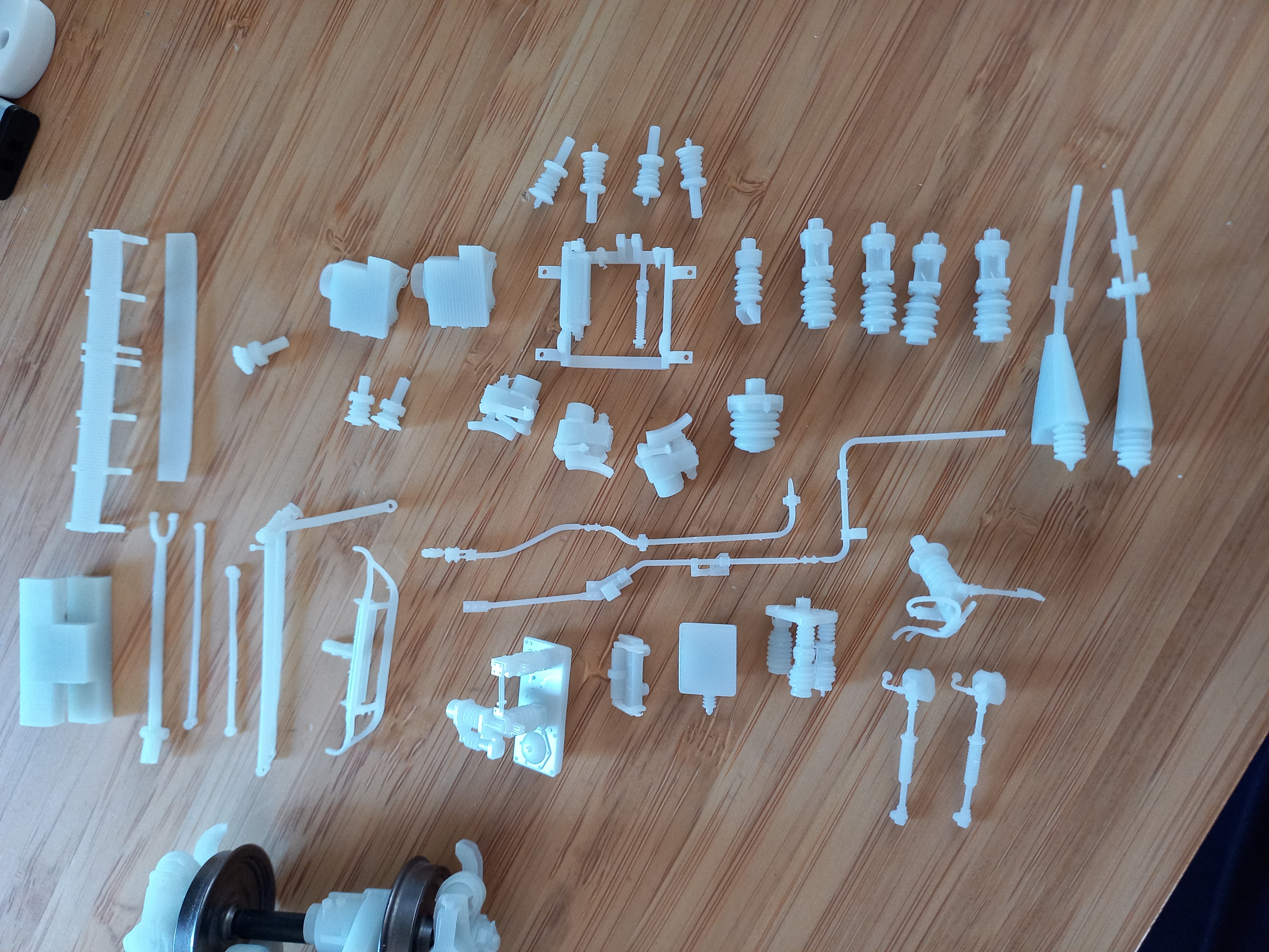 Ça progresse plus lentement que prévu en toiture avec les interconnexions en bleu et de nombreux préparatifs pour un test d'impression. Je dois entre autre préparer le caisson pour les divers composants à appliquer séparément. J'ai envoyé le panto 25kV pour un test en fonderie laiton, voyons si ça produira un résultat positif à approfondir