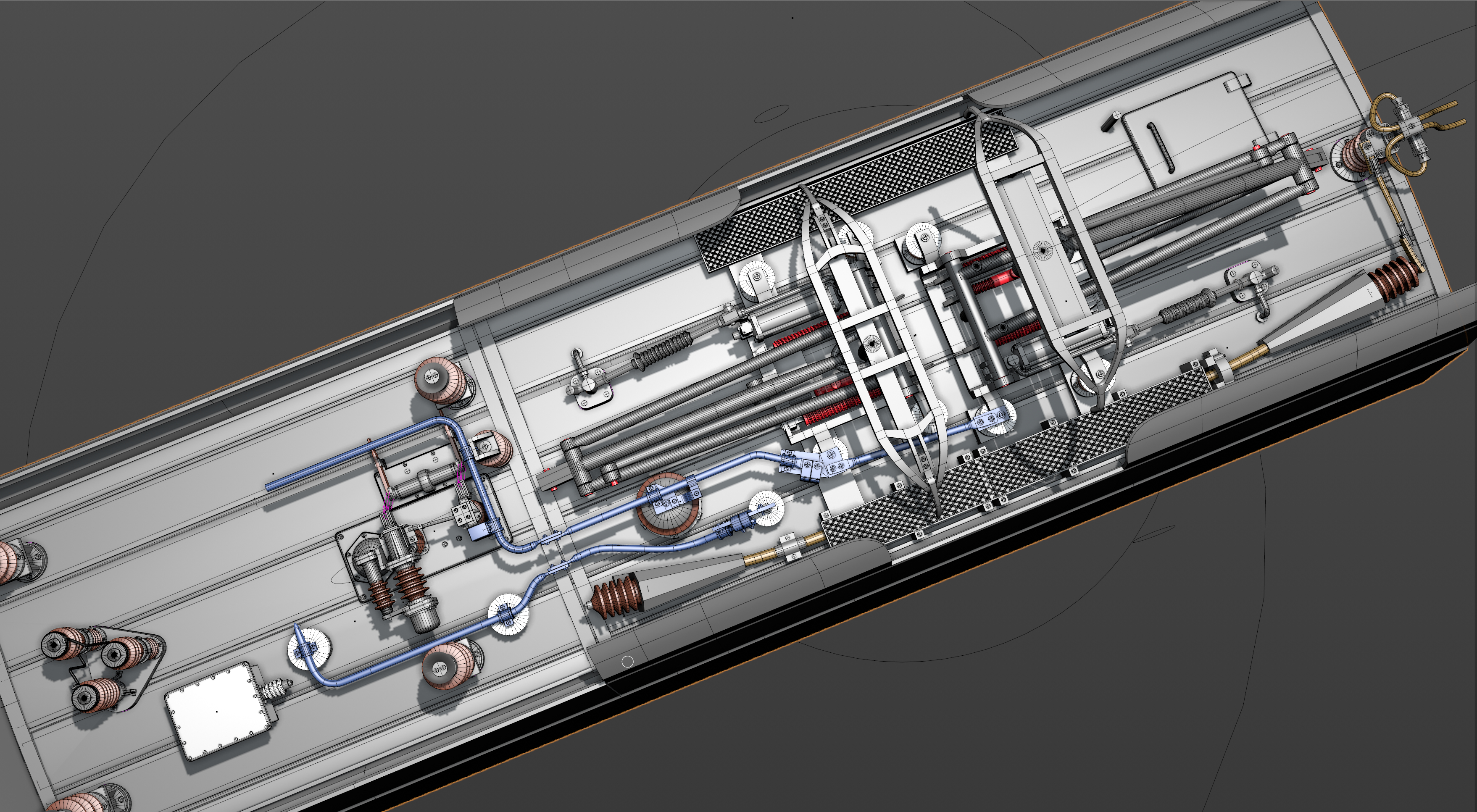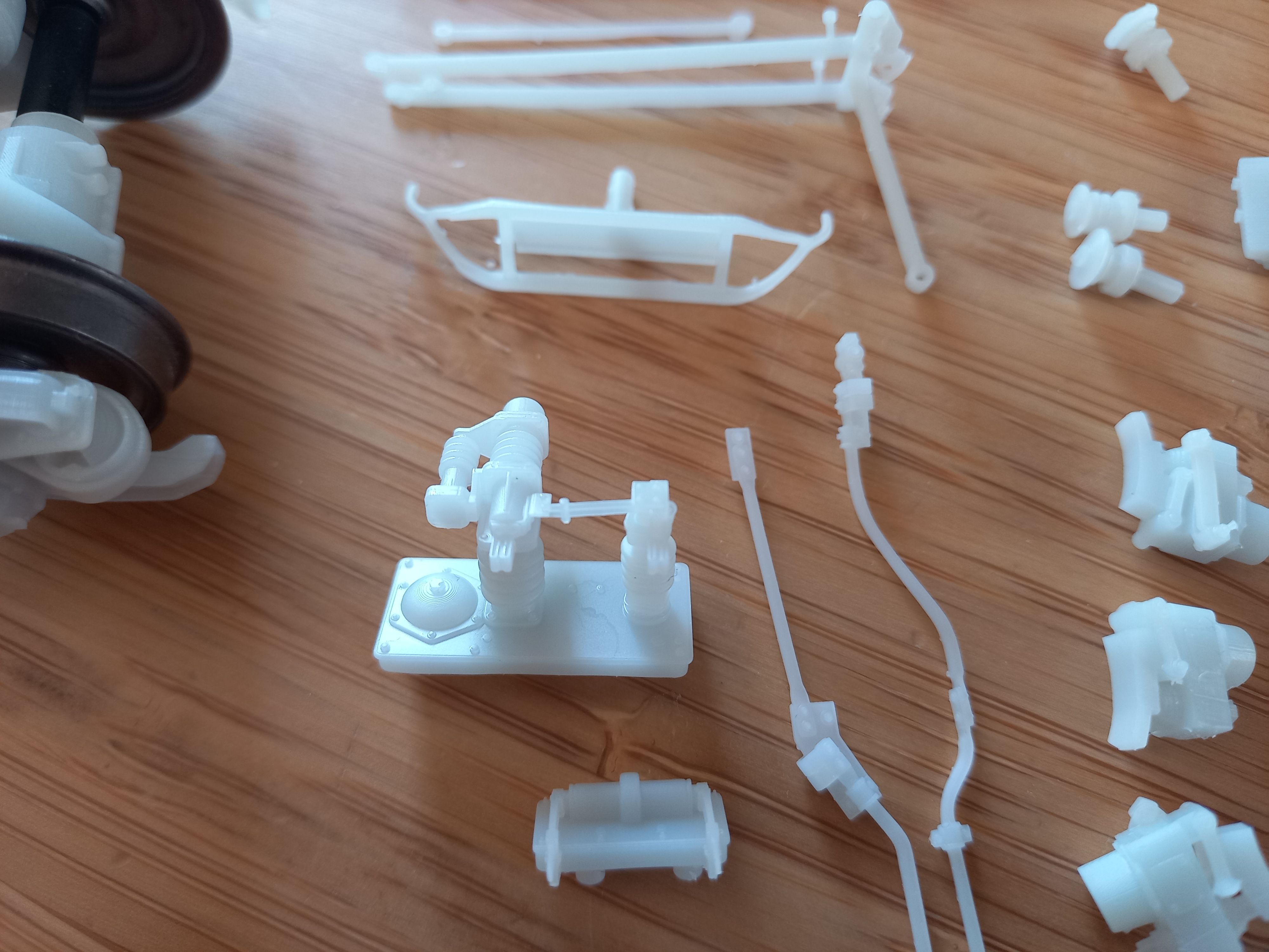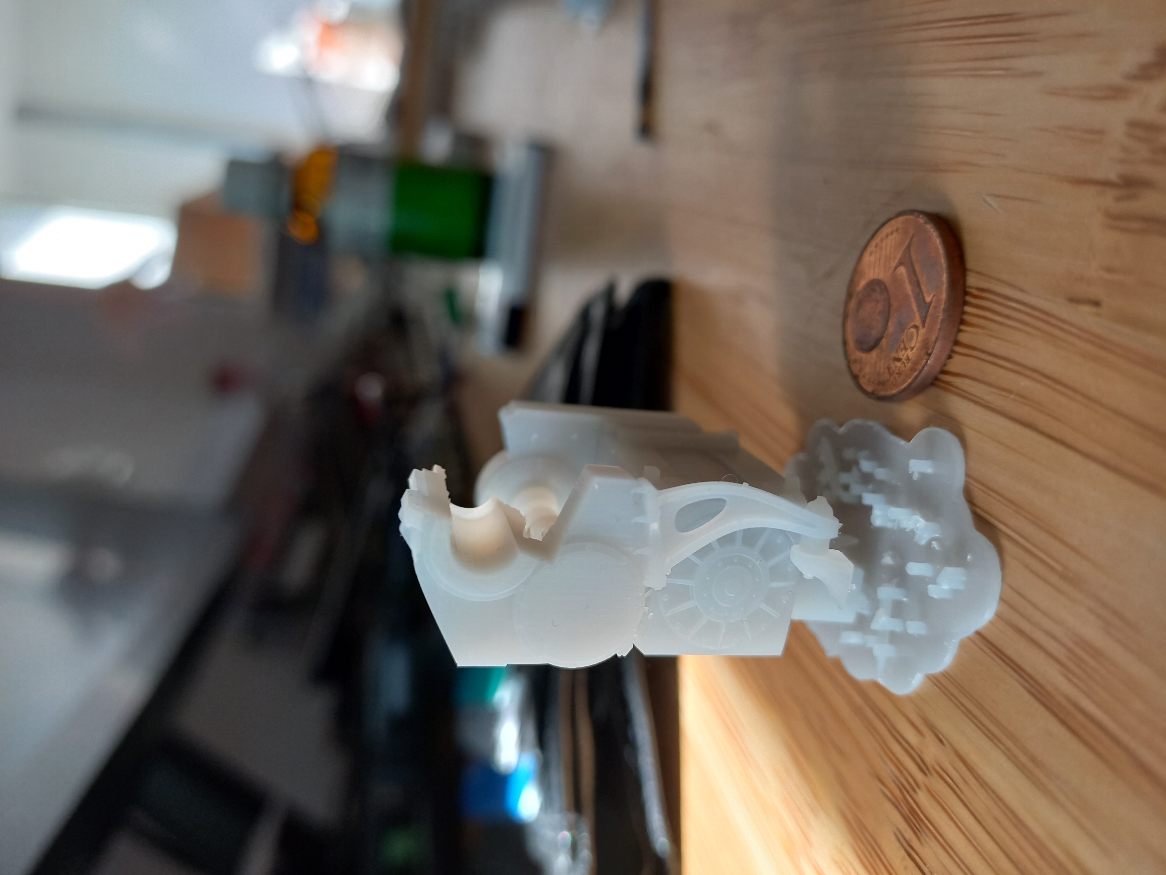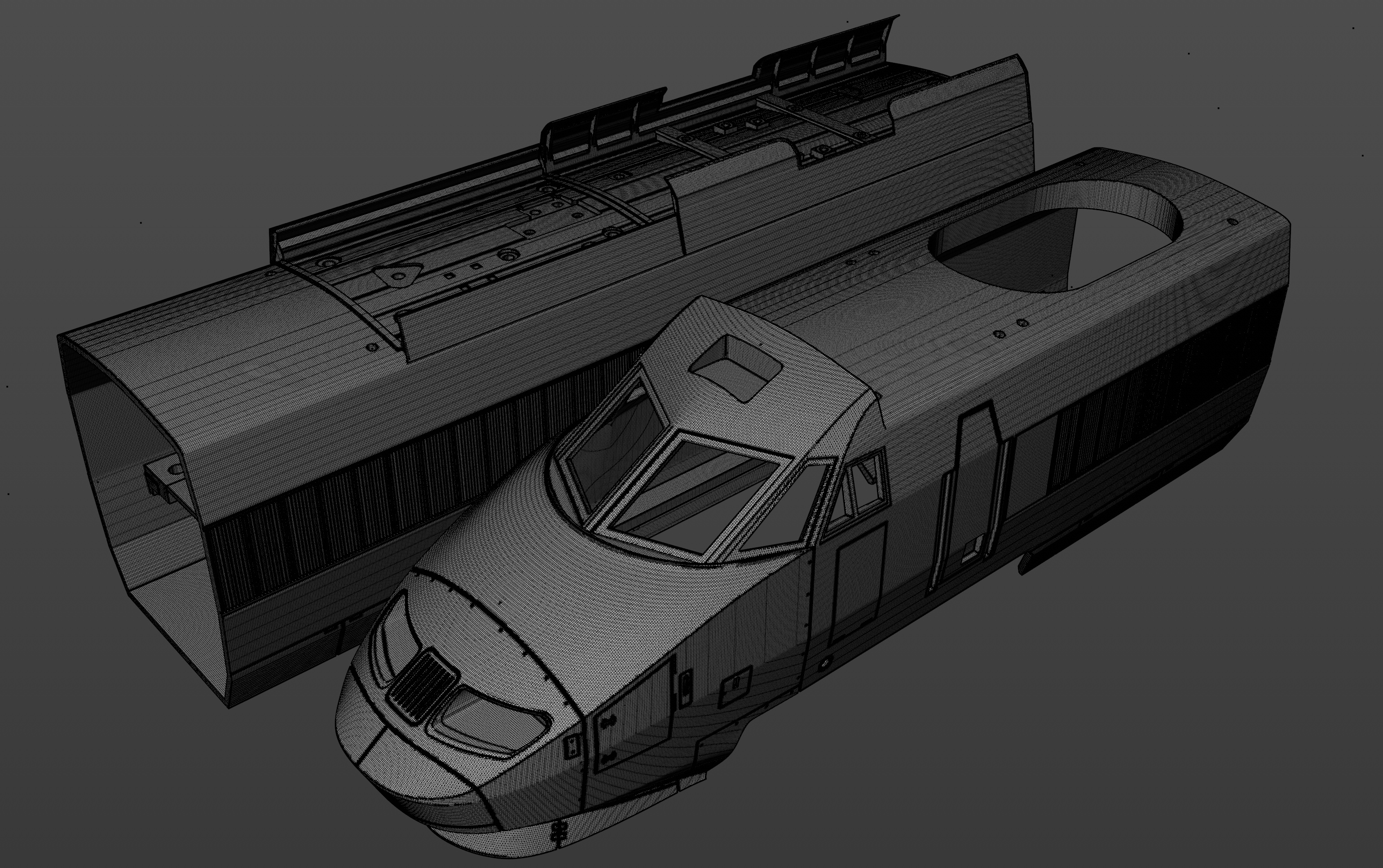 Ça progresse plus lentement que prévu en toiture avec les interconnexions en bleu et de nombreux préparatifs pour un test d'impression. Je dois entre autre préparer le caisson pour les divers composants à appliquer séparément. J'ai envoyé le panto 25kV pour un test en fonderie laiton, voyons si ça produira un résultat positif à approfondir
