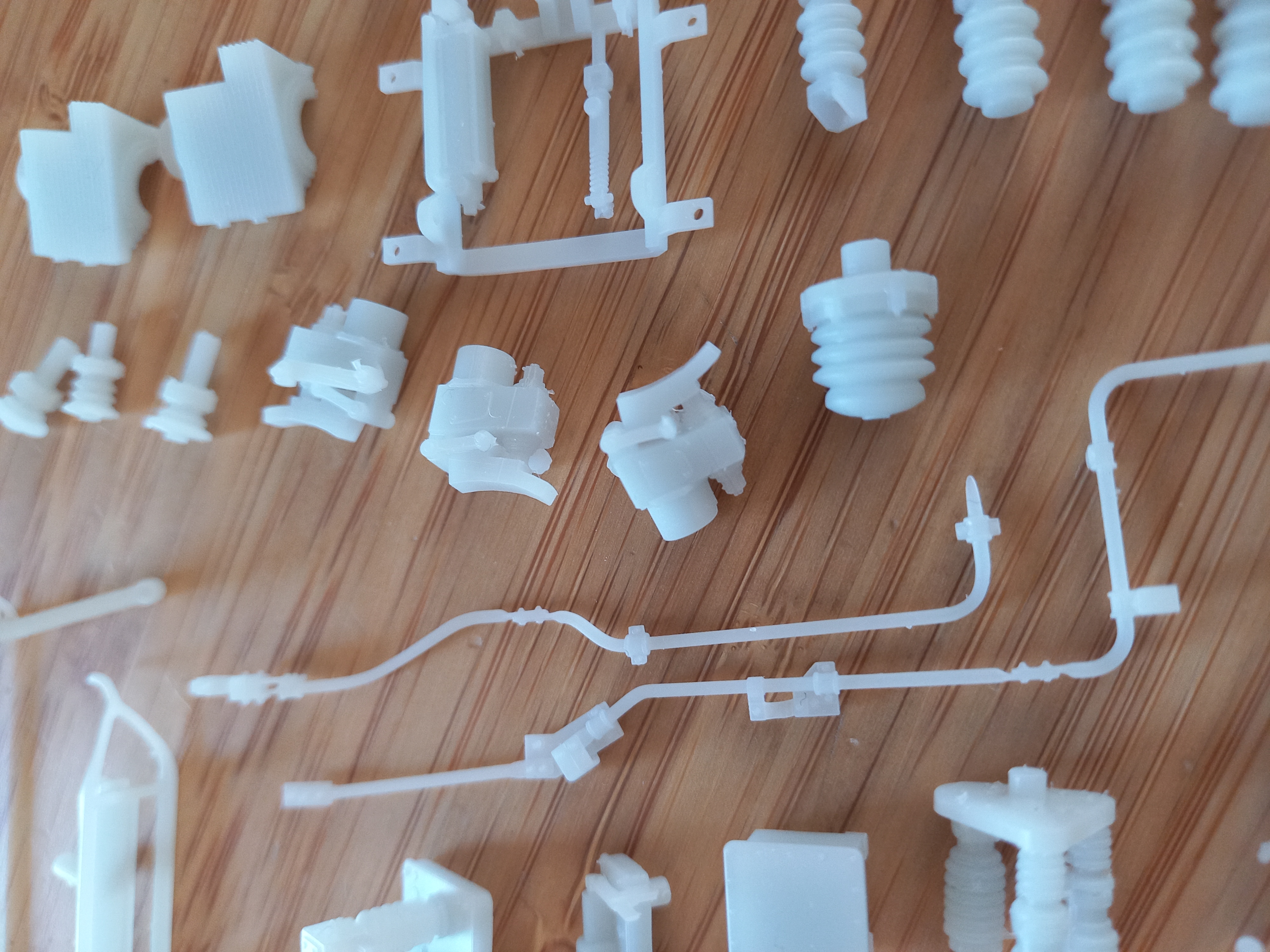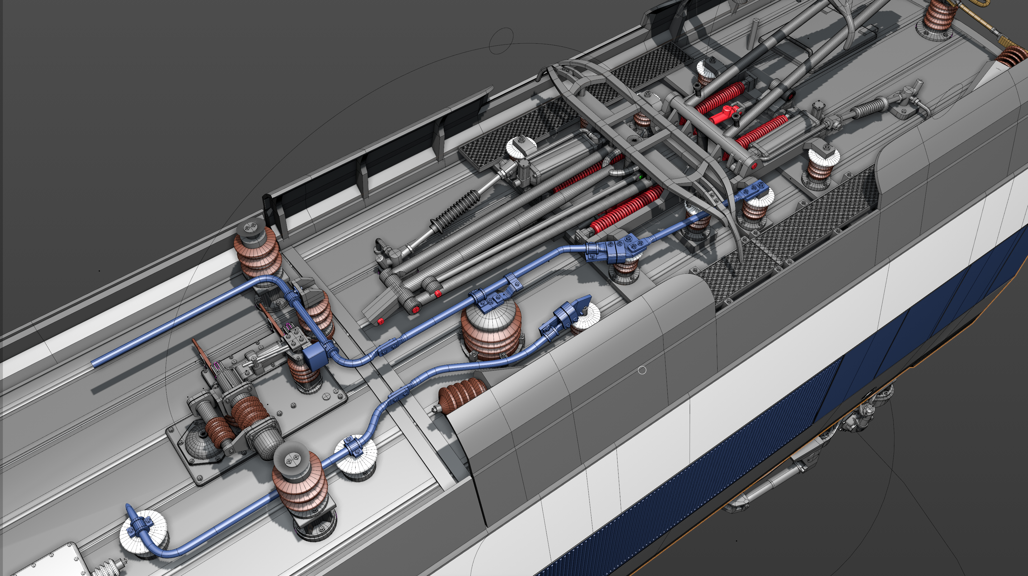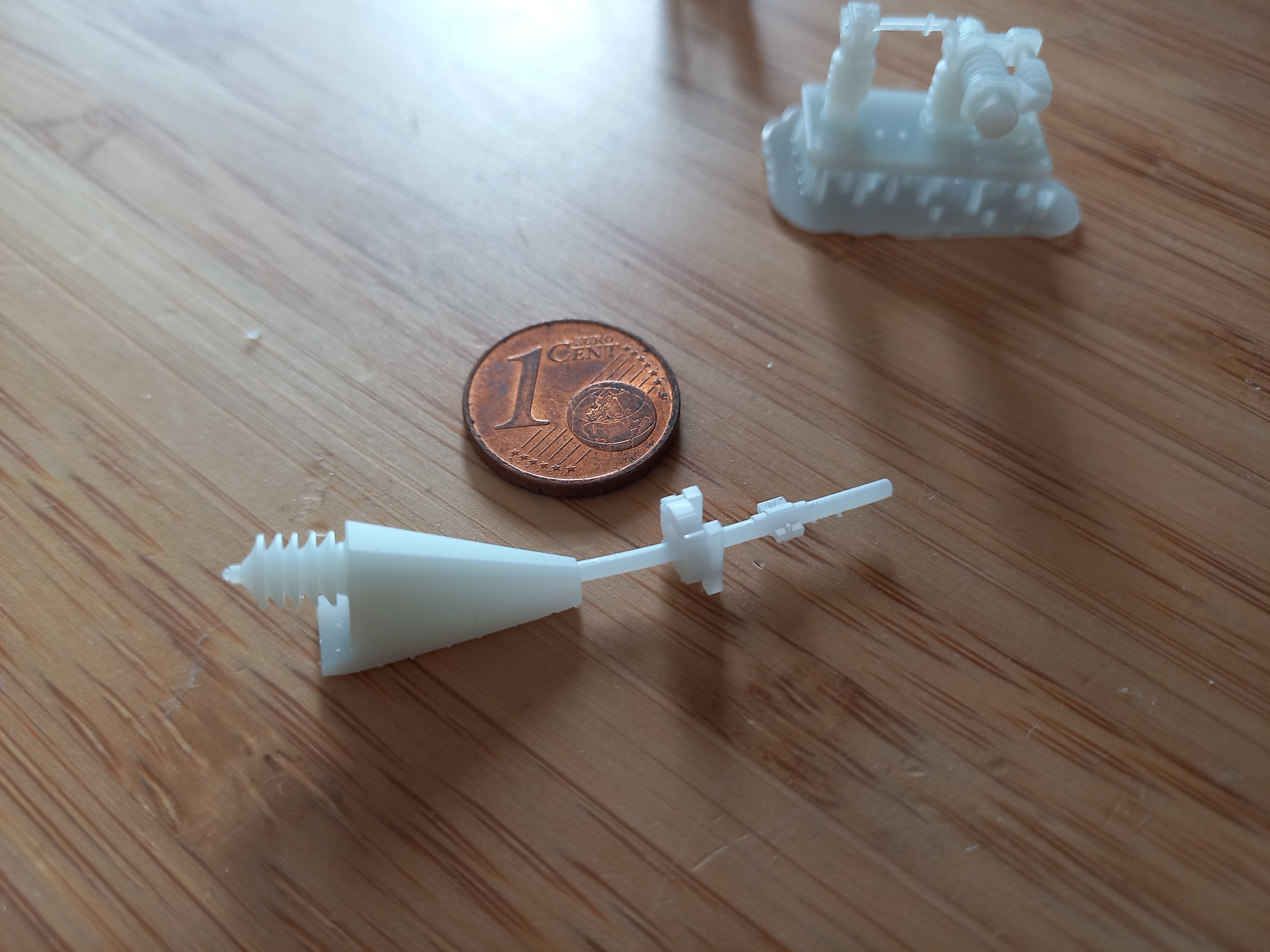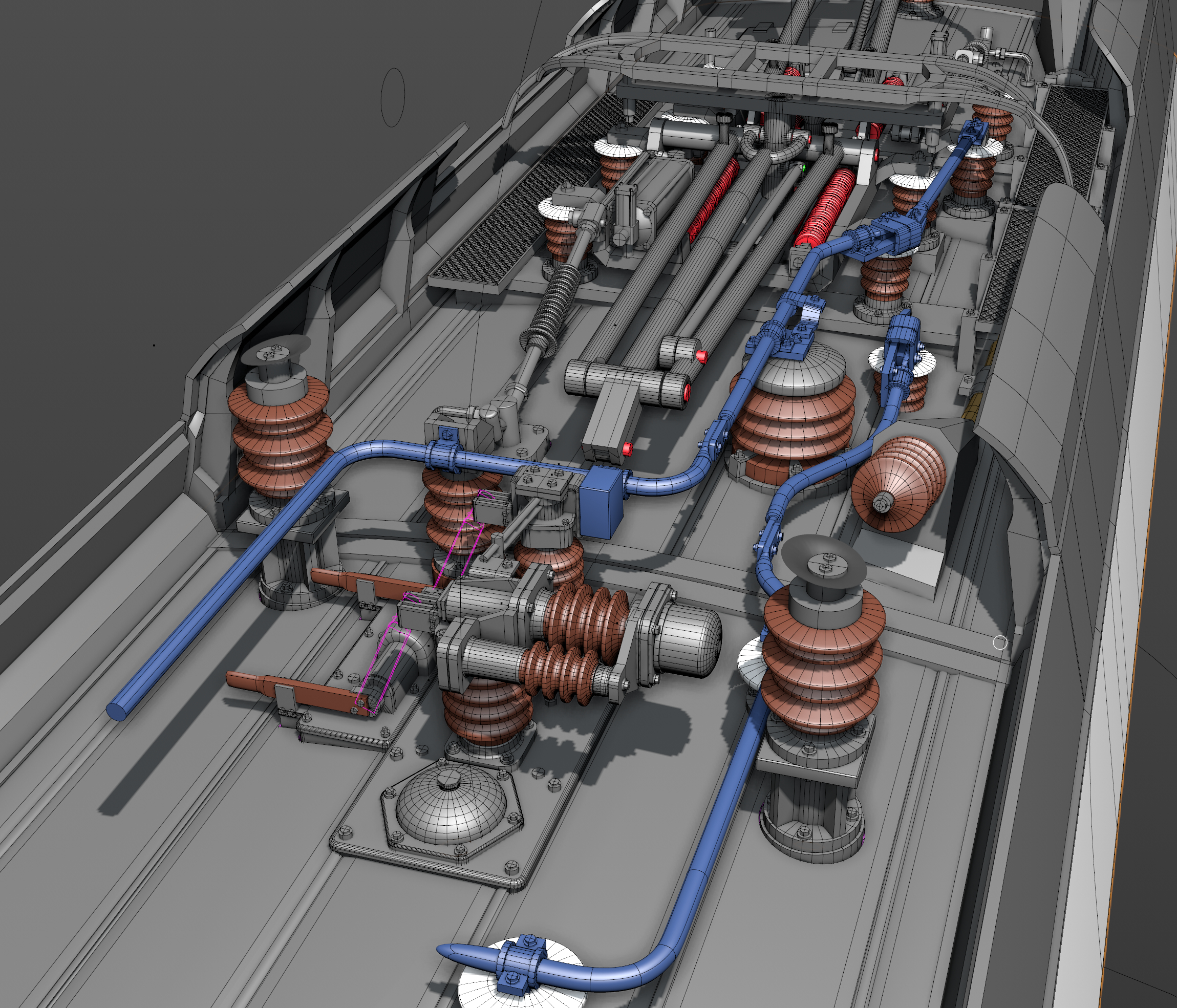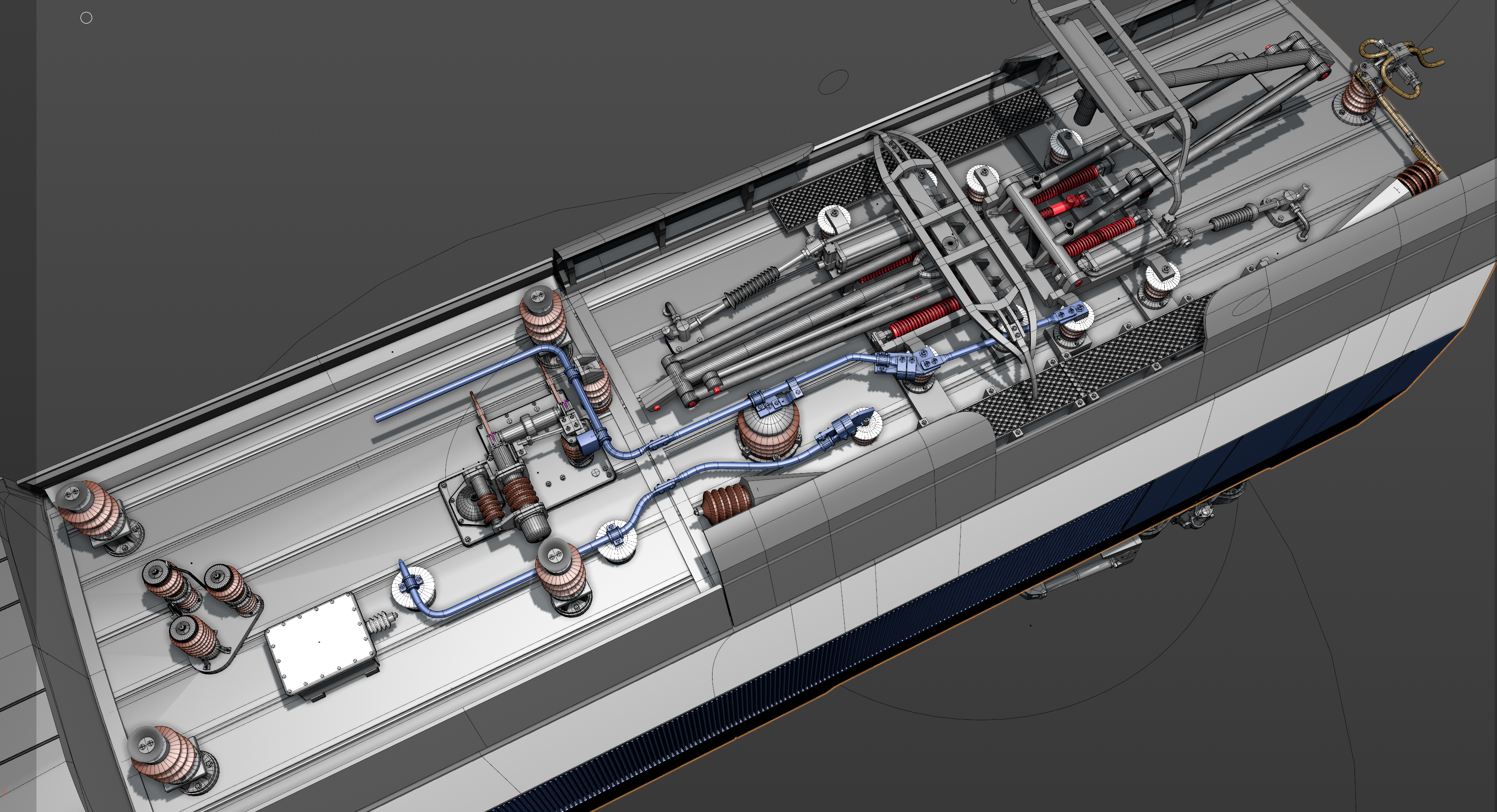 Ça progresse plus lentement que prévu en toiture avec les interconnexions en bleu et de nombreux préparatifs pour un test d'impression. Je dois entre autre préparer le caisson pour les divers composants à appliquer séparément. J'ai envoyé le panto 25kV pour un test en fonderie laiton, voyons si ça produira un résultat positif à approfondir