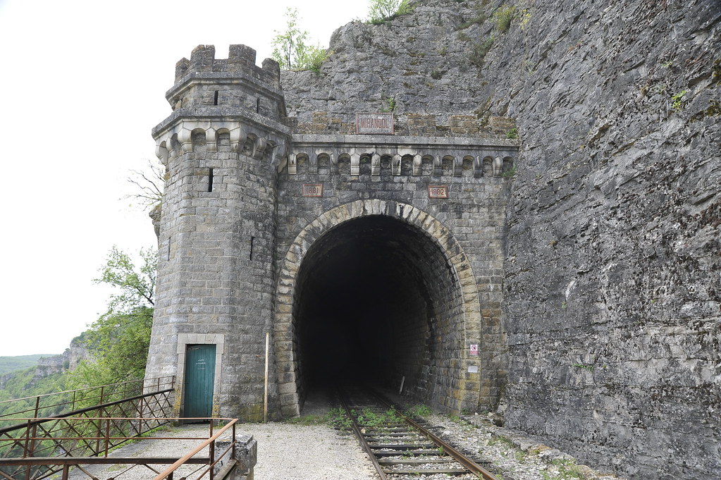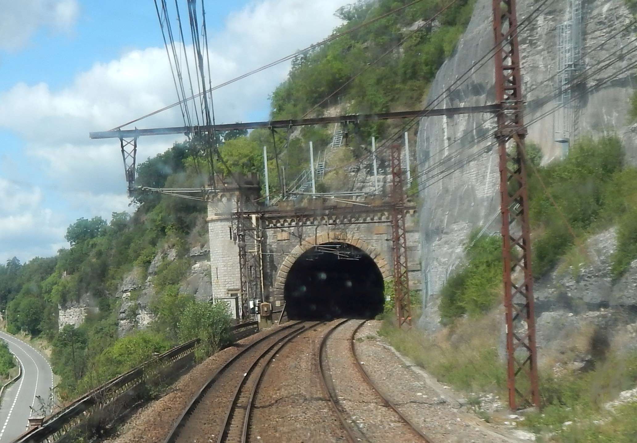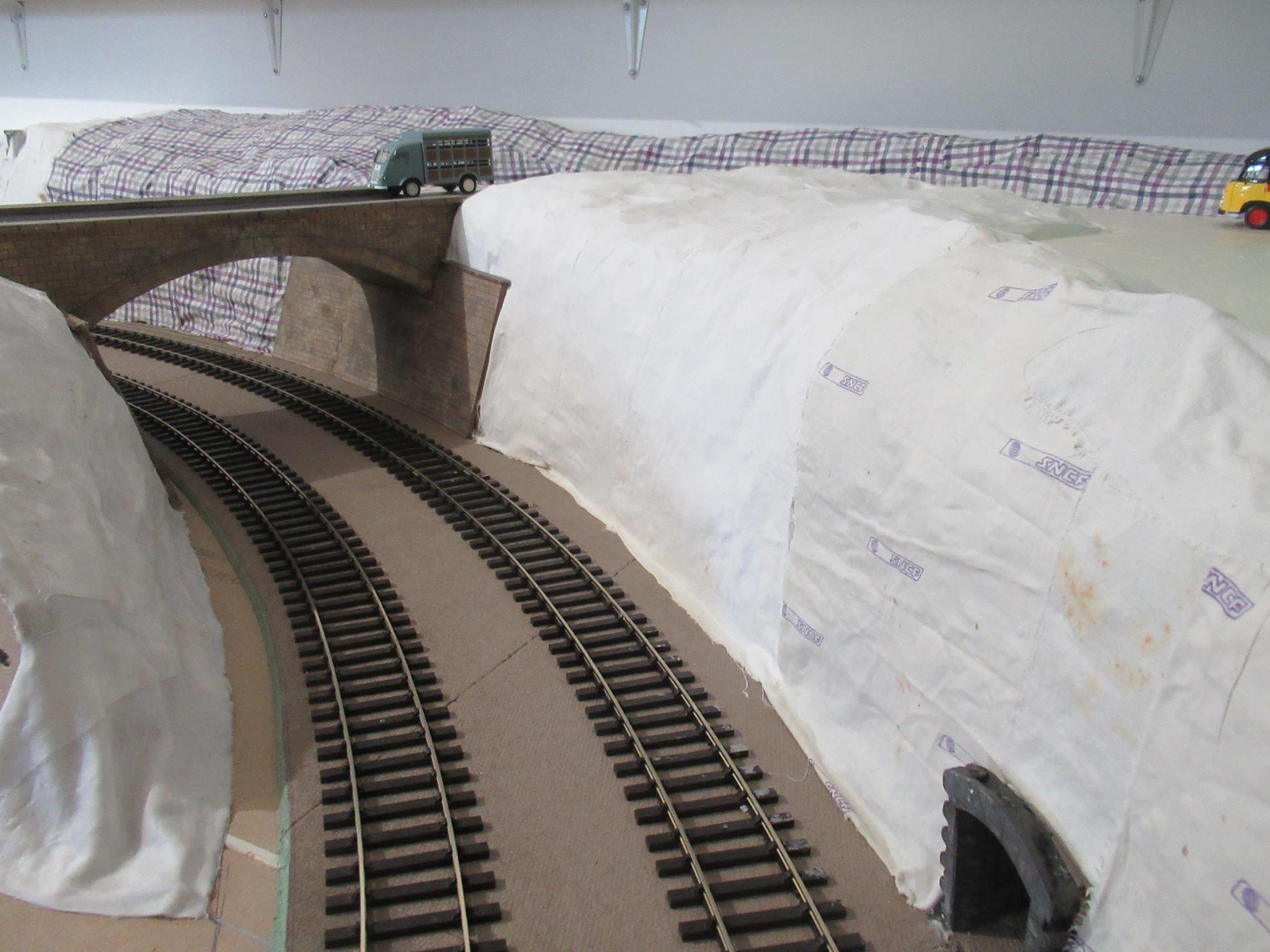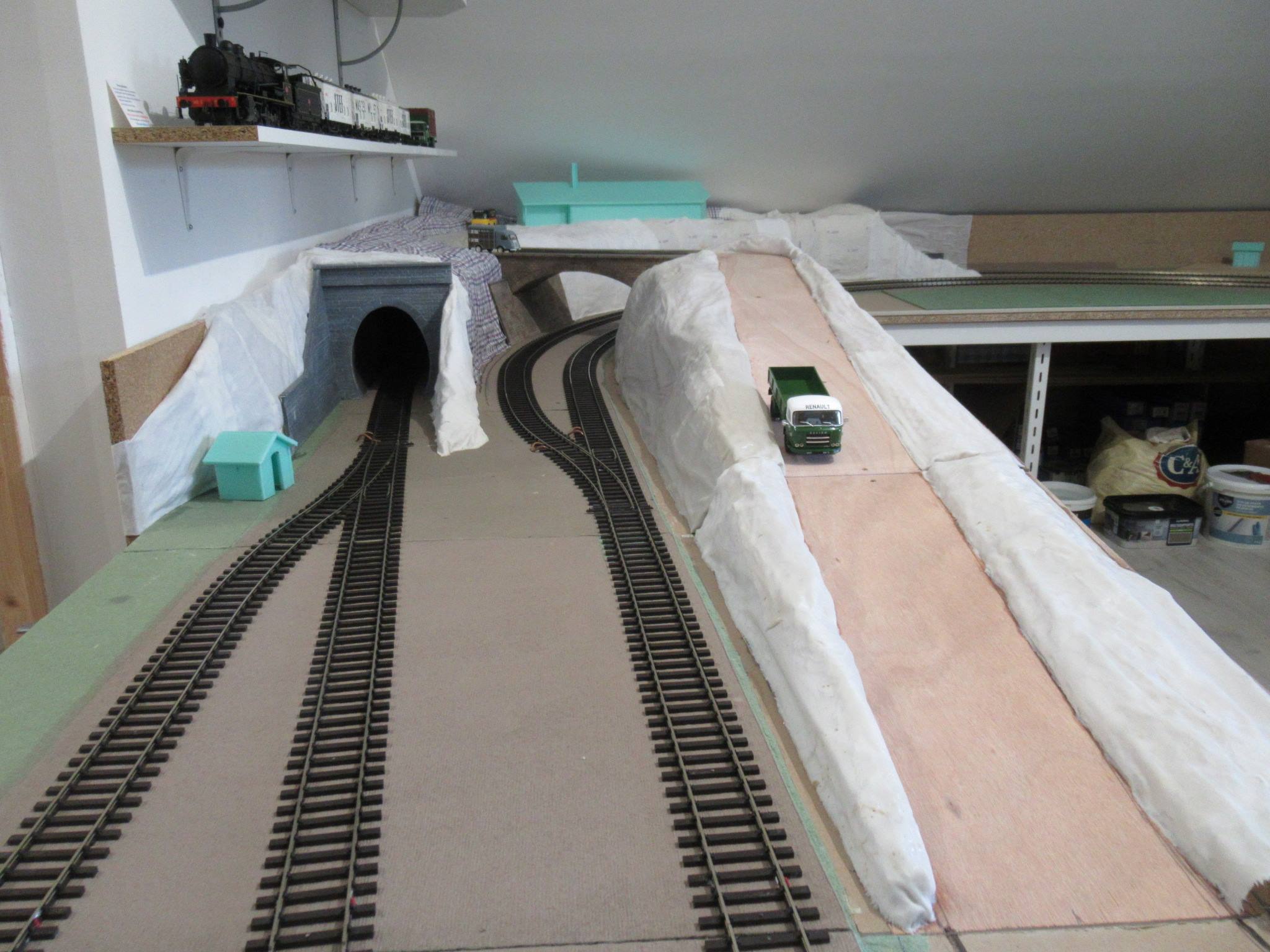 En effet, cette languette de rocher m'a posé un cas de conscience, mais cela aurait fait bizarre de ne rein avoir dans cet angle. Une possibilité éventuelle m'avait effleuré l'esprit, une tour maçonnée du style des photos. Mais rien n'est perdu, il sera toujours possible de dynamiter cette languette et d'y faire une jolie tour. En ce qui concerne la partie plane sur la voûte du tunnel, cela existe bien en réalité : c'est le cas du tunnel des bénédictins à Limoges. Il ne t'a pas échappé que des culées du pont qui enjambe les 2 voies appuient sur la voûte du tunnel, mais là je n'ai pas d'explication.