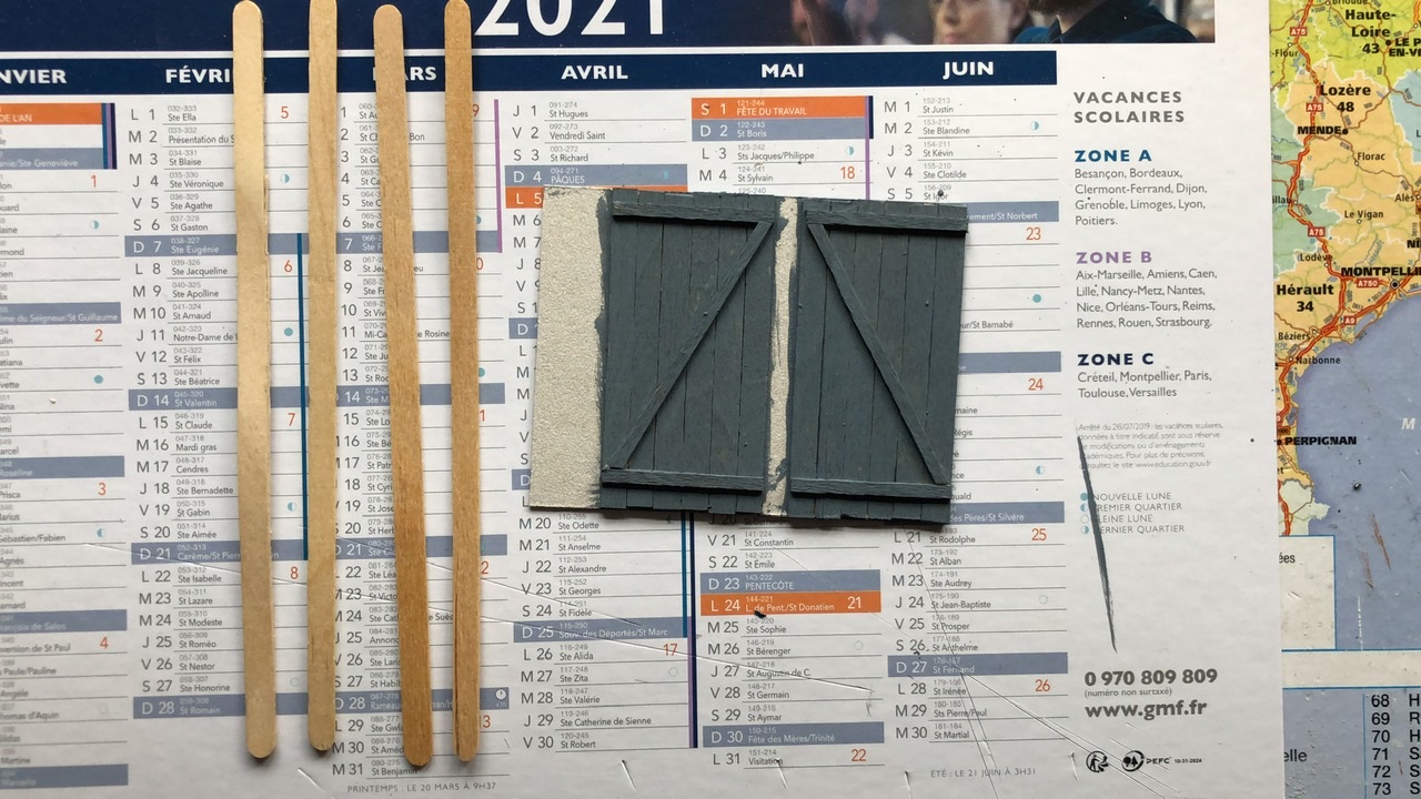 Après une petite couche de peinture une légère patine aux pigments Castorama. Je vais incliner un des deux vantaux pour casser l’uniformité.