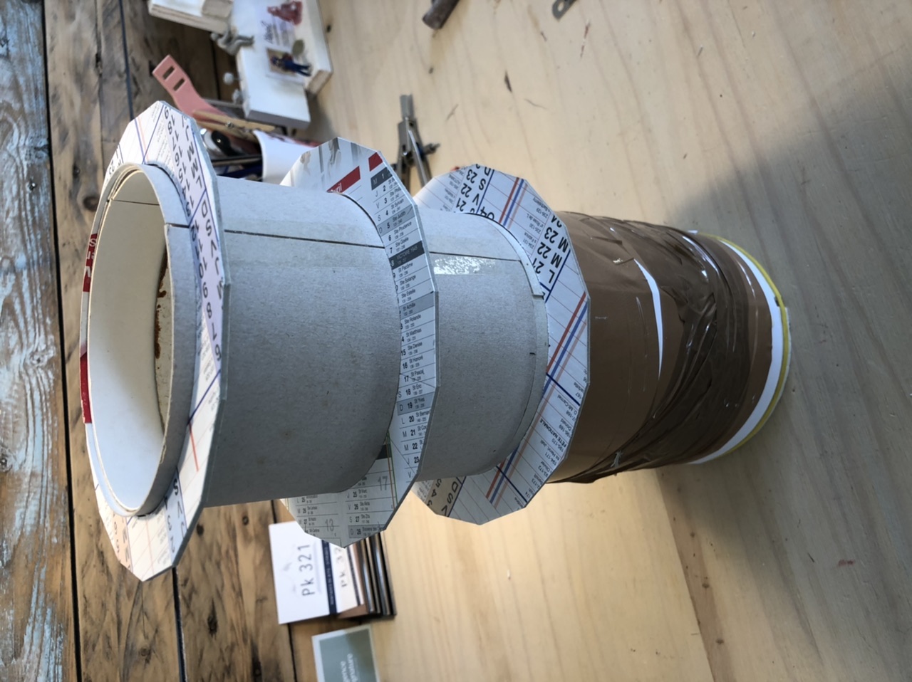 J’ai commencé par mettre le corps au bon diamètre en collant des épaisseurs de carton sur le cylindre. Ça permet d’avoir un tube au bon diamètre et à la bonne hauteur.