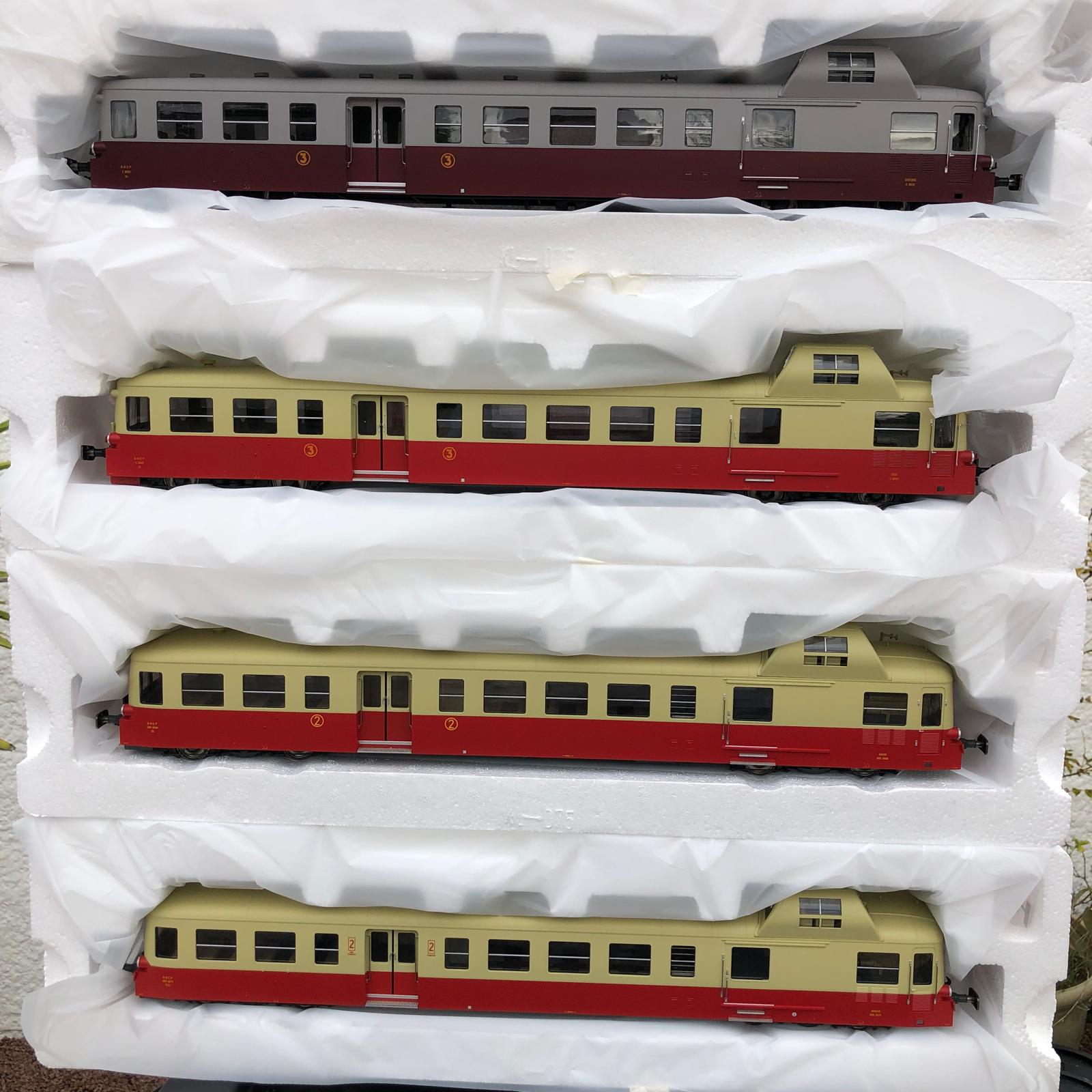 Voici la photo de famille des échantillons de production que vous verrez à Rail Expo, de haut en bas références 3800-01 à 3800-04 : A noter qu'une vingtaine de modèles (référence 3800-05) seront livrés avec la caisse non peinte et les vitrages non collés, pour les amateurs-transformateurs de Furets du Morvan, Cagouilles et autres Fécamp-Breauté-Beuzeville...