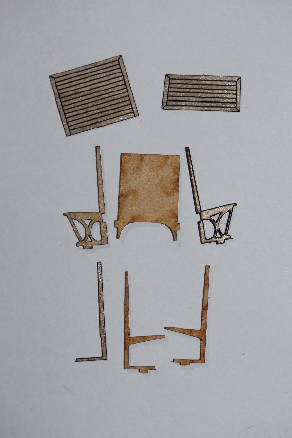 L'aménagement intérieur. Il y a 12 banquettes doubles à assembler et 4 simples. Si le dégrappage des piètements se fait sans soucis, Celui des pièces représentant les moulures des pieds est parfois délicat à cause d'un trou dans la partie haute du montant. Si on ne perd pas le morceau, il es possible de le recoller sinon il faut faire une greffe à partir de chutes prélevées dans les plaques. Alors que le siège est monté à la colle à bois il vaut mieux utilisé de la cyano liquide pour ces réparations car cela permet le ponçage facile de la pièce. j'ai utilisé de la colle Cléopatre qui sèche un peu vite à mont gout. la découpe est très précise ...voire trop précise , ce qui rend fragiles certaines partie des montants.