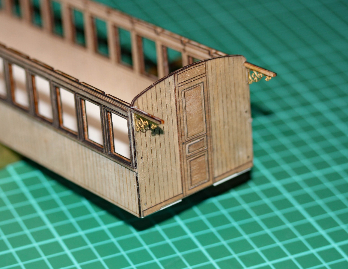 Après avoir copieusement gratté.....pour avoir un ajustage correct, les 4 côtés de la caisse ont été collé. Pour la prochaine voiture je pense réduire la face interne des extrémités due 2/10ème de mm de chaque coté, c'est plus facile à faire quand celles-ci ne sont pas assemblées. De même je nettoierai avec un forêt de l'épaisseur du laiton, les fentes servant à positionner les ferronneries qui soutiennent le toit au dessus des plateforme