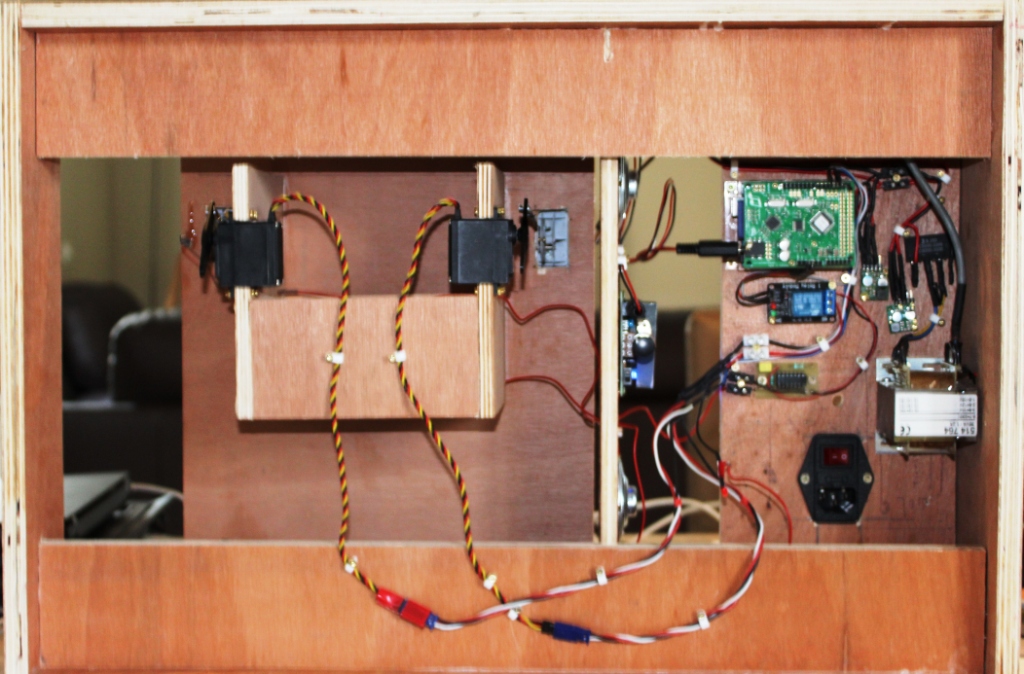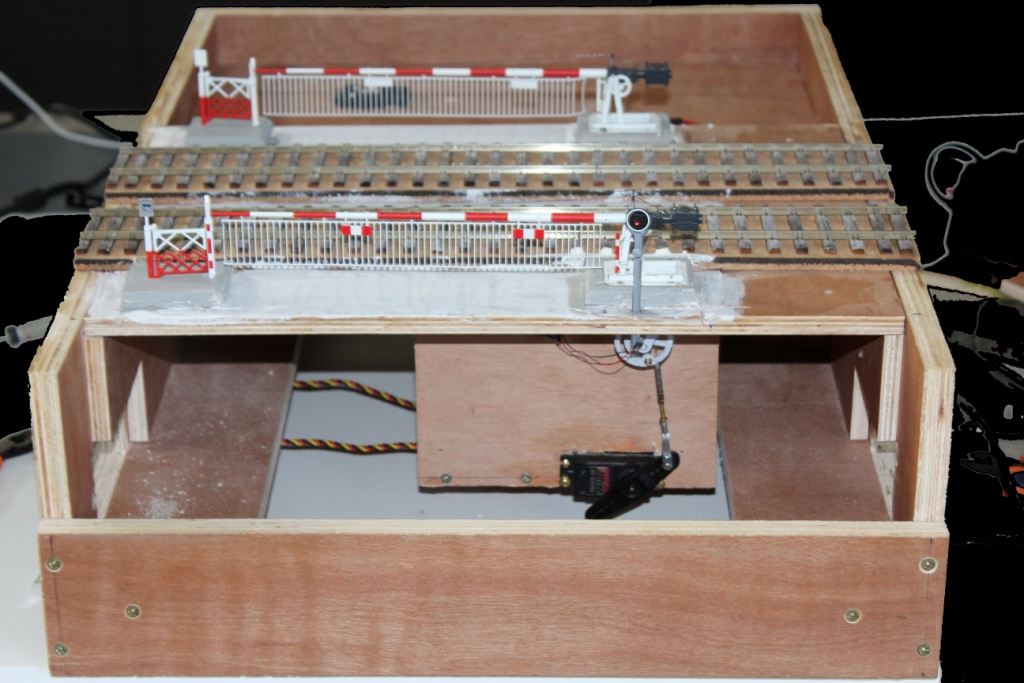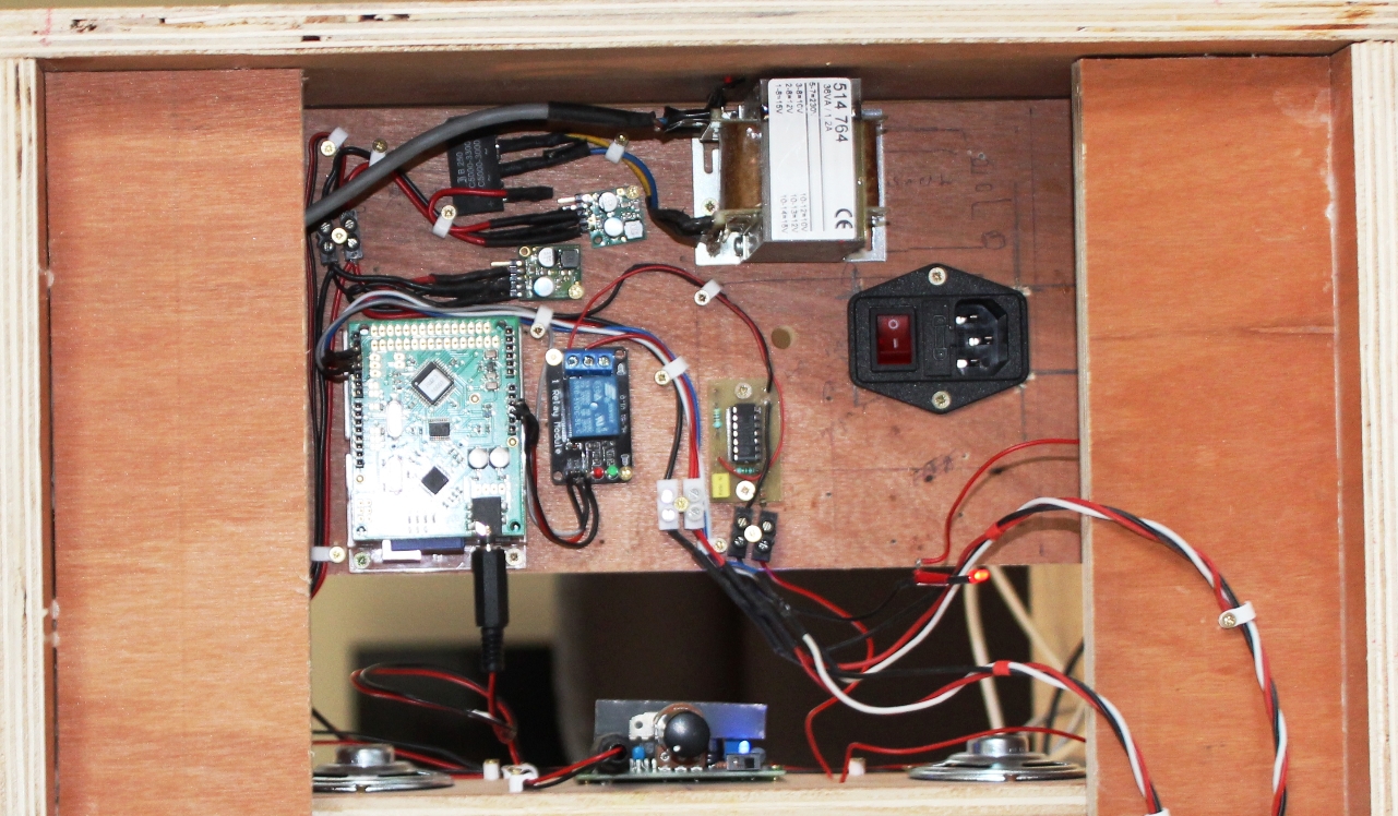 La planchette, horizontale lorsque le module est en position d’exploitation, qui supporte l’électronique est équipée d’un transfo 220/240v en entrée et 14v AC en sortie, une diode redresseuse fournit du 15v CC (nul en électronique ne me demandez pas pourquoi la tension en sortie est supérieure à celle d’entrée). Deux régulateurs de 12v et 5v vont se charger de délivrer les 2 tensions régulées nécessaires aux différents éléments actifs : du 5v CC pour les servomoteurs (commande des barrières) et le module des clignotants (feux de signalisation routière) et du 12v CC alimentera le microcontrôleur Arduino Uno (qui gère tout le séquencement : détection de présence/allumage des feux rouges, clignotants et annonce sonore/abaissement des barrières/arrêt de la cloche/détection de "non" présence/extinction des feux /relevage des barrières). Ce microcontrôleur est peu visible sur la photo puisque coiffé d’un "shield", lecteur MP3 ("jouant" le son de cloche d’annonce) cette tension est également distribuée à un amplificateur (le lecteur MP3 proposant nativement un volume sonore trop faible). L’amplificateur est implanté entre les 2 HP disposés sur l’autre planchette, verticale lorsque le module est en position d’exploitation. Un potentiomètre permet d’en régler le volume (pratique pour ne pas gêner les voisins (d’expo ?) ou, à l’inverse, attirer l’attention.