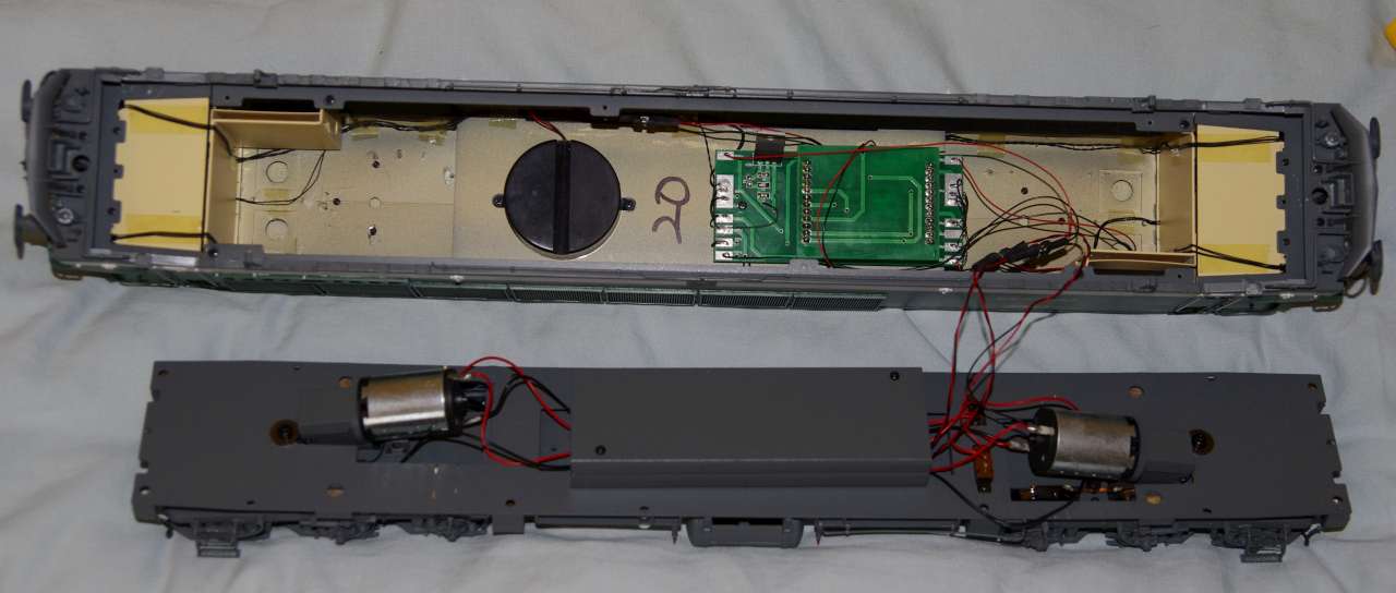 En effet entre temps les décodeurs ont évolué et les "nouveaux" (ils ont déjà plusieurs années) décodeurs ne peuvent aller sur la platine installée. Il va donc falloir supprimer cette platine, repérer les fils des ampoules avant-arrière, éclairage de cabines av-ar , moteurs 1 et 2 (dans le bon sens) et tout recabler sur le décodeur. Et l'ancienne platine va à la poubelle. Michel Hugon compte une dizaine d'heures pour digitaliser cette machine. (démontage, recablage installation du décodeur, programmation, remontage). Compte le double et tu seras dans les clous...