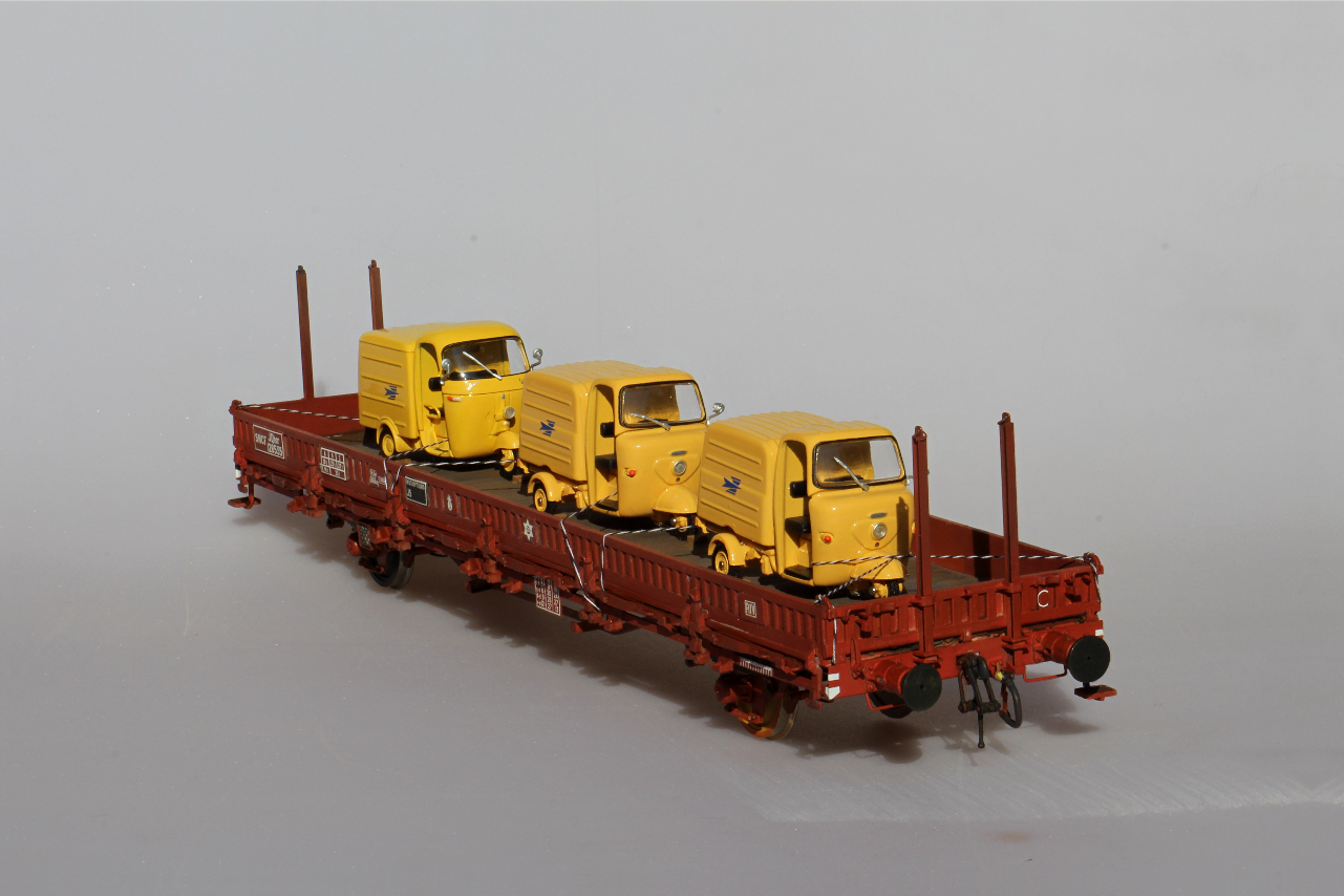 Les 2 premiers triporteurs sont des Lambretta FLI de 1965, le troisième un Vespa AC4T de 1963, tous issus de la collection Musée de La Poste / Universal Hobbies, donc 100% plausibles sur un wagon en marquage pré-UIC... :applause1: