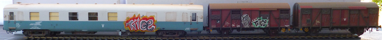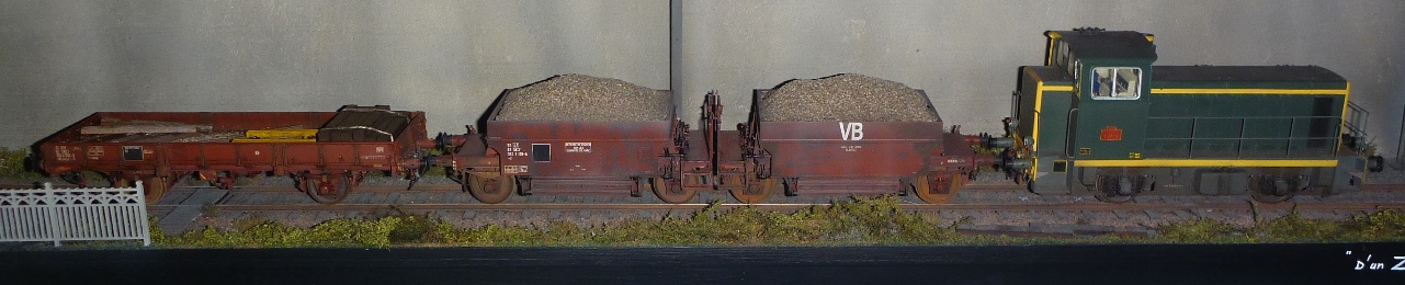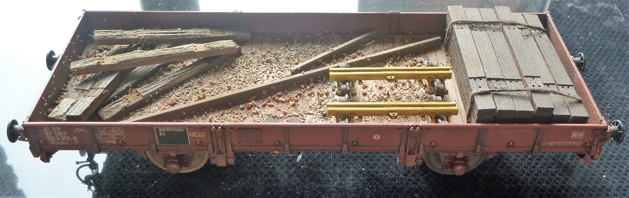 Les wagons plats sont l'idéal pour réaliser divers chargements : cela habille la rame et attire l'œil lors des circulations. Ici, sont mis en scène des lorrys SEMBLAT, des traverses DECAPOD, 2 coupons de rails PECO et du ballast à granulométrie variable (N, HO et 0) pour simuler des gravats... :idea:
