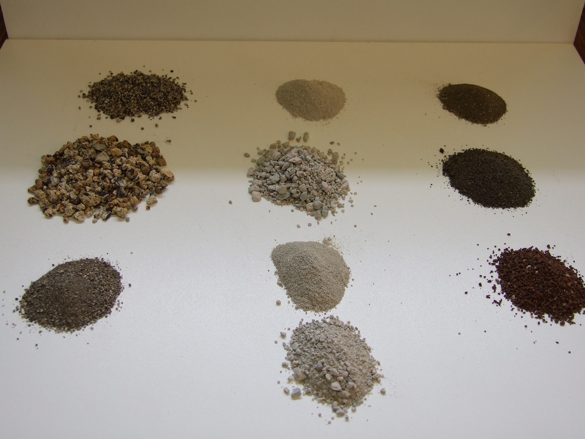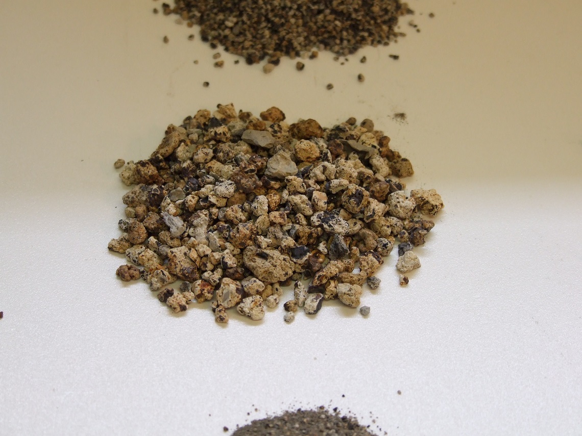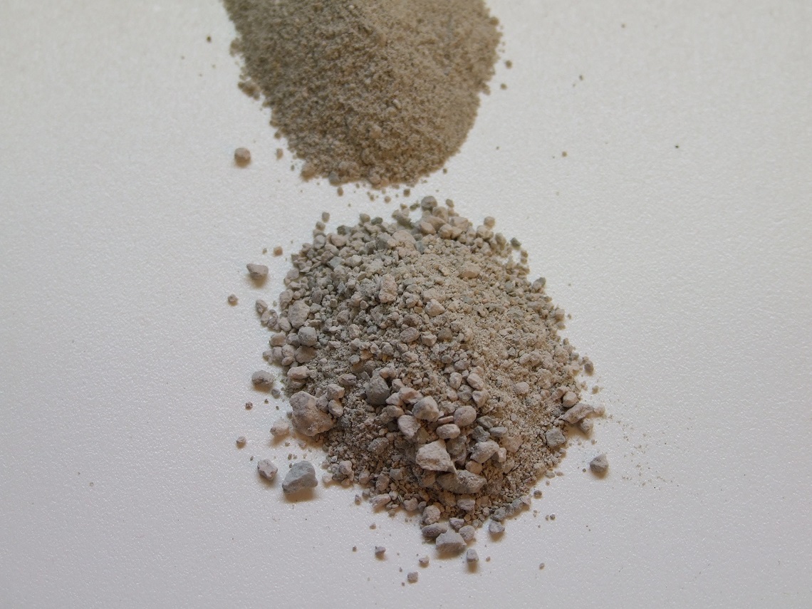 A droite en haut deux tas d'Aqualit finement broyé & calibré, le premier en haut a été mélangé avec un