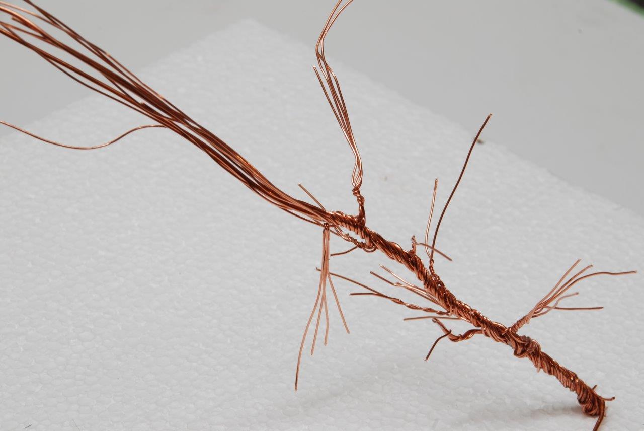 Avec une pince plate, elle toronne du cuivre et le colle avec de la colle cyanoacrylate