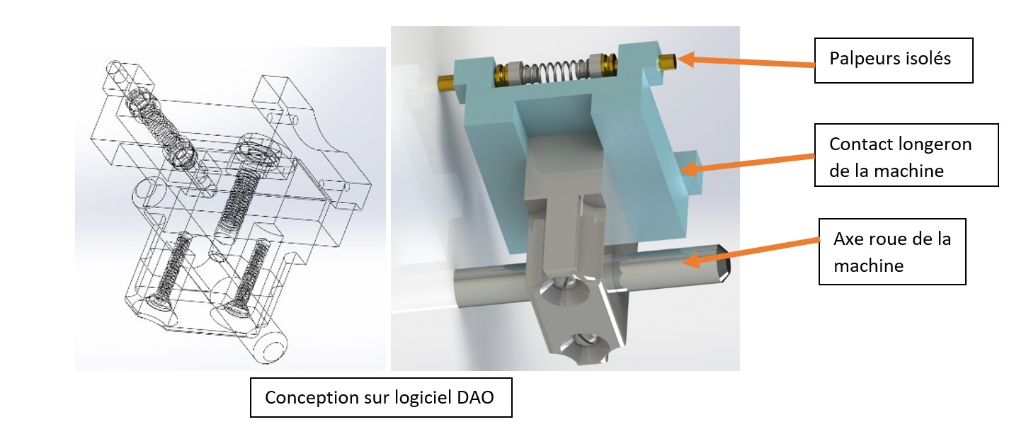 La prise d’origine du courant de cette machine n’étant pas adaptée au Digital DCC. Il a été décidé de créer des nouveaux palpeurs. Les roues motrices (entre autre) étant isolées. Un modèle a été conçu afin de s’adapter à la machine tout en restant le plus discret possible. Les palpeurs devant suivre les mouvements verticaux et les lacets des roues