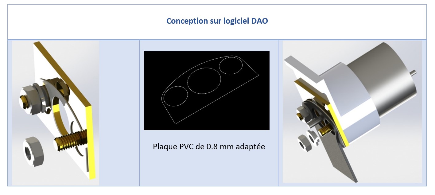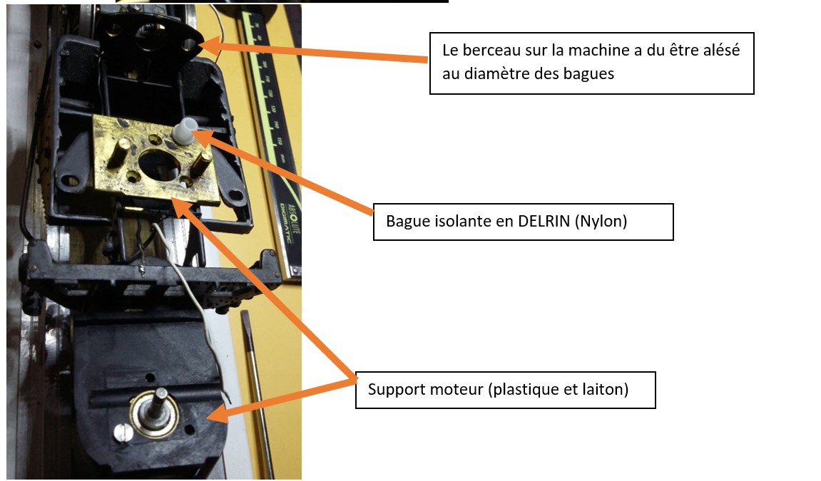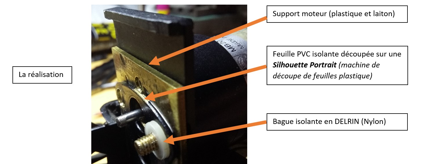 Un montage avec 2 bagues isolantes (principe de l’isolation des roues de wagon) et une plaque de PVC adaptée vont assurer cette isolation.