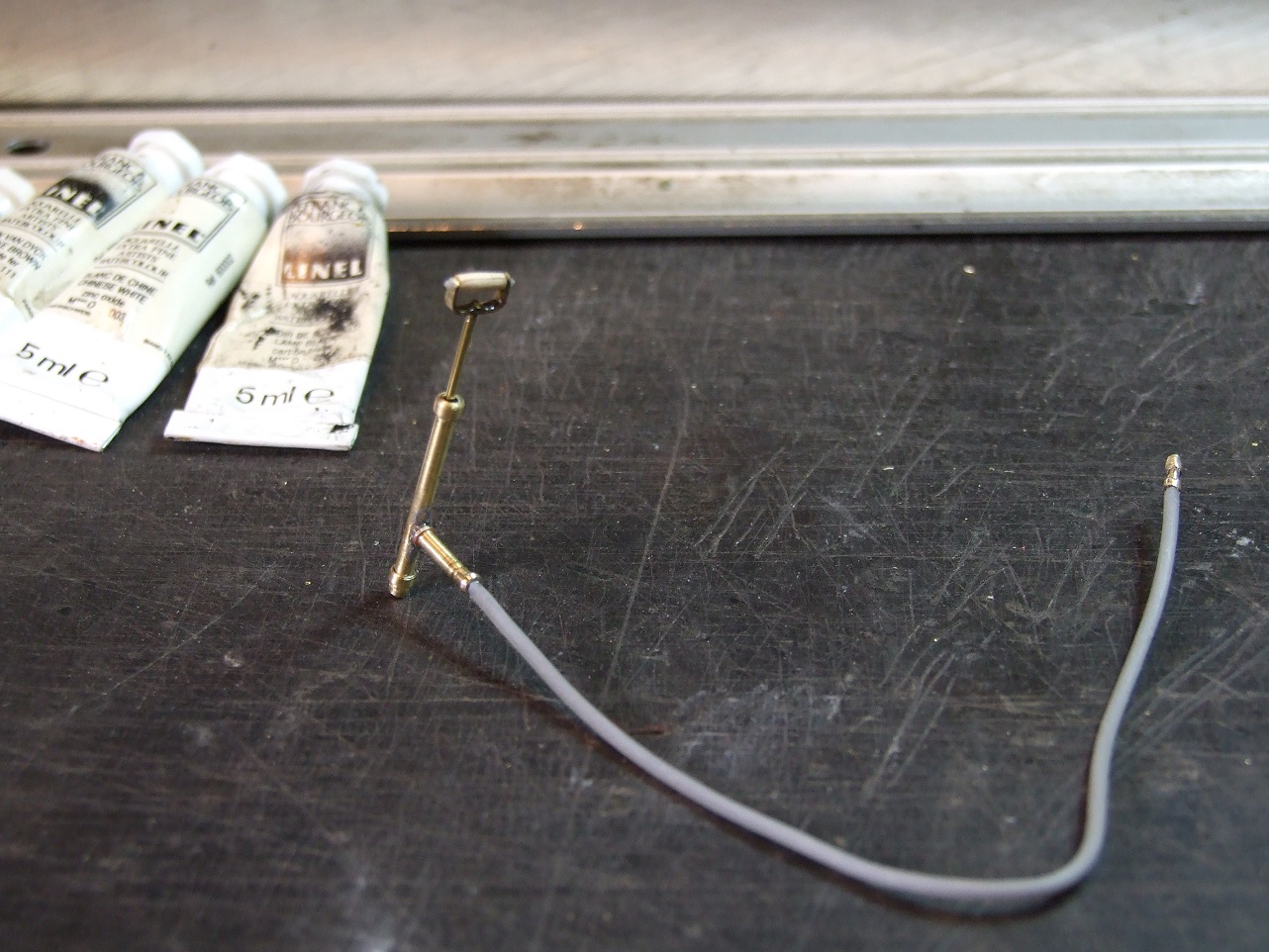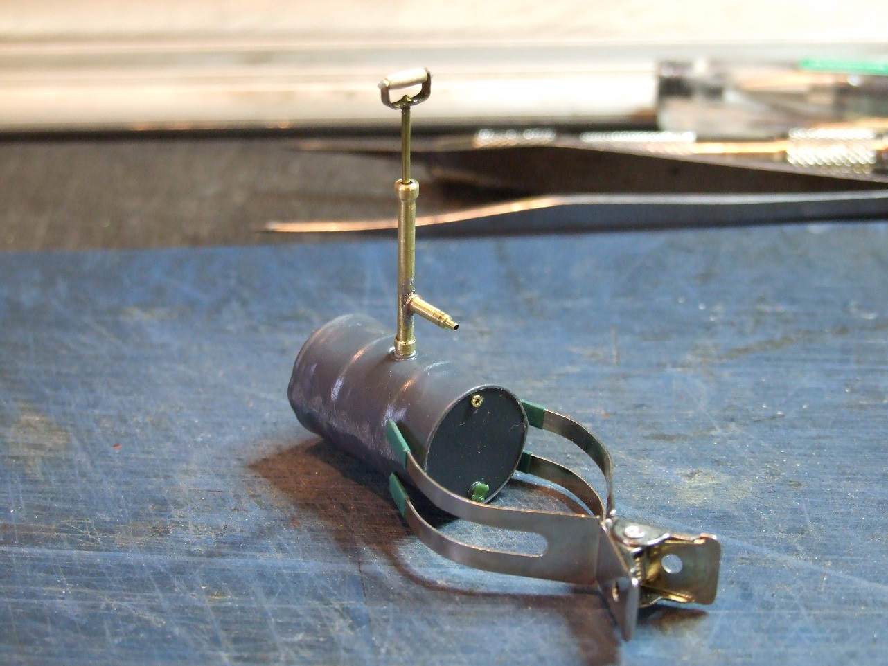 Quant à la pompe à bras, celle-ci pour le corps principal, a été débitée dans un tube de laiton de 2mm extérieur & de 1mm intérieur. Deux bagues en laiton de 3mm extérieur ont été tournées, puis soudées à sa base & au sommet. Le bras de la pompe est un petit tube de laiton de 1mm extérieur & de 0,8mm intérieur. La poignée est une petite bandelette de laiton de 2,2 de large x 8mm de long ; celle-ci a été percée de trois trous : un au milieu & les deux autres à chaque extrémité. Puis après perçage, cette bandelette a été recuite sur mon labo gaz & mise en forme d'un U. Sa poignée a été tournée dans un pic à cocktail, contrairement à celle de Marcel qui avait mis une poignée en métal. Je trouve que cette poignée en bois, apporte un peu plus de chaleur à cette pompe tout métal.