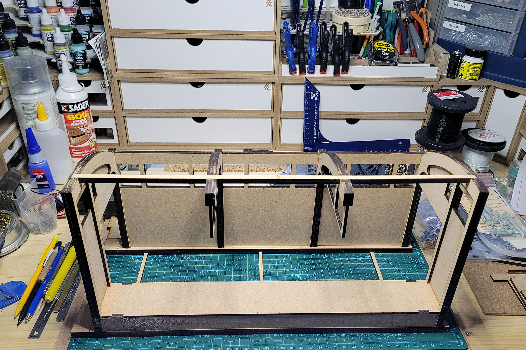Et voici donc le prototype en cours de montage de la version faible profondeur. L'axe de voie est à 97mm du fond ou du bord du réseau. Placé au bord du réseau, cette configuration permettra de pouvoir découvrir l'intérieur du batiment.