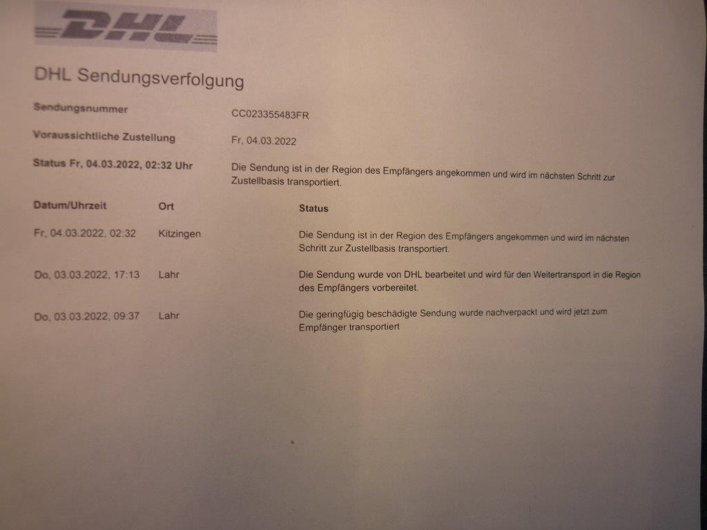 Pour ceux qui lisent l'allemand voir le suivi qui indique que le colis "légèrement" endommagé a été réparé.