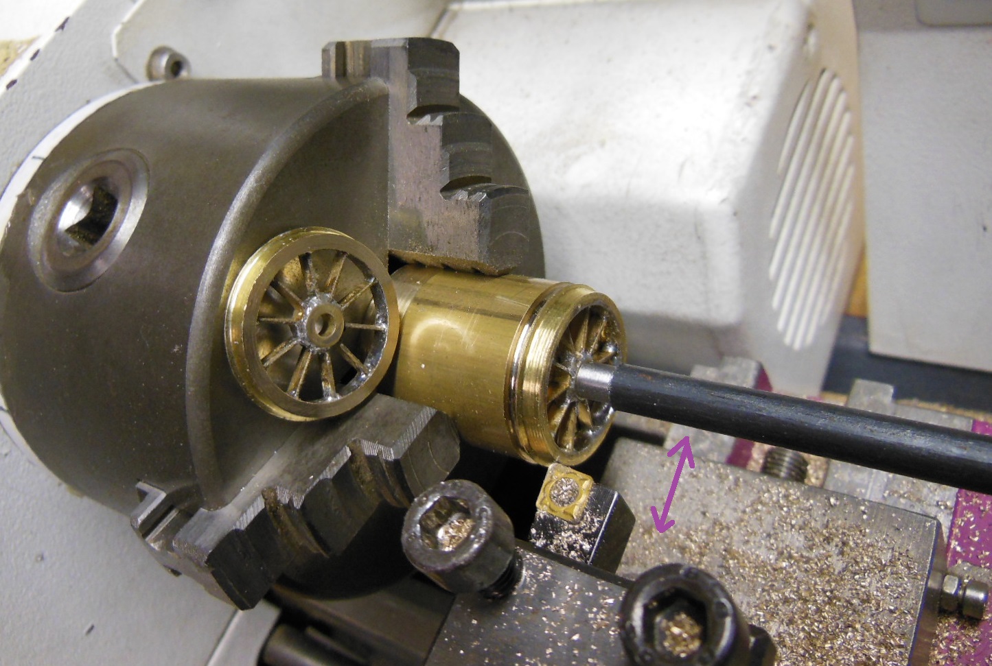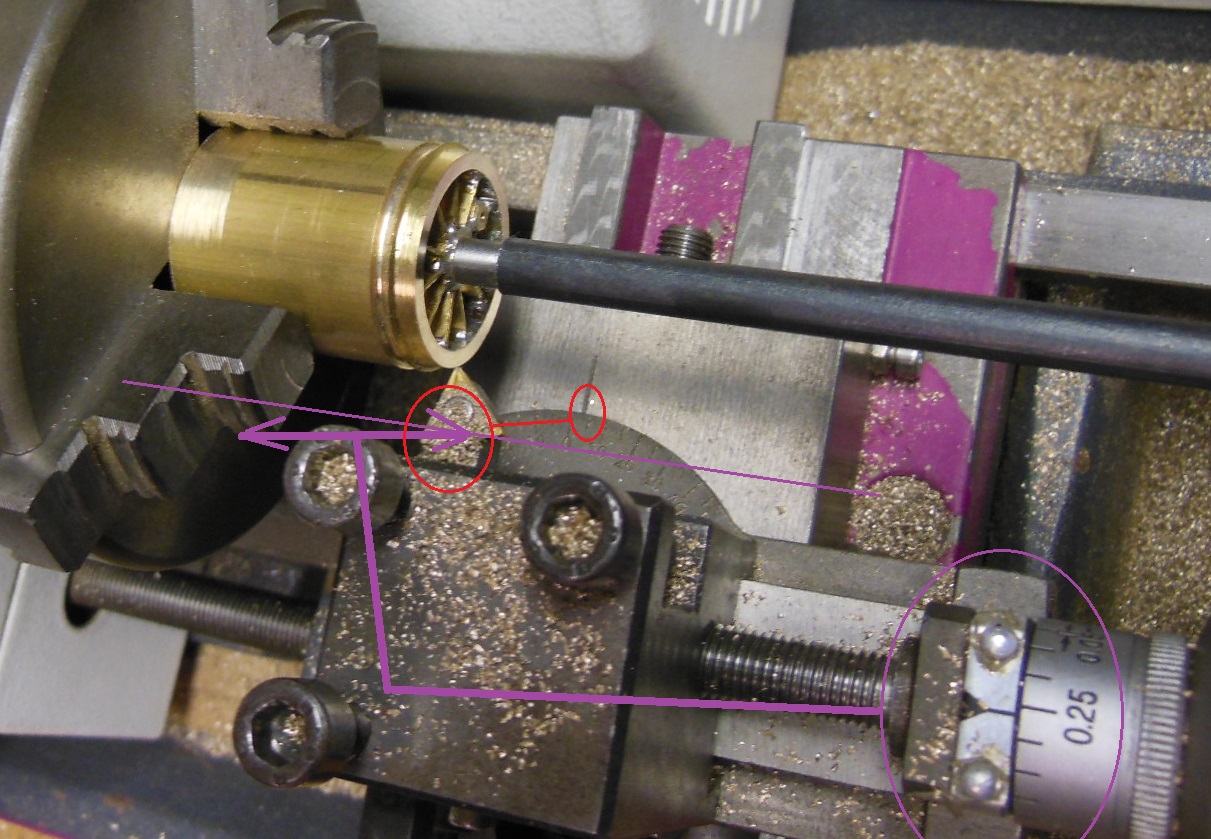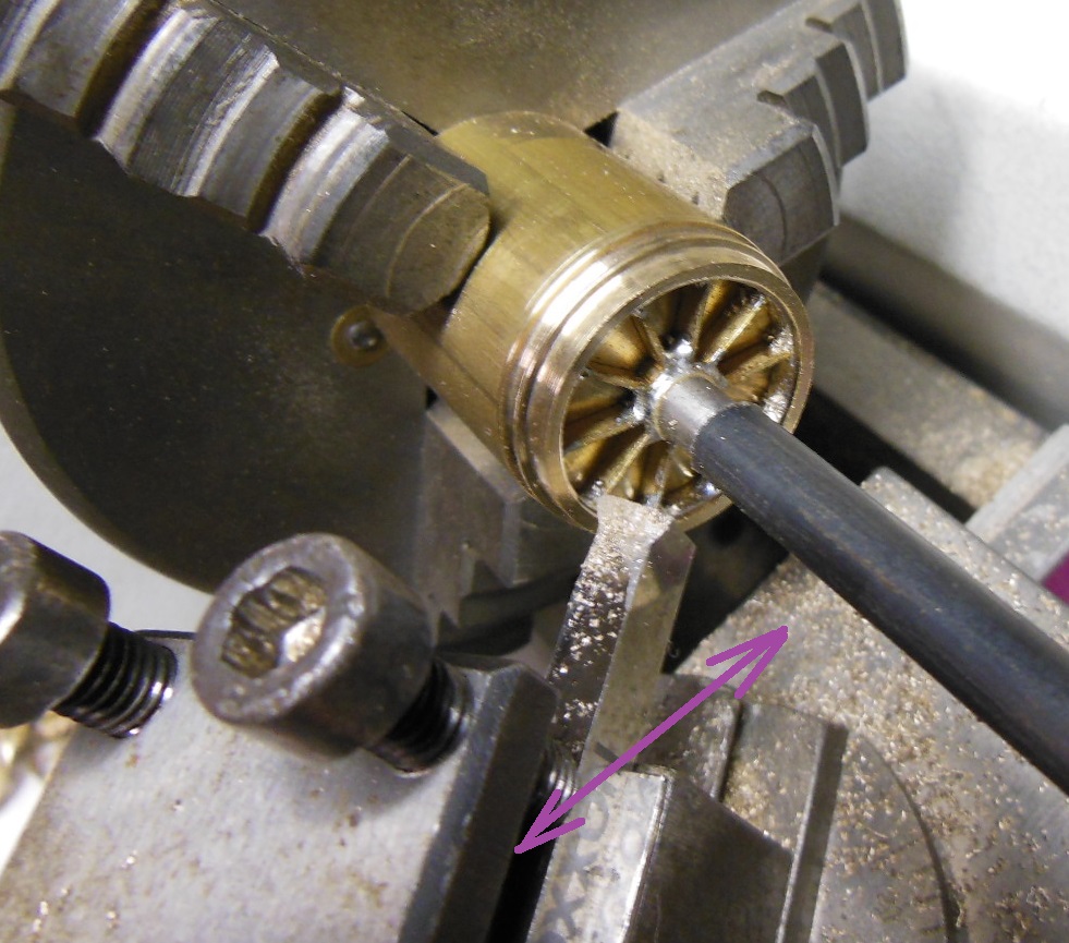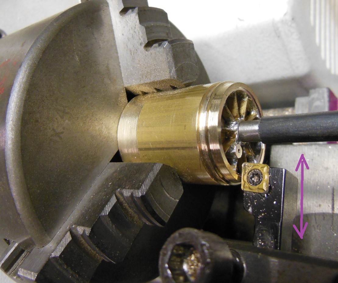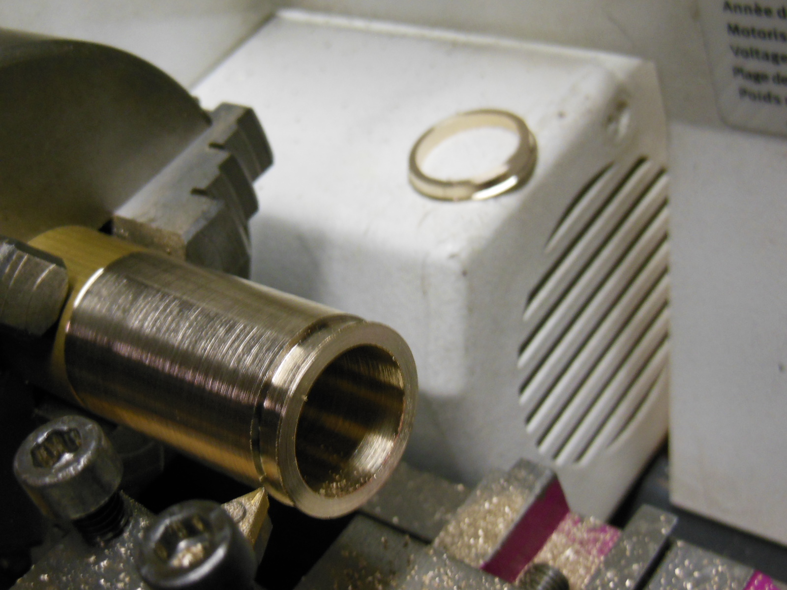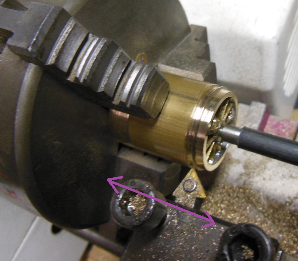 Les bandages sont tirés d'un tube laiton. Dans cette phase l'important est l'arrière du bandage qui sert de base d'appui, le diamètre interne qui ne sera plus retouchable, et le diamètre externe qui doit entrer sans jeu dans la forme de montage. Le reste est simplement dégrossi pour ne nécessiter qu'une passe lors de la rectification.