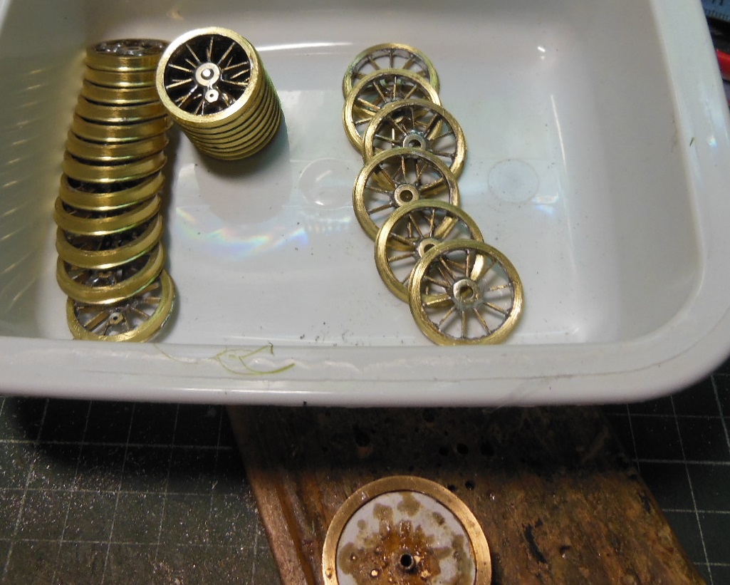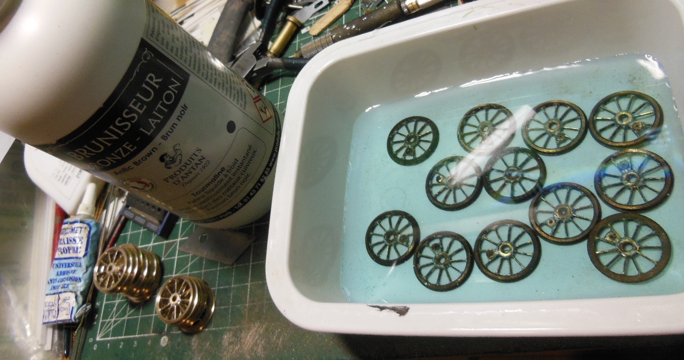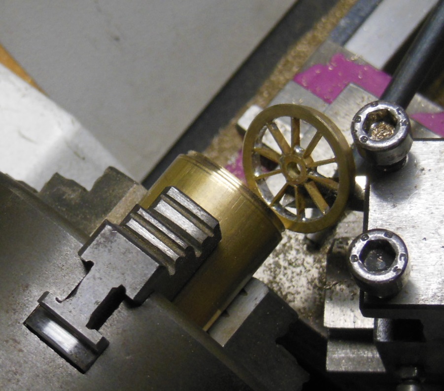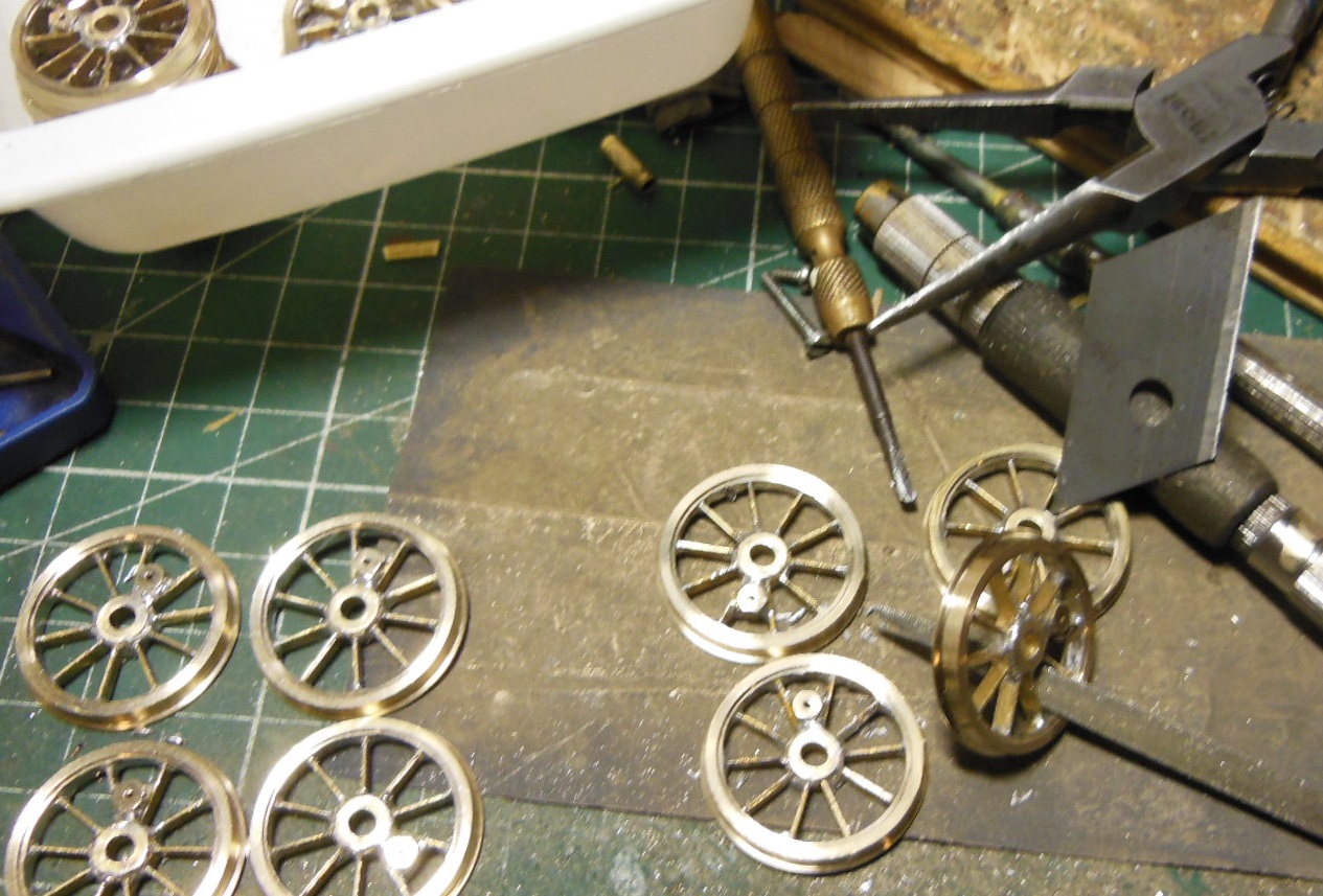 Des bandes de laiton sont découpées pour les rayons. Pour rentabiliser l'outil de reprise qui sera nécessaire, il y a deux autres trains de roues en fabrication.