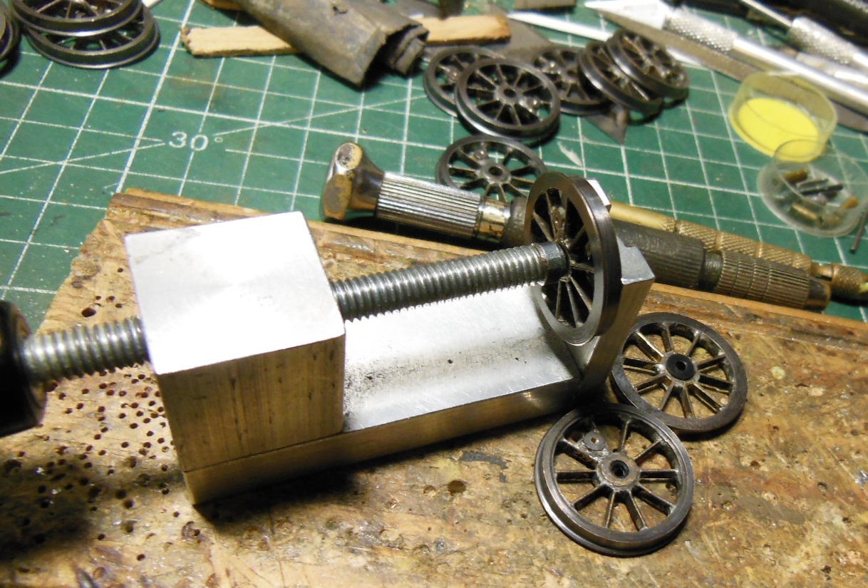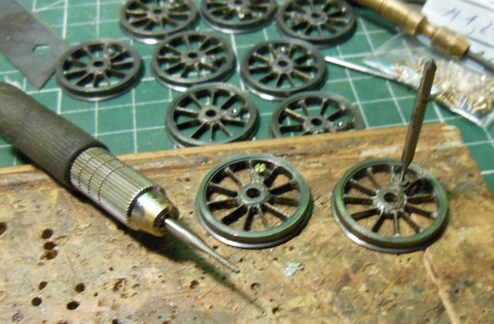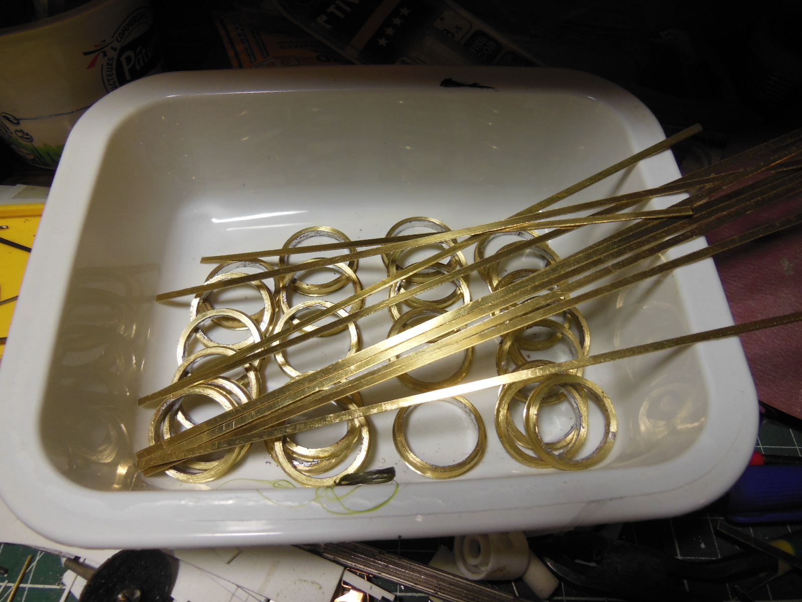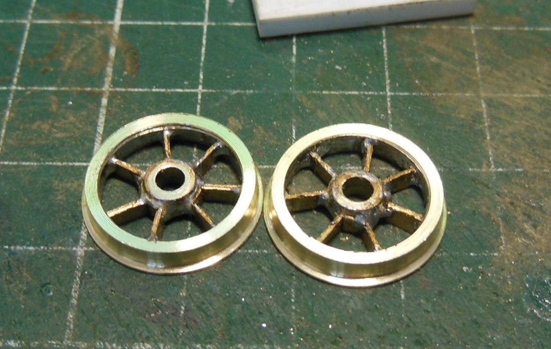 Des bandes de laiton sont découpées pour les rayons. Pour rentabiliser l'outil de reprise qui sera nécessaire, il y a deux autres trains de roues en fabrication.