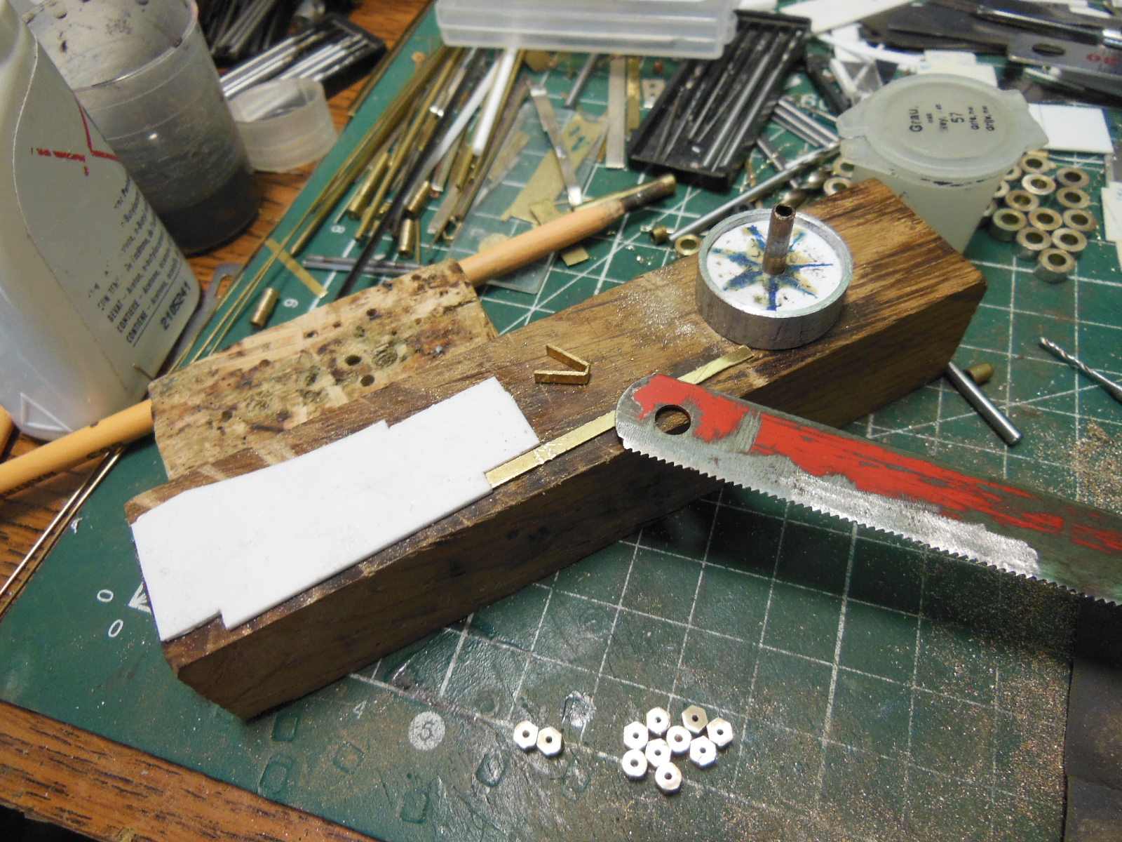 Un petit gabarit permet de marquer les pliages des rayons avec une lame de scie sans voie ainsi que la coupe. Sur le bout de bois la forme des roues du bissel. Les manetons sont en bas sur la photo.