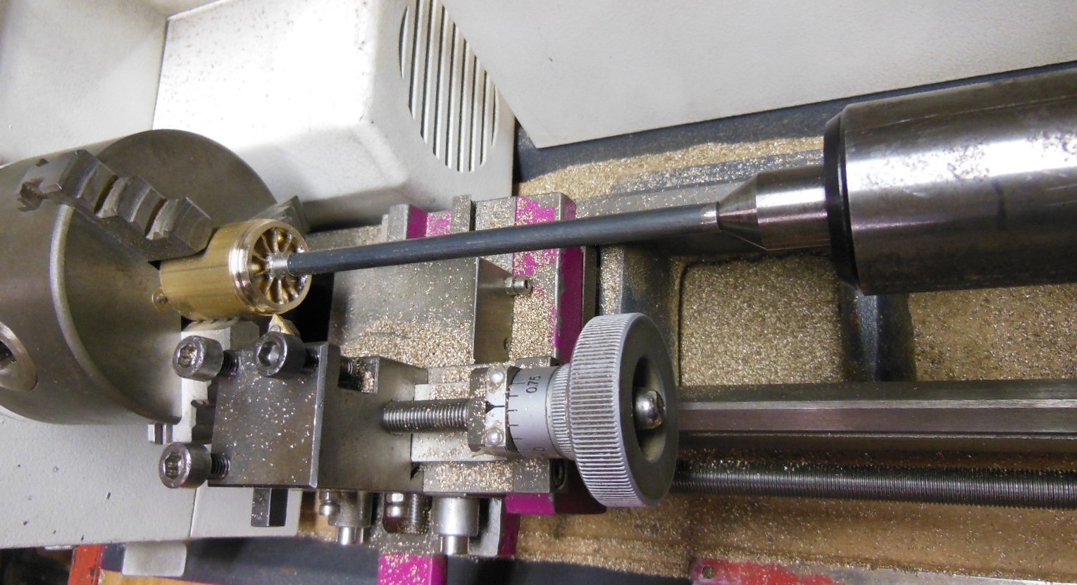 Il est temps de réaliser les outils de reprises, d'abord une rallonge de serrage en ferraille avec un petit épaulement côté moyeu, et un trou coté pointe tournante. Puis le berceau de roue dans le mandrin, avec un dégagement d'un demi bandage et un téton légèrement serrant pour les moyeux au centre. Celui ci ne sera plus touché jusqu'à la fin.