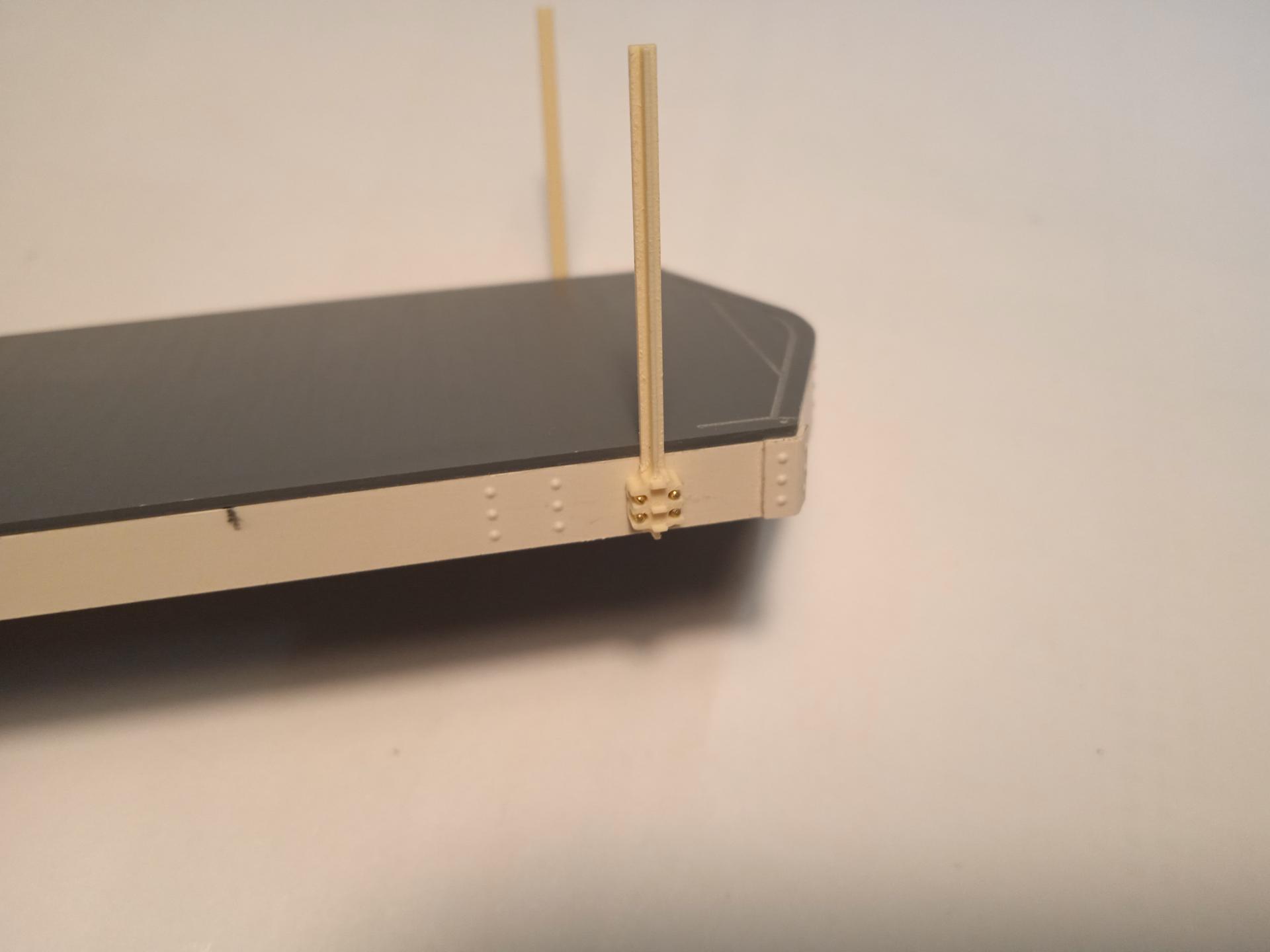 Même principe que pour les ridelles, il faut préparer pour chaque arrêt 2 petits morceaux de tube laiton de 0.5mm pour la fixation et simuler les rivets.