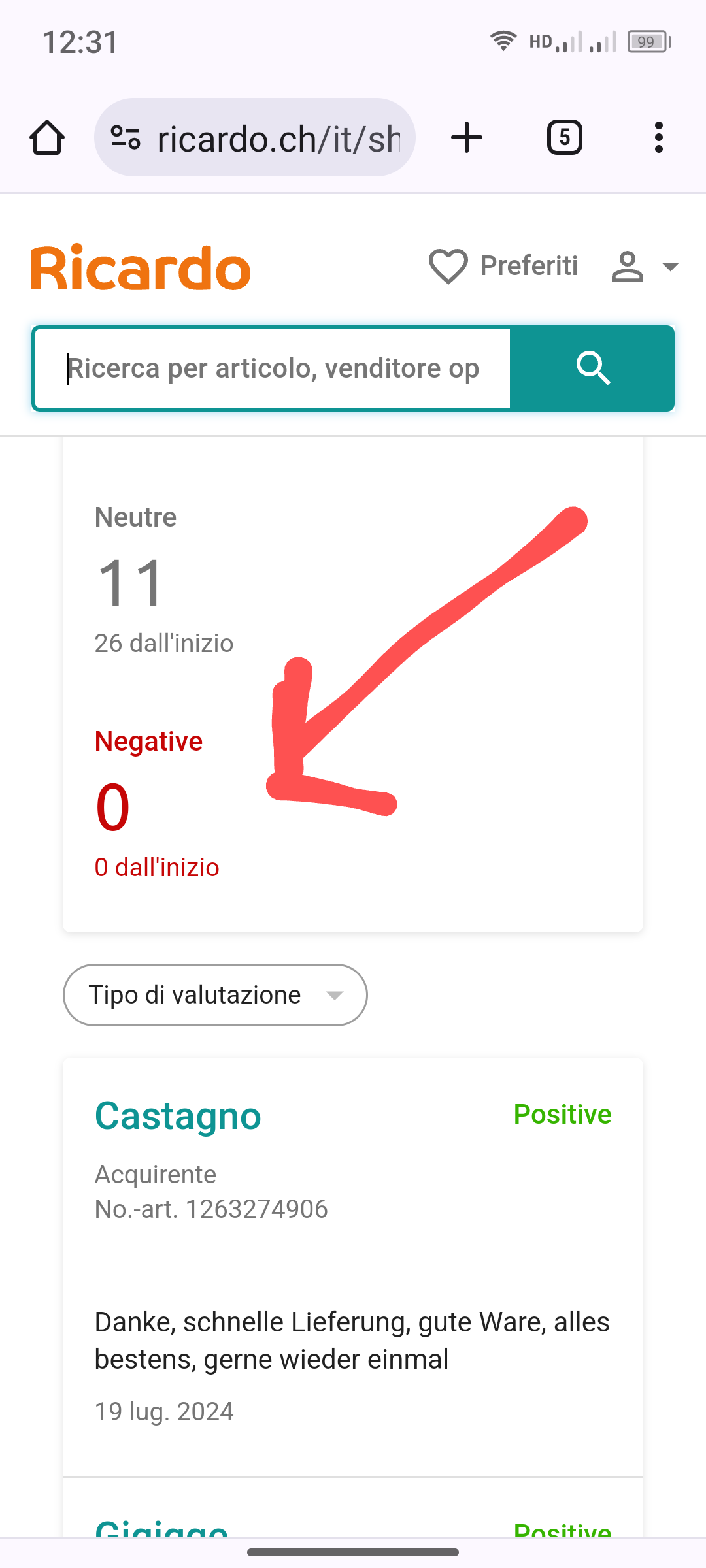 okt8488 Je parle de zéro assistance acheteur de la part de Ricardo, d'un achat qui n'est jamais arrivé, et d'un vendeur grossier qui fait du chantage en vous demandant de supprimer les commentaires négatifs, et de Ricardo qui supprime tous les commentaires négatifs. Même dans d'autres pays, les gens n'aiment pas se faire arnaquer, et pas seulement en Suisse. mais je le répète, eBay n'enlève pas les commentaires négatifs même en payant ! c'est parce qu'il compte des millions d'utilisateurs et ne survit pas grâce à quelques vendeurs nationaux qui sont en fait aux commandes.