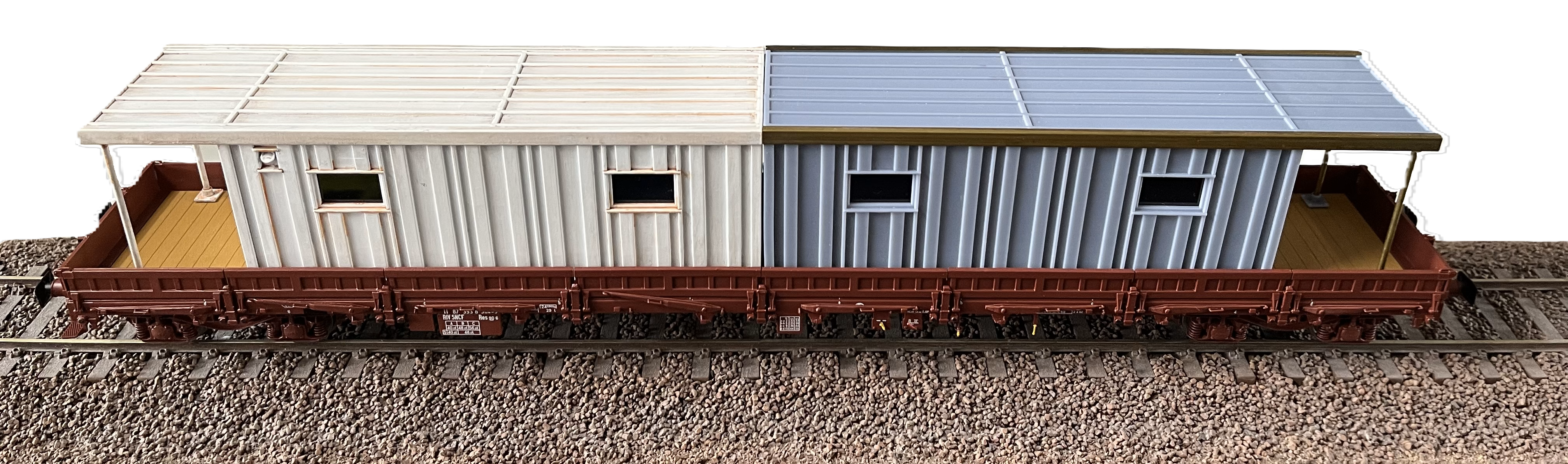 Le premier modèle est ce bungalow de chantier qui pourra équiper vos wagons plats (K50, Remms, etc.). Ces bungalows sont utilisés dans le cadre de la réalisation de chantiers. On les trouve sur des wagons plats (K50, L56, Remms, etc.) garés sur des voies de garage ou autre. Ce bungalow trouvera facilement sa place sur vos réseaux, vos dioramas ou posé sur un wagon exposé en vitrine.