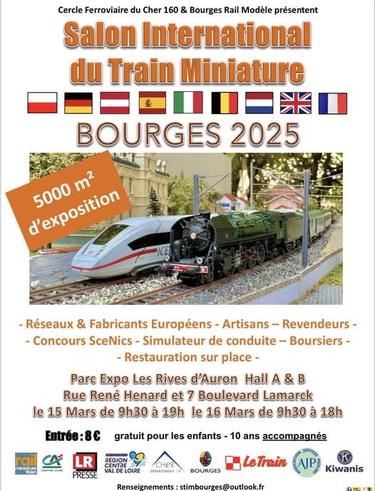 Voici la liste mise à jour des exposants qui seront présents au Salon International du Train Miniature de Bourges les 15 et 16 mars 2025 au Parc Expo Les Rives d’Auron dans les halls A, B et C sur finalement 5600 M2.