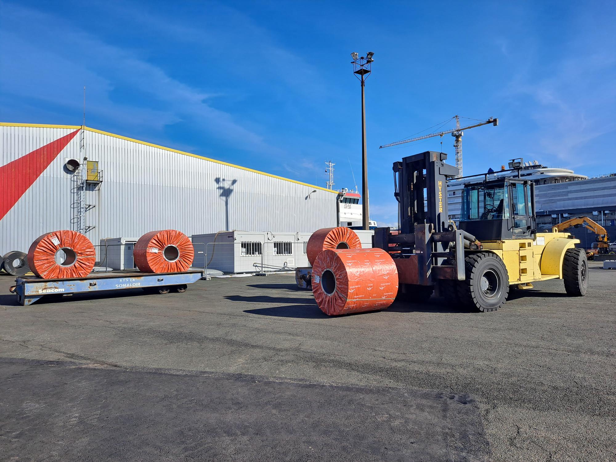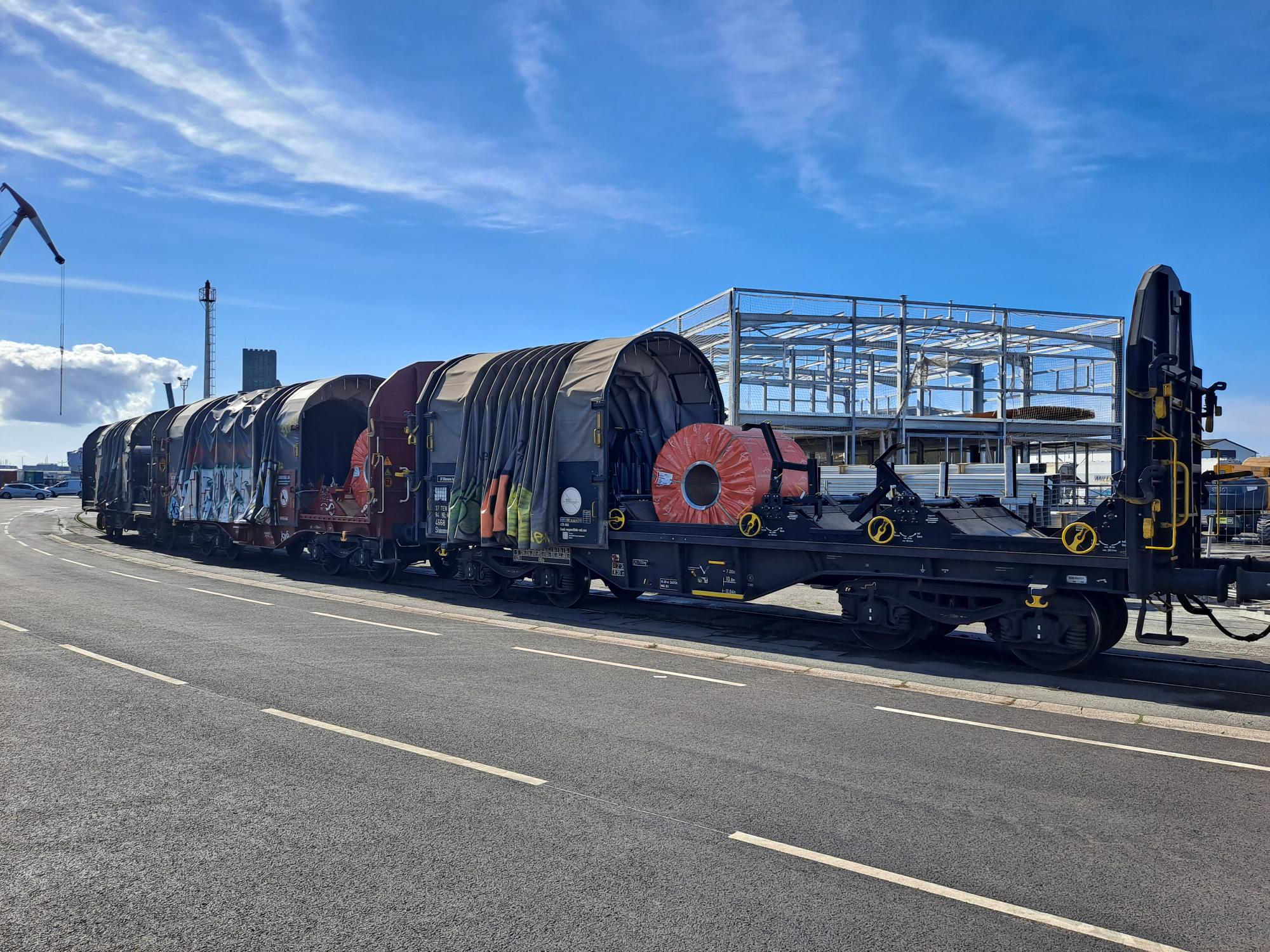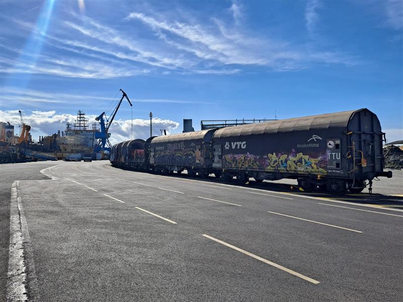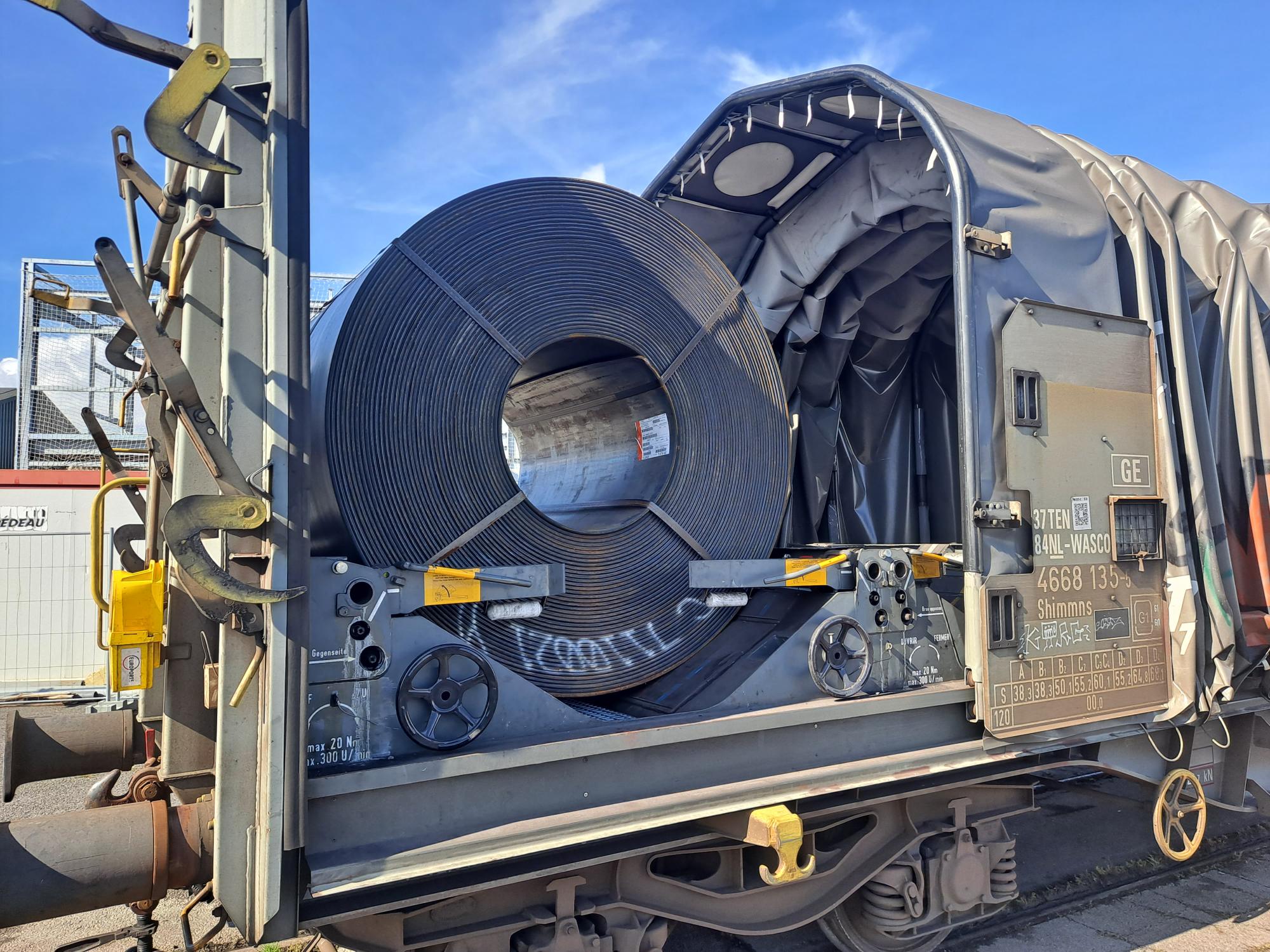 La voie d'accès directe à l'usine étant en réfection, le quai est utilisé comme voie de débord pour décharger les coils sur des roll pour finir le trajet vers l'usine ARCELOR.