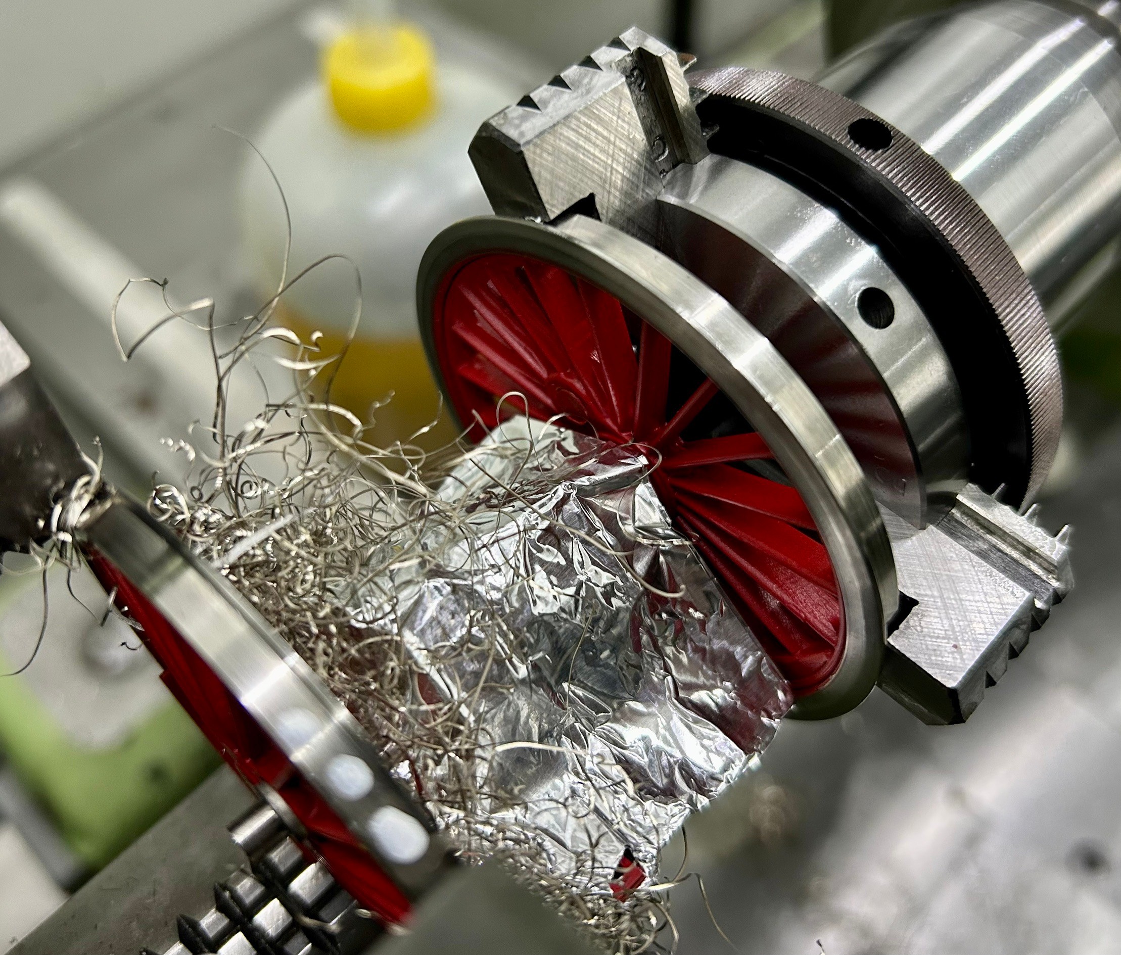 Il s'agit de la roue motrice, de 62,5 mm de diamètre. Je ne pouvais pas utiliser la découpe à l'huile car cela pourrait dissoudre la peinture rouge, j'ai donc choisi la découpe à sec. Même si j'ai soigneusement contrôlé les paramètres de coupe, j'ai quand même produit beaucoup de "Spirales Inox"