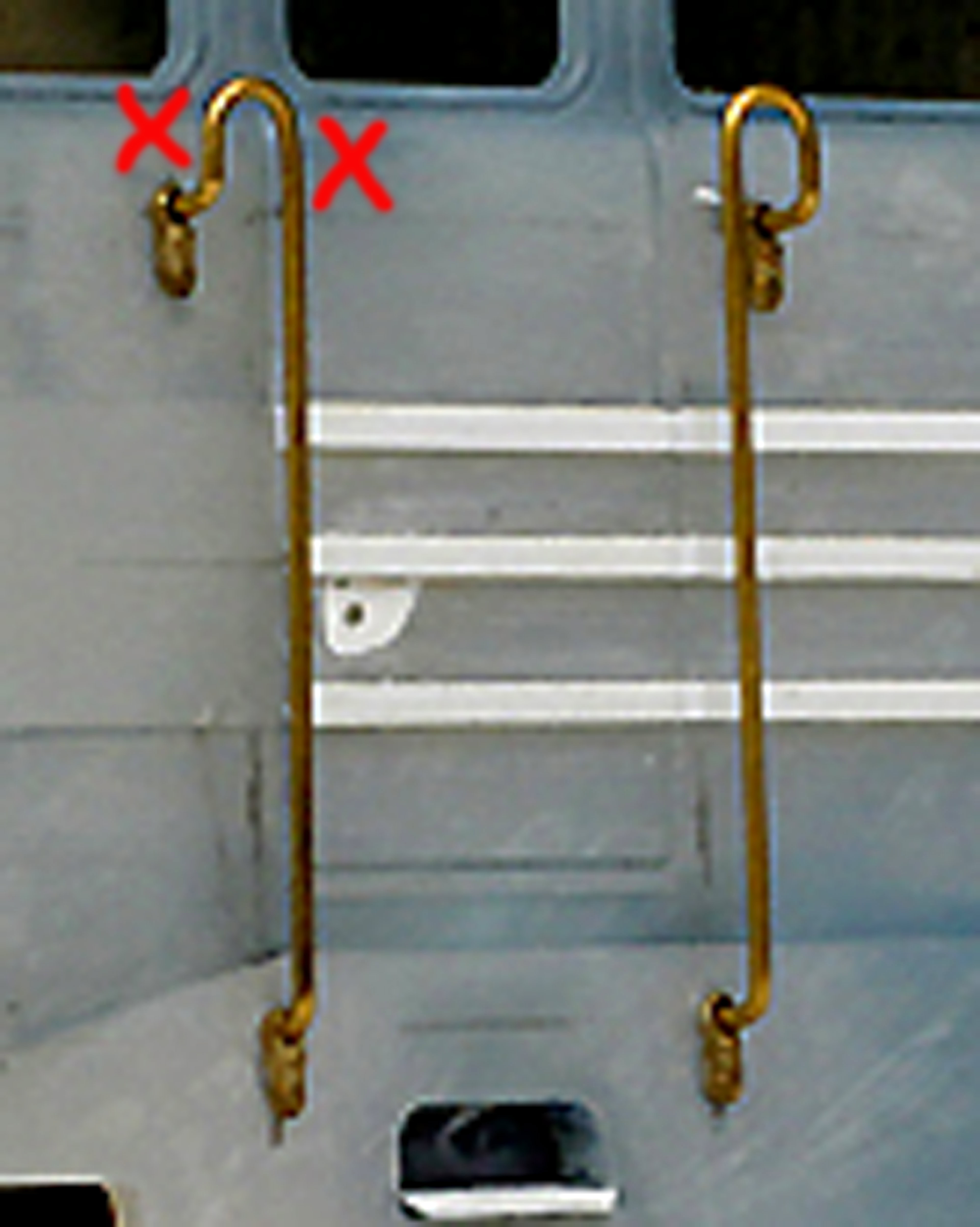 Pour réaliser cette dernière on peut utiliser une pince à bouts ronds mais, sur du laiton recuit, il y a un risque d'écrasement au serrage (X sur la photo). Pour ma part je fais plutôt appel à un tournevis ou à un clou du diamètre voulu.
