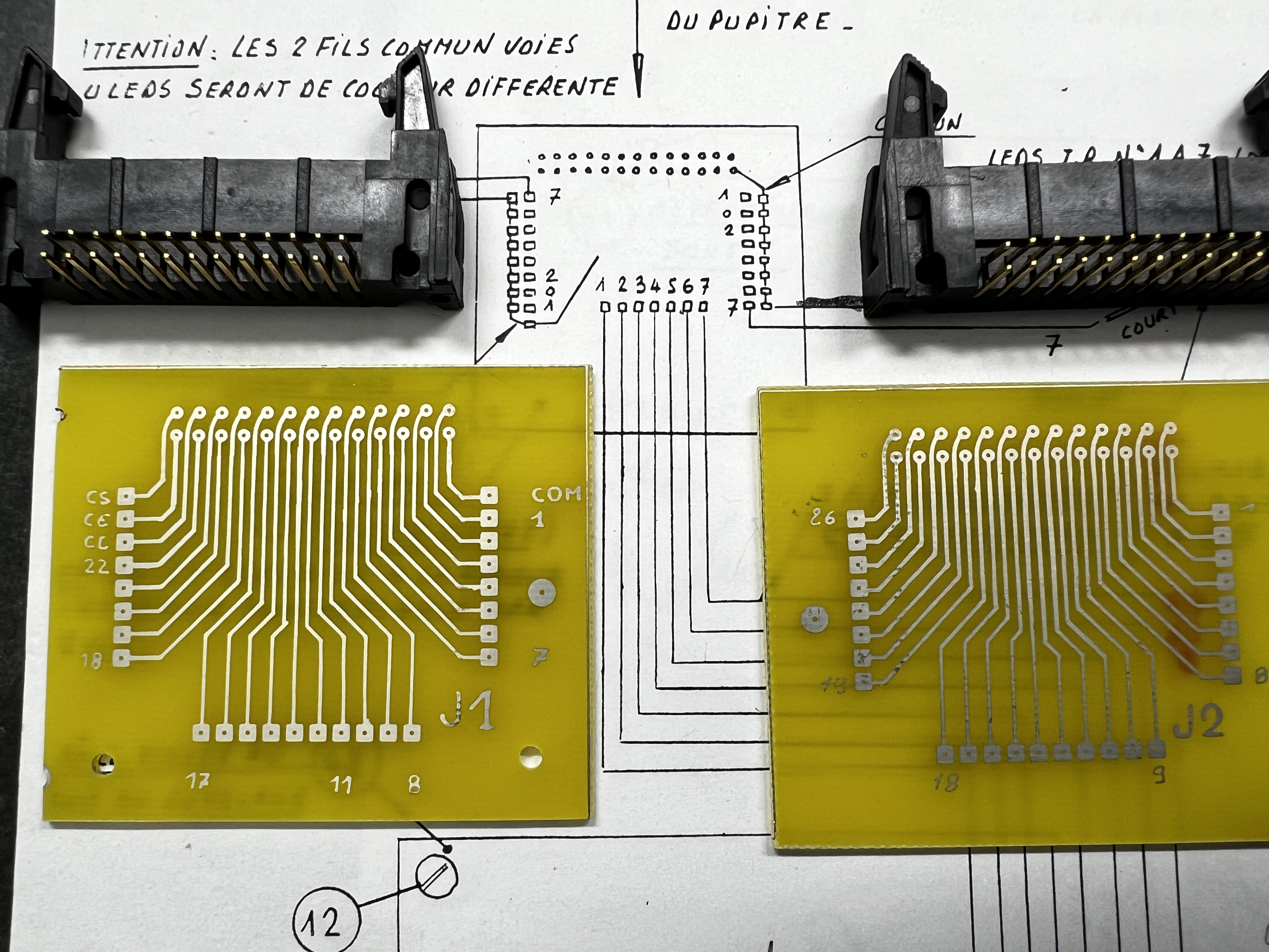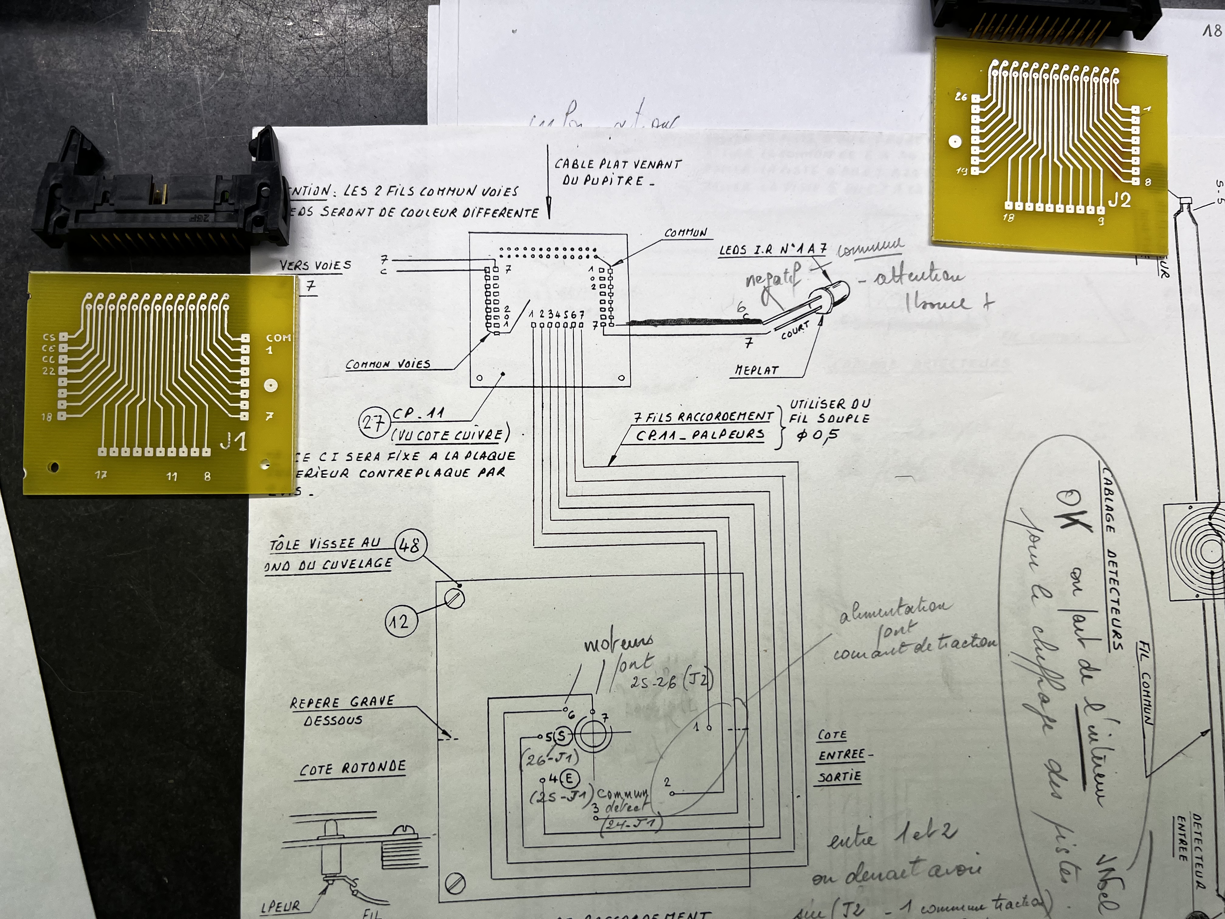 Ayant acheté à un particulier un kit de pont tournant JCR, je constate que les explications pour les câblages ne sont pas claires et manquent de précisions. Par exemple, il y a 7 fils qui arrivent du carré laiton des palpeurs vers le circuit imprimé (CI) J1 (ou J2, identique au J1 mais annoté différemment). Hors, il y a 8 entrées sur le CI pour ces 7 fils et il n'est pas indiqué celle qui doit rester libre ; celle de gauche ou celle de droite ? D'autre part, doit-on utiliser J1 seulement ou J1 et J2 ?